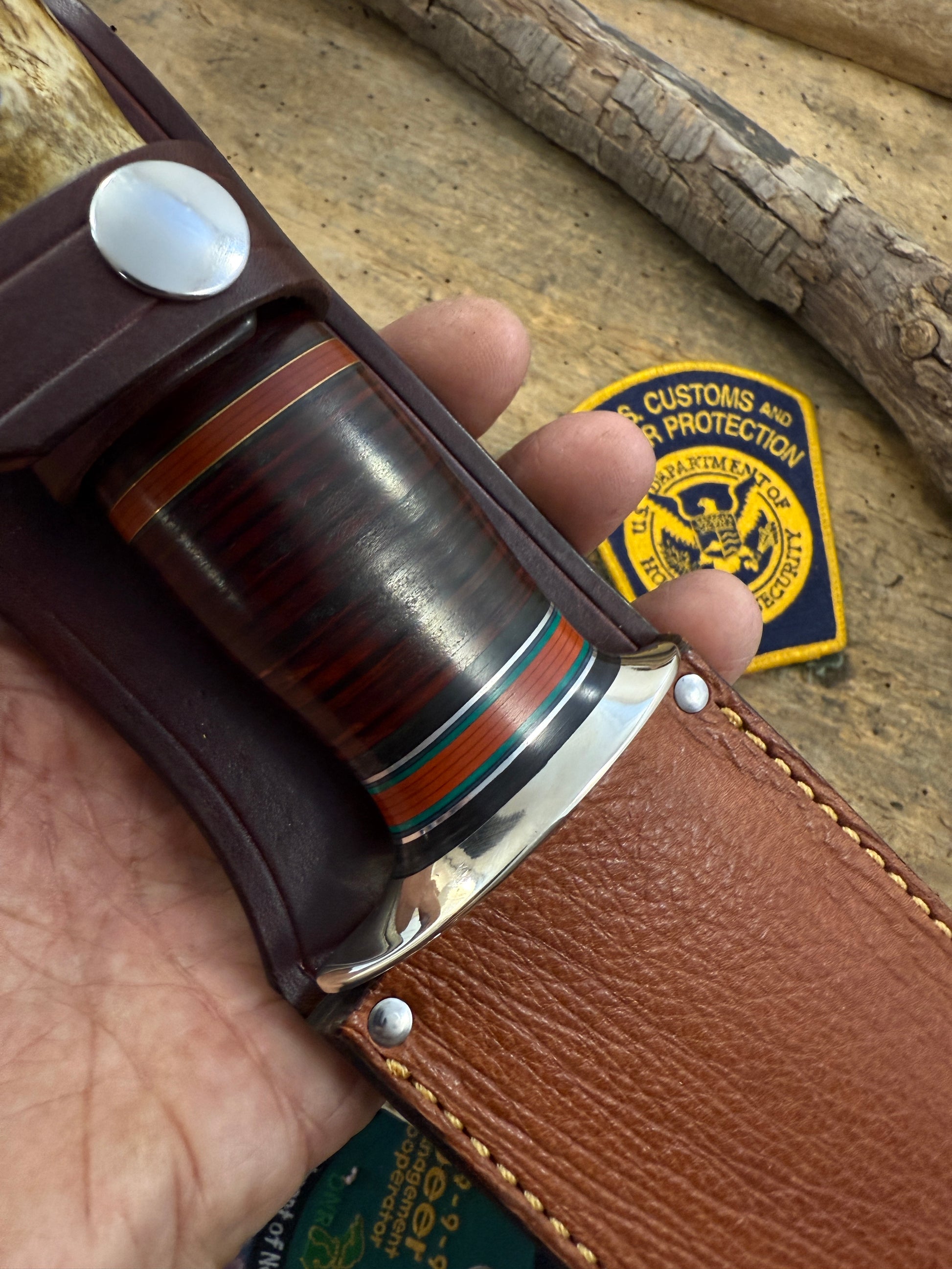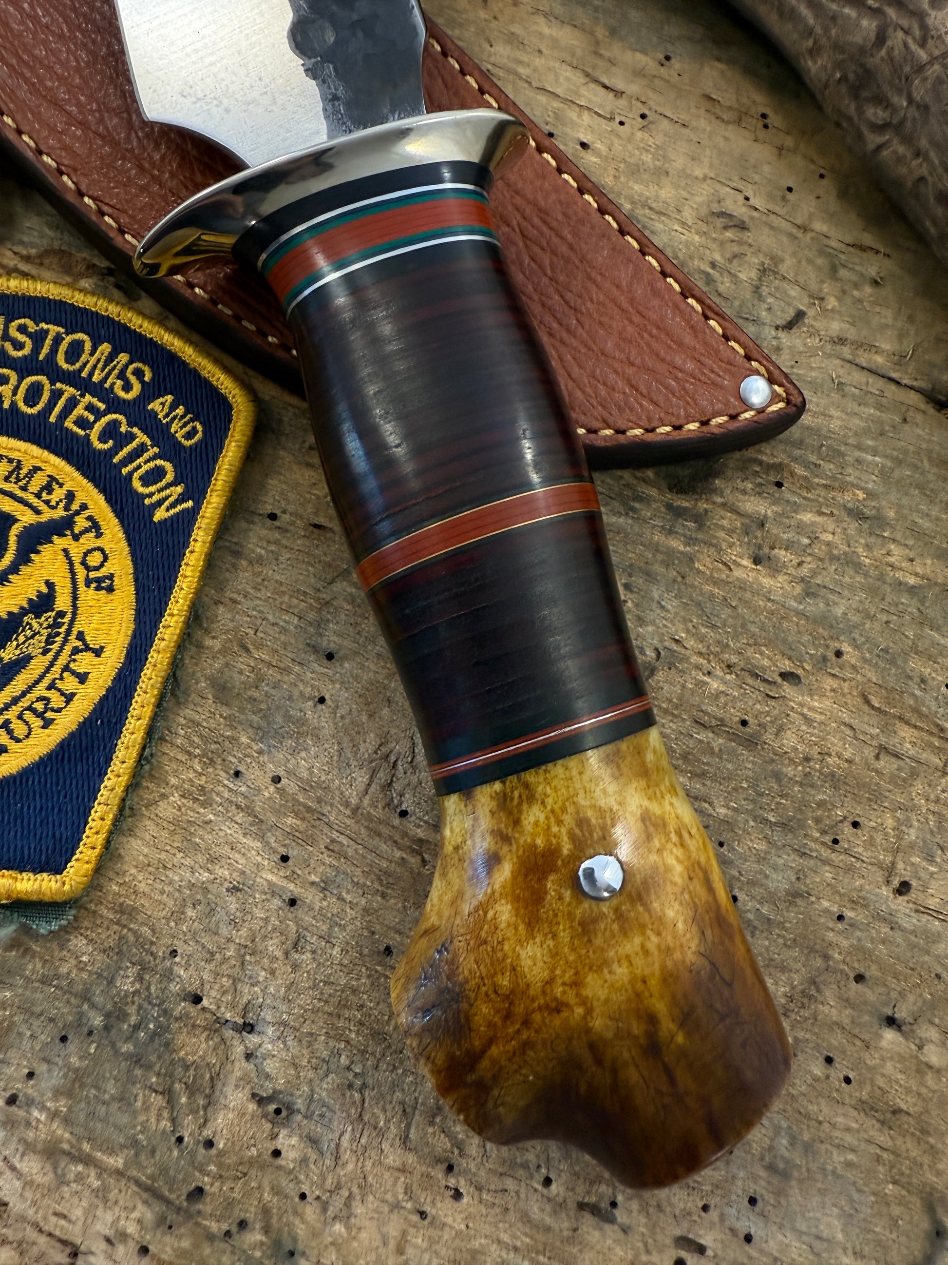 This is a big fat beast of a hunter/fighter and has a 6 3/4" hammer mark blade .250 thick forged blade. 1.900 wide. Hollow ground and sharp as hell. The guard is silver soldered nickel silver . The hidden tang handle has stacked horse hide with a pinned crotch stag butt. OAL is about 12 1/2". Sheath is shark . Ready to ship and priced to sell. Thanks, Jim TMK
