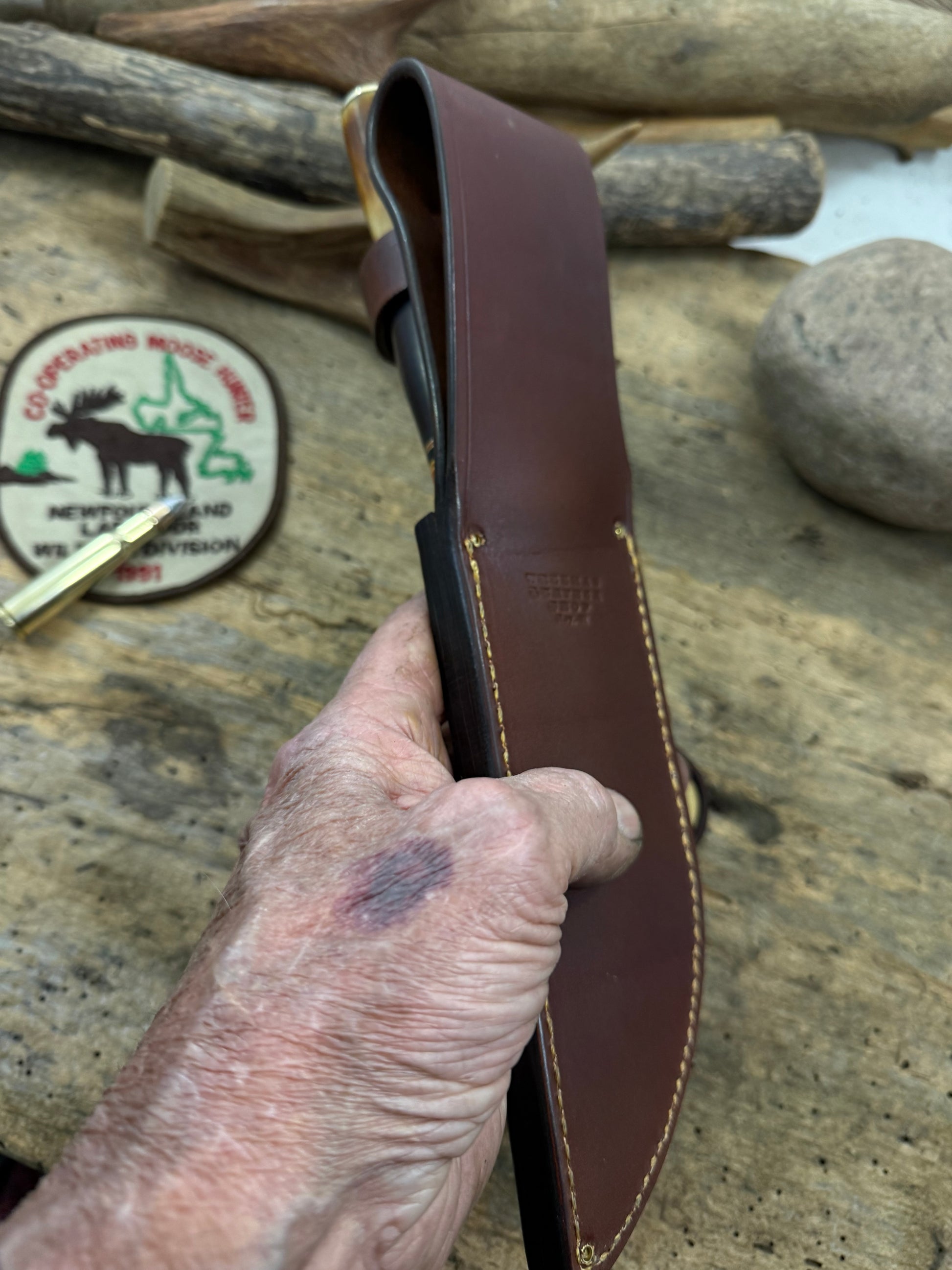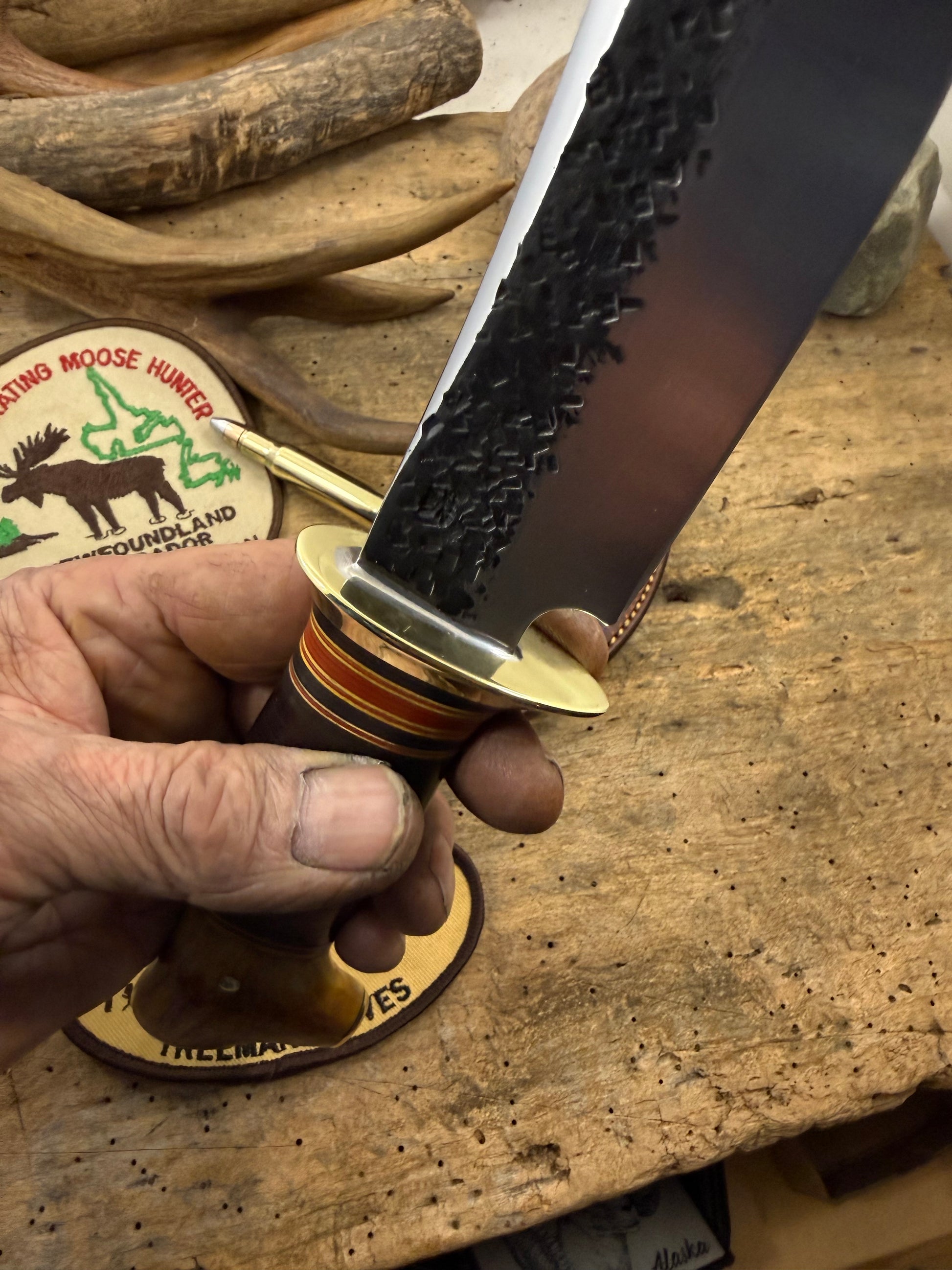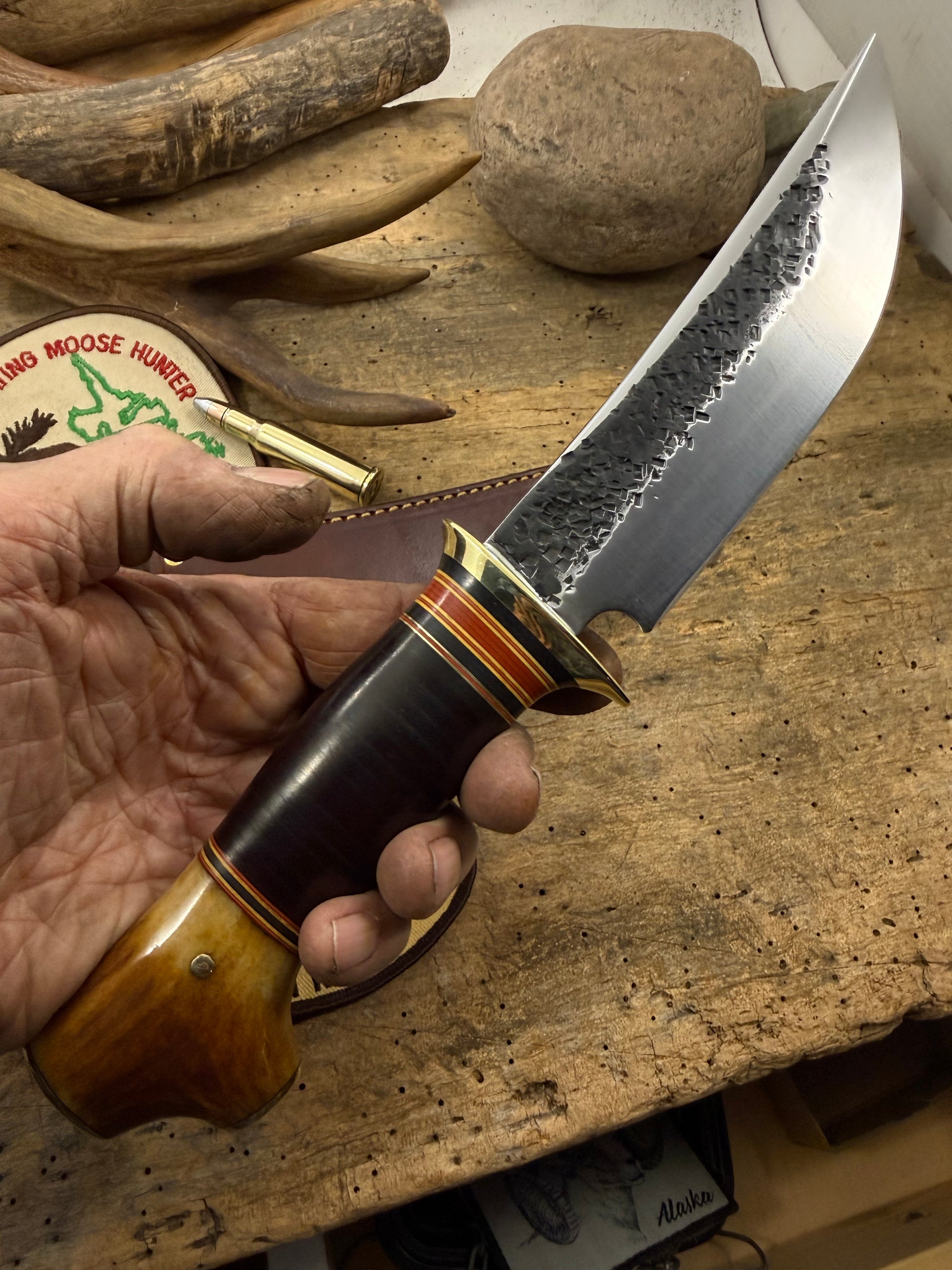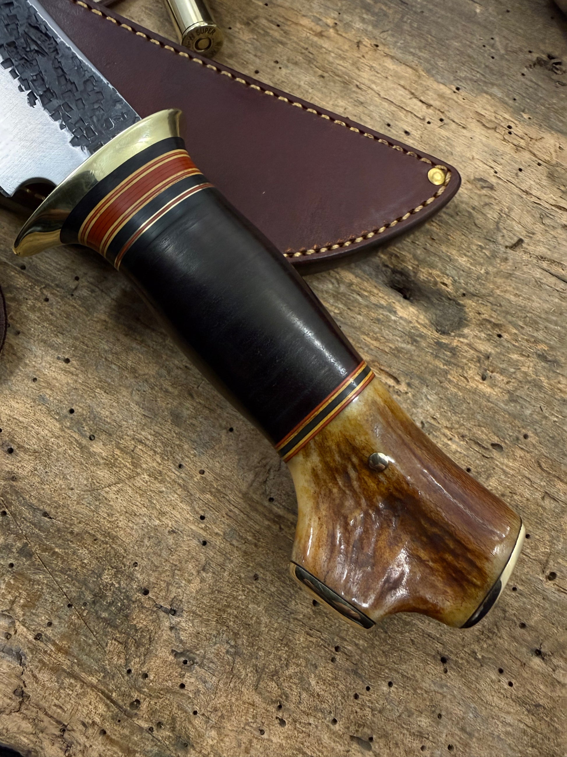 This is one hell of a Big Six Hunter. Hand forged 1095 steel hollow ground hammer mark blade with a nice temper line. Silver soldered cartridge quality brite brass guard . Stacked horse hide with a wonderful spacer arrangement . Hidden tang runs past the brass pin in the primo crotch stag butt. I added pinned brass caps on the butt. Its a lot more time and labor but really finishes of the knife nicely . Sheath is made to fit bely style. Priced to sell, Thanks, Jim