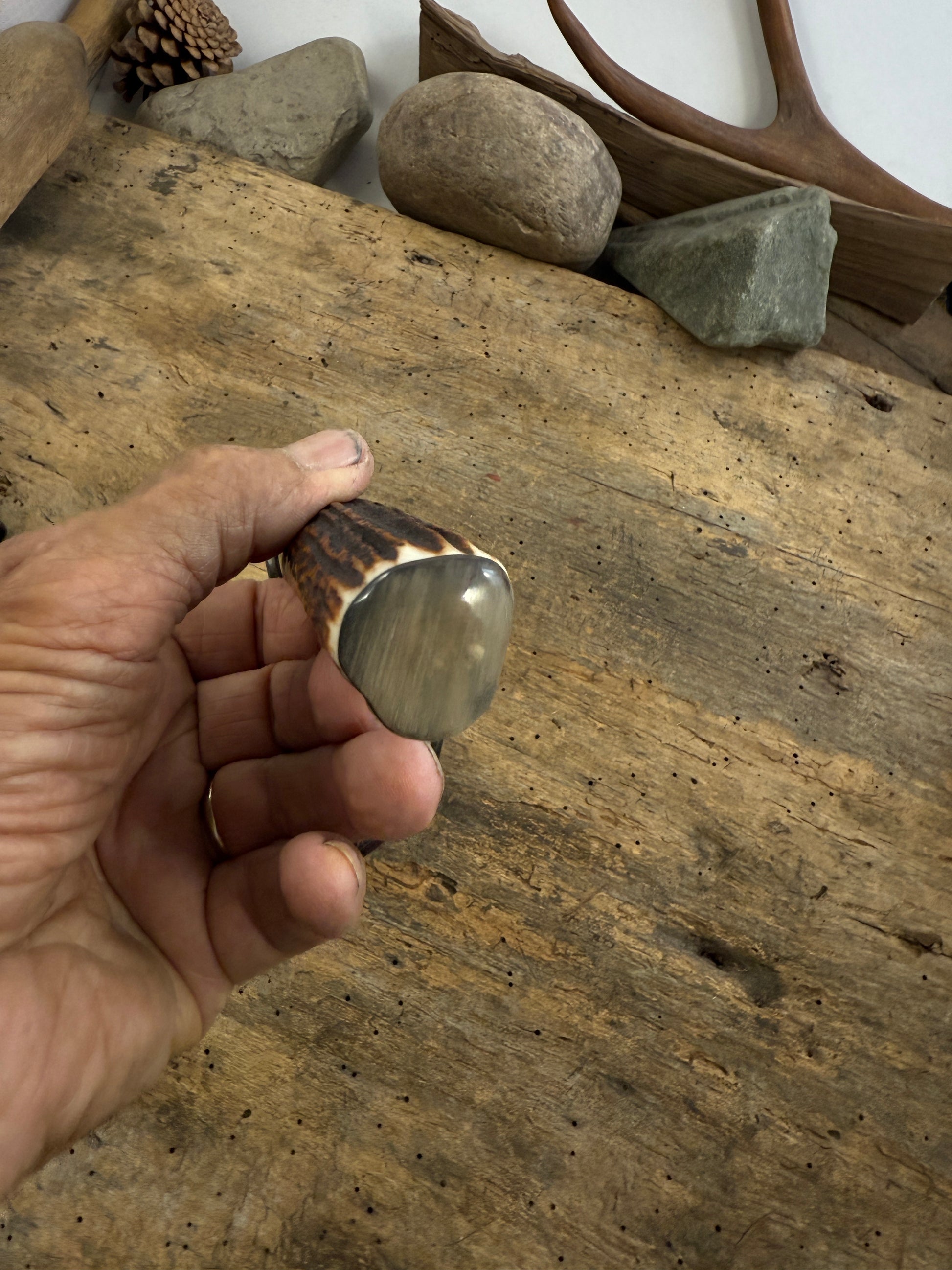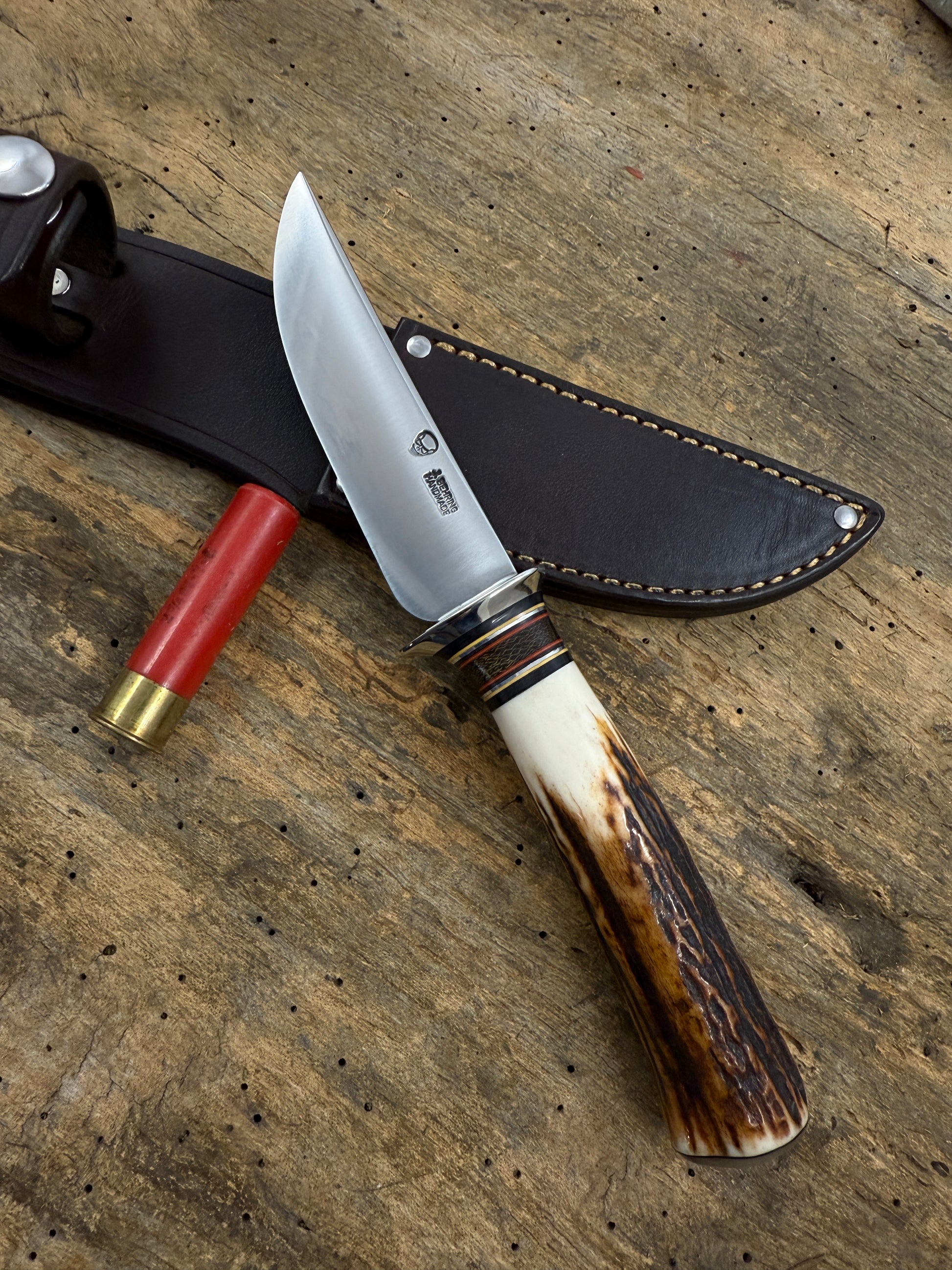 This little 4 1/4" Bladed Deer & Trout started out to be a small Fighter with a double guard and a the single skull stamp. Needless to say I ground the guard to a single guard so pretty much makes it a hunting knife. Blade is convex ground so its strong as hell and with the stainless blade it will never rust or stain if you get lazy and don't take care of your knife . Nickel guard that's silver soldered to perfection. nice subdued spacer stack with a hidden tang that runs almost to the Musk Ox butt cap. OAL is about 8 3/4". Killer sambar stag and comes with a perfect fit in house made leather belt sheath. Great knife for just about and out door adventure. Thanks, Jim TMK