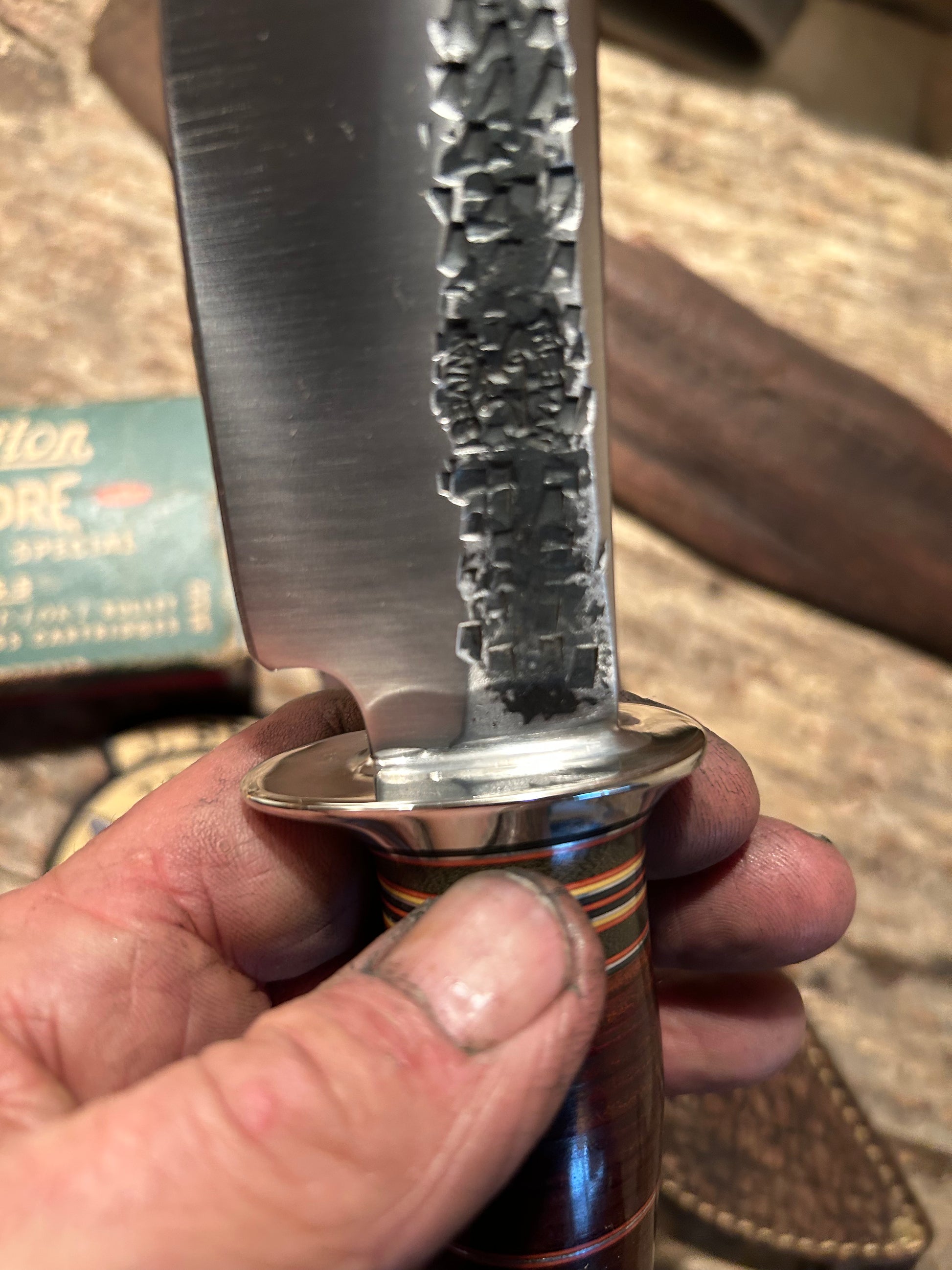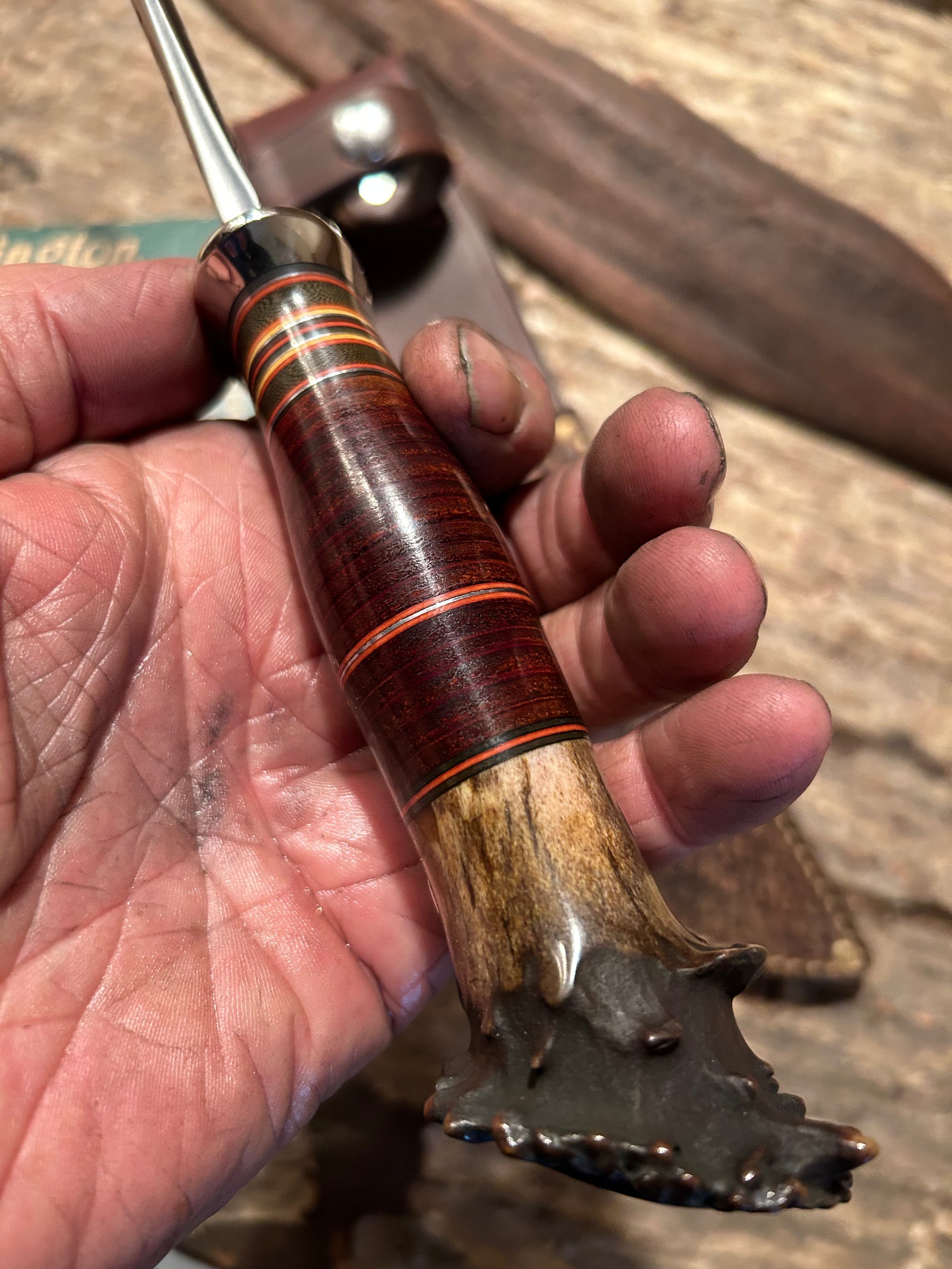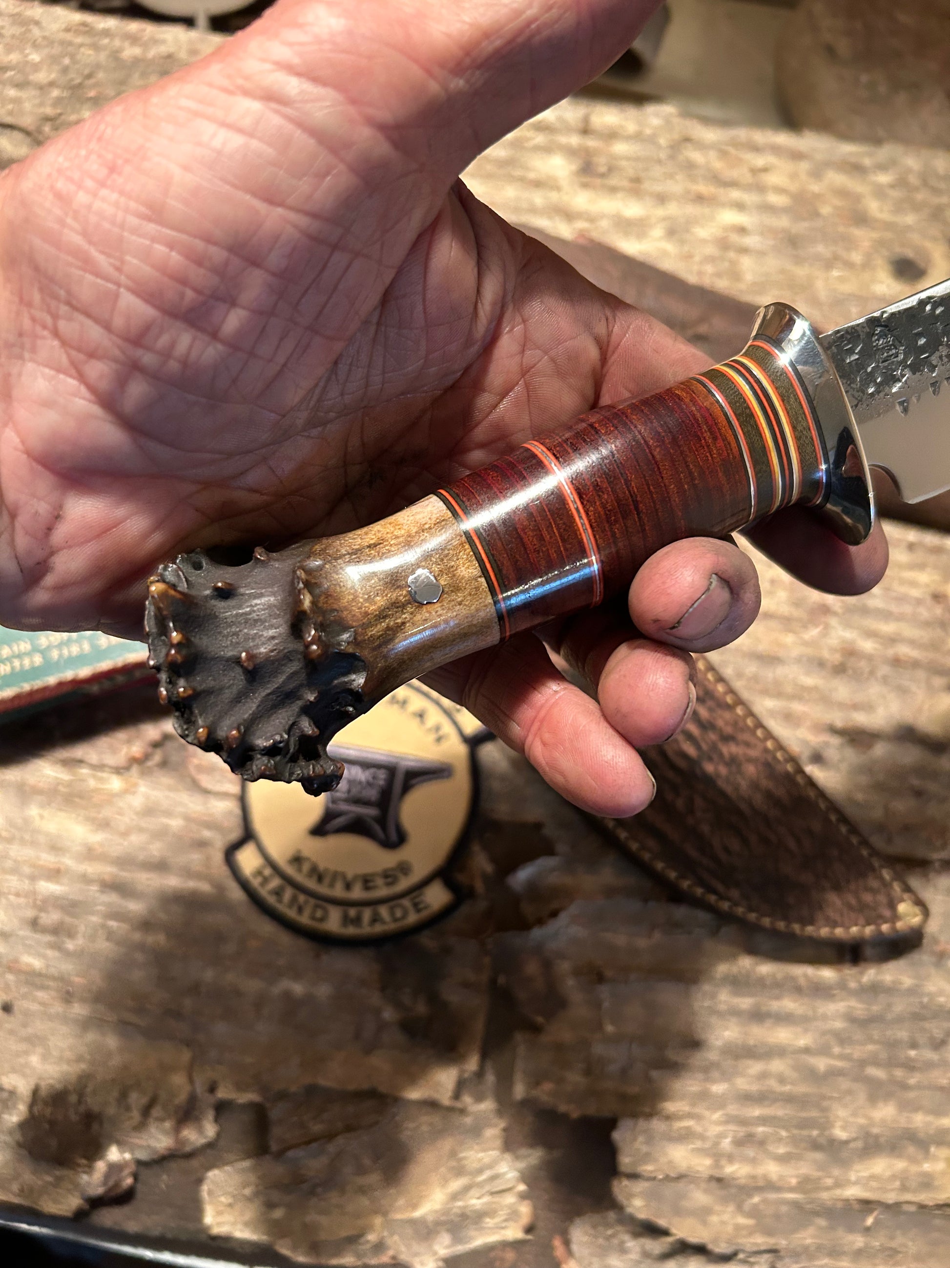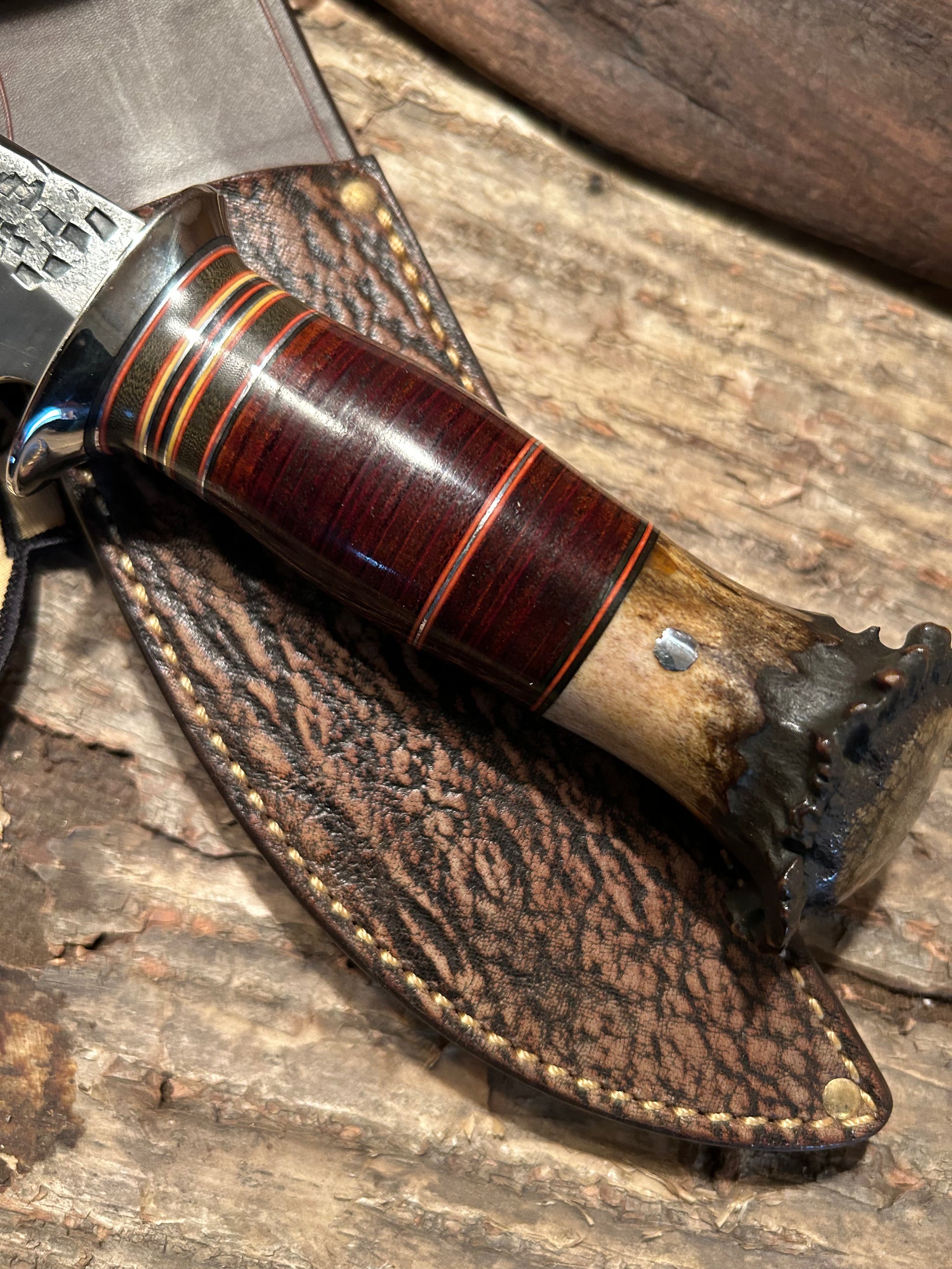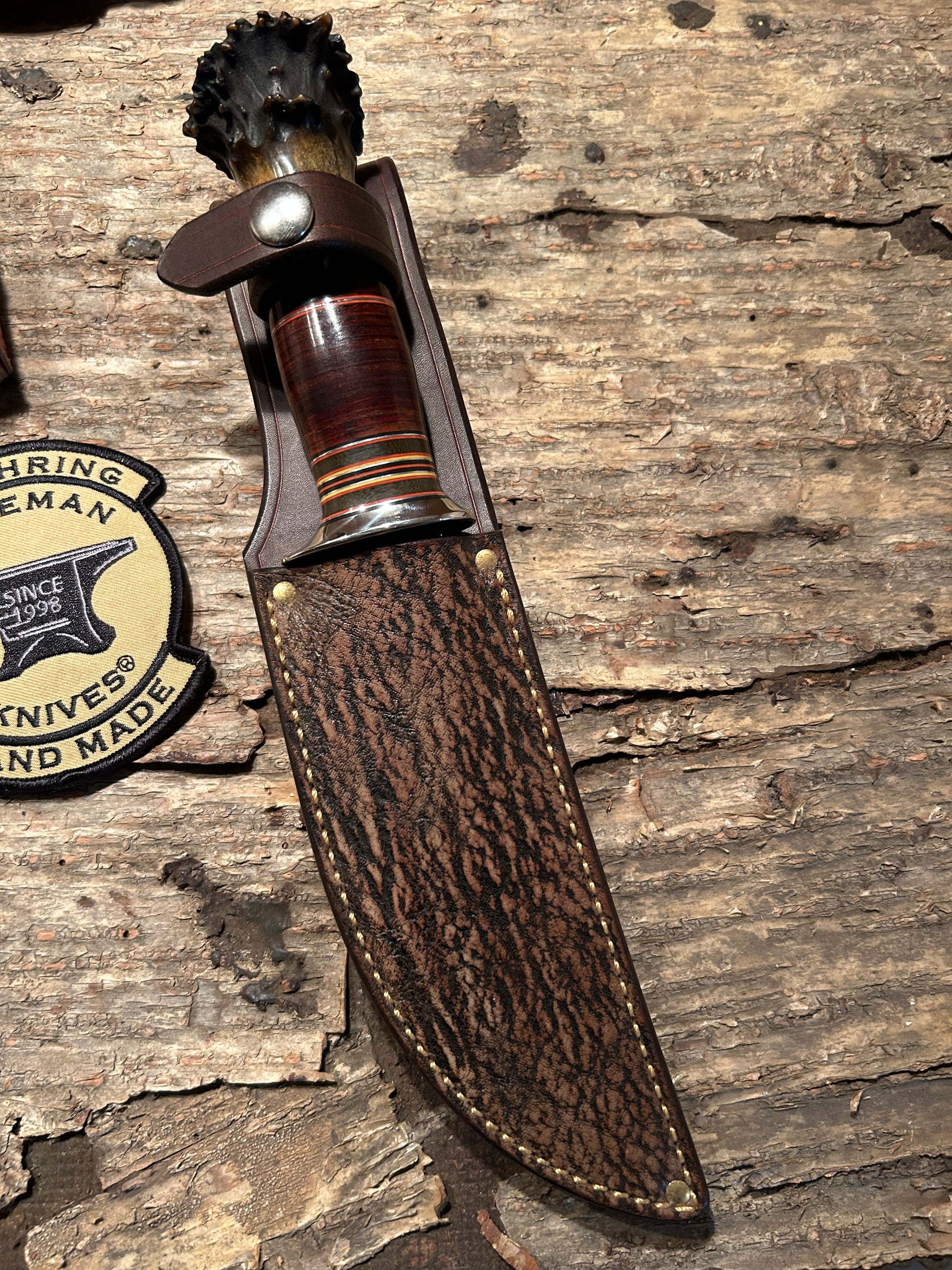 This is a real beauty as they say. Hand forged 1095 spring steel with a nice deep hollow grind. Blade is 5 3/4" long and about .250 thick. Nickel guard is silver soldered. Hidden tand handle has a one of a kind spacer stack with horse hied and a pinned mule deer crown stag butt. OAL is about 10 1/2" . Just a real classic hunting knife . Comes with a made to fit giraffe and 9oz leather bel sheath. Priced to sell, Jim
