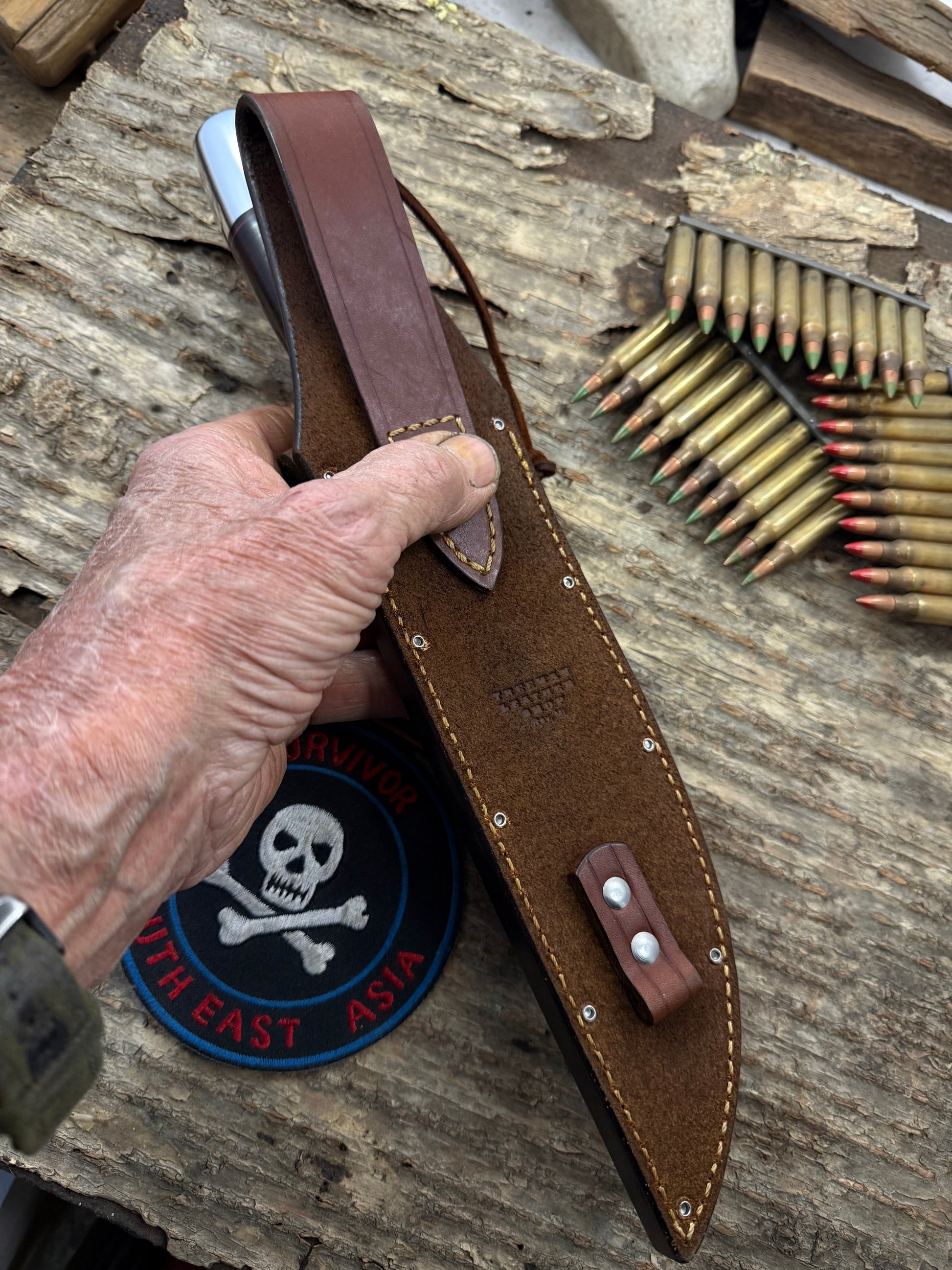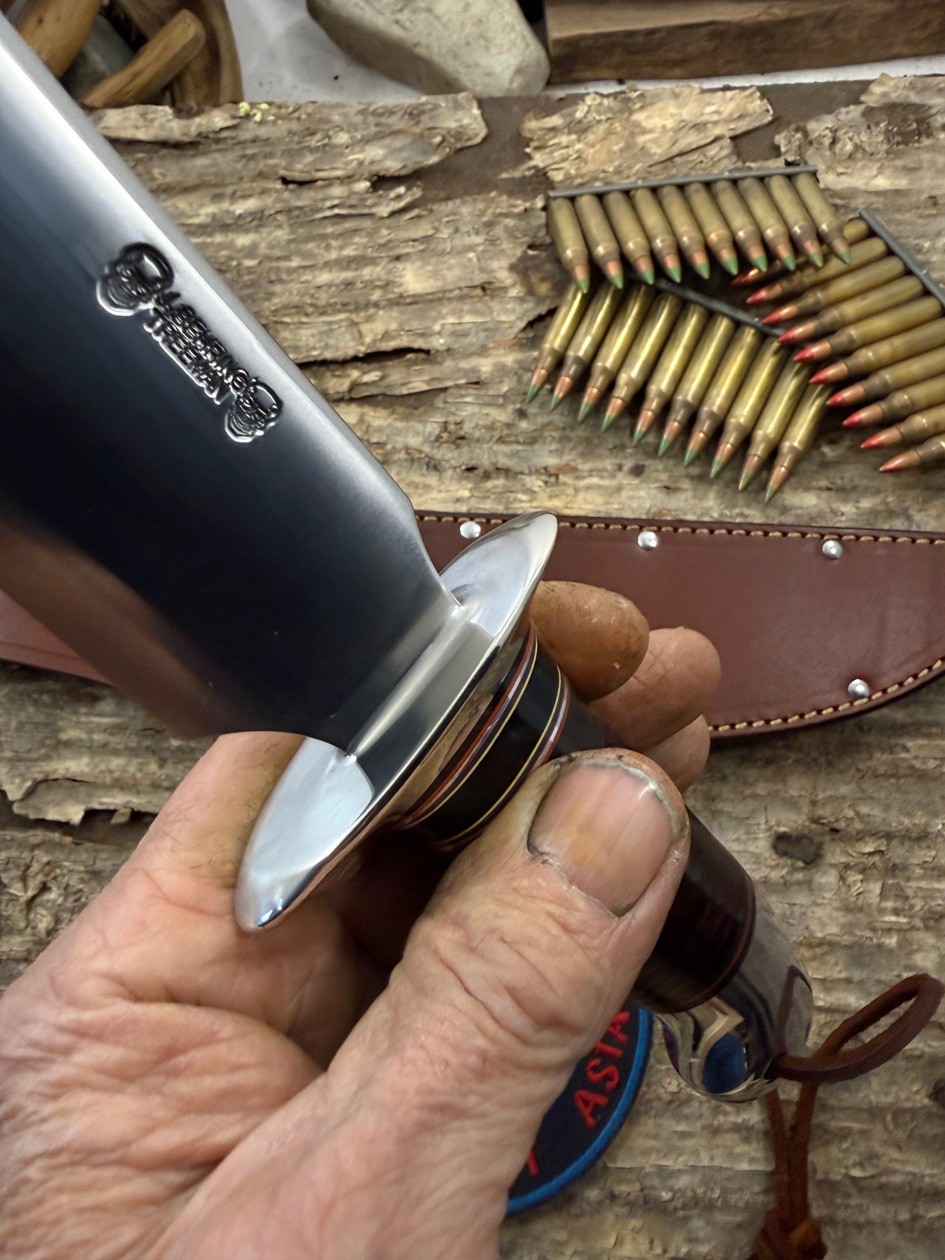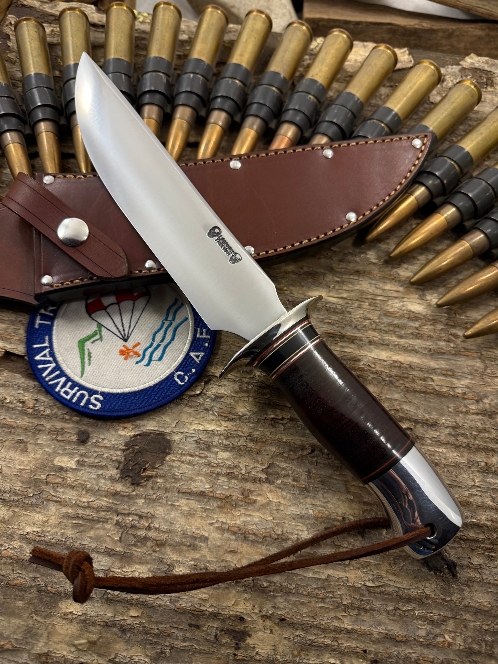 This Treeman 8" Double Skull Fighter has a heavy duty .200 thick blade made of AEB-L stainless steel. Convex ground and razor sharp. Double guard is nickel silver and silver soldered to perfection. Like a one piece knife with the perfect joiny from blade to guard. Hidden tang is fat and runs almost to the end or the pinned aluminum crows beak butt . Stacked horse hide is traditional and very very durable . OAL is about 12 5/8'. Comes in a custom WW2 style wide mouth rough back sheath with a leg tie down. Big Knife lots of labor and ready to ship. Thanks, Jim