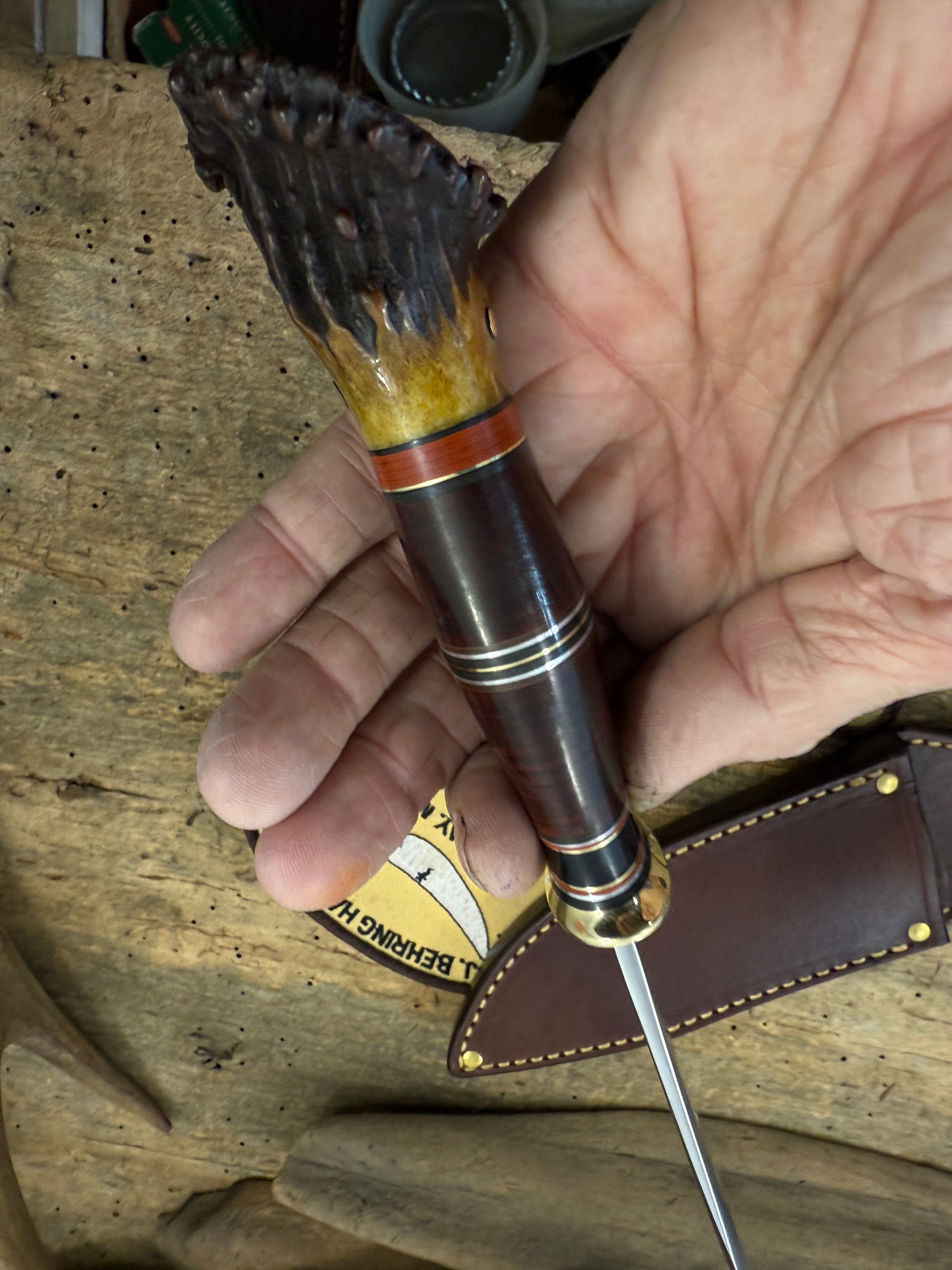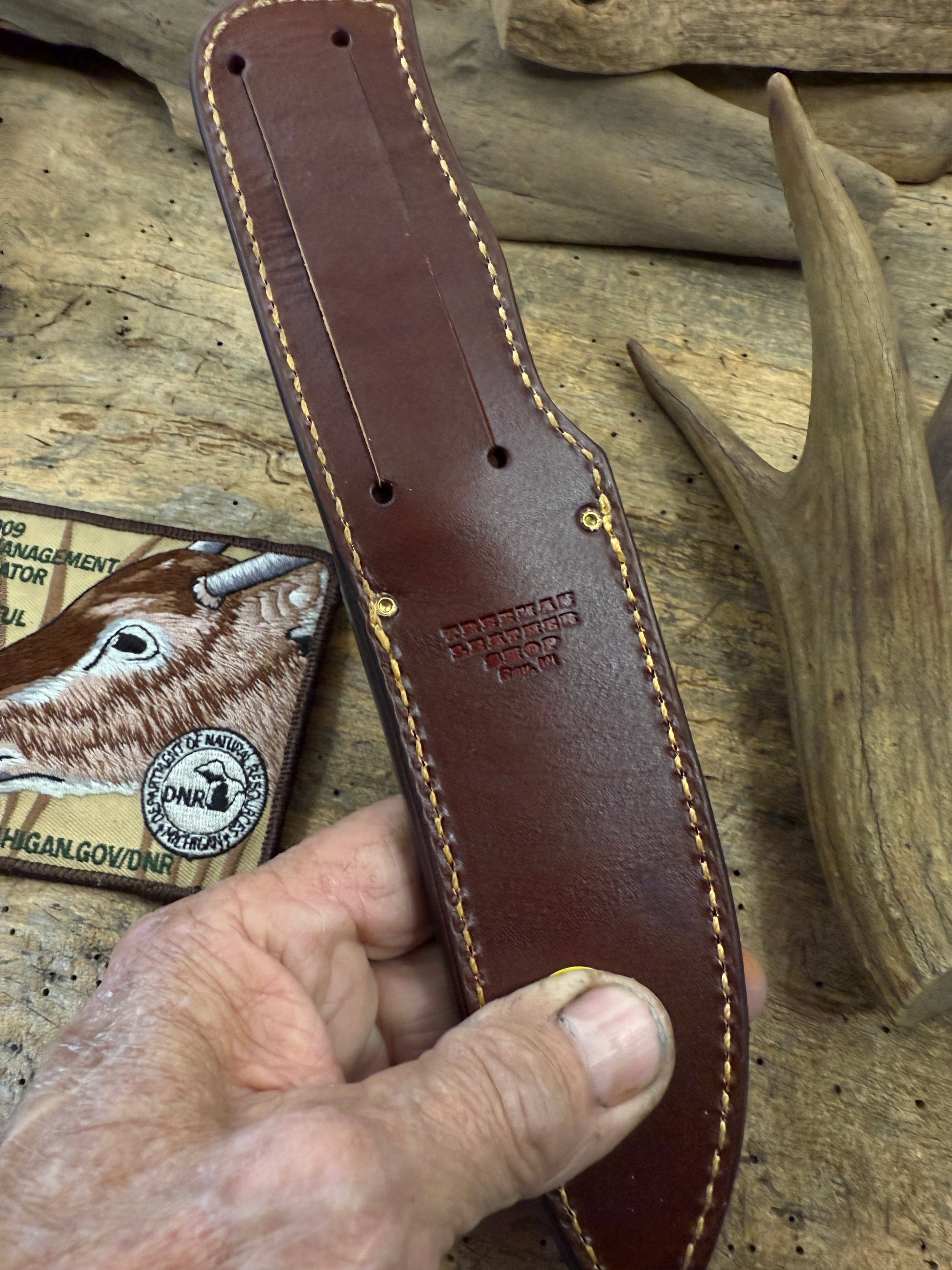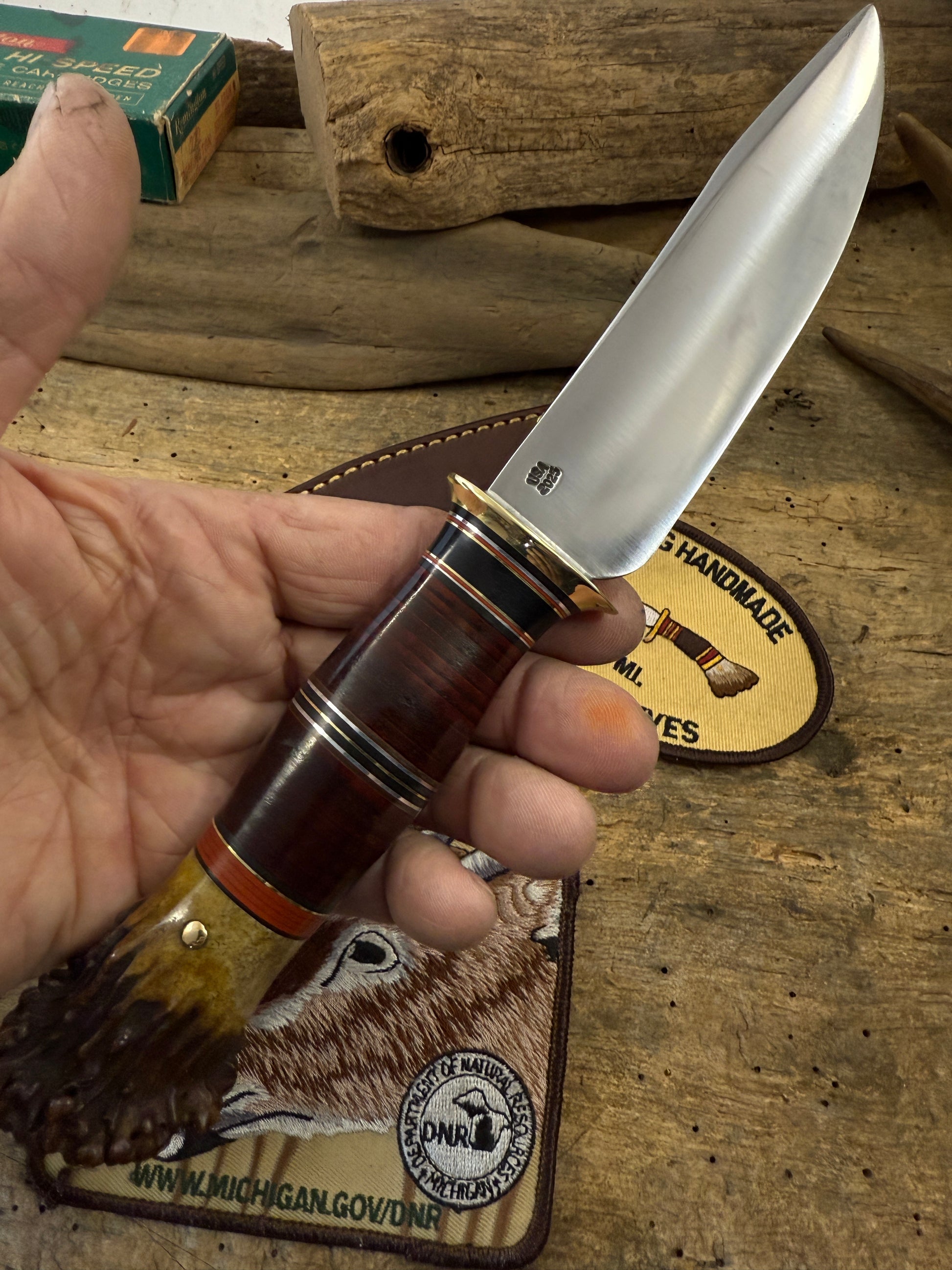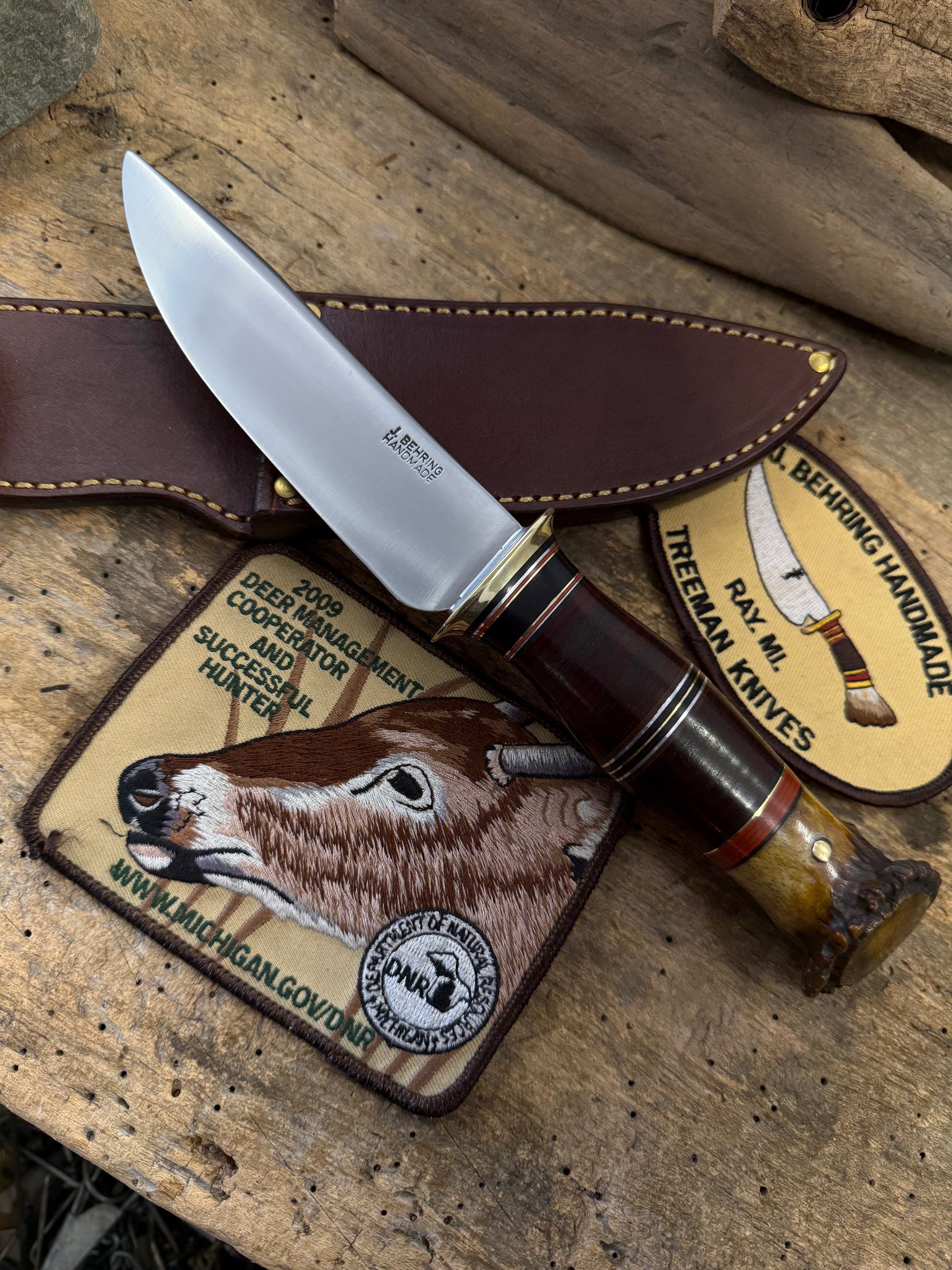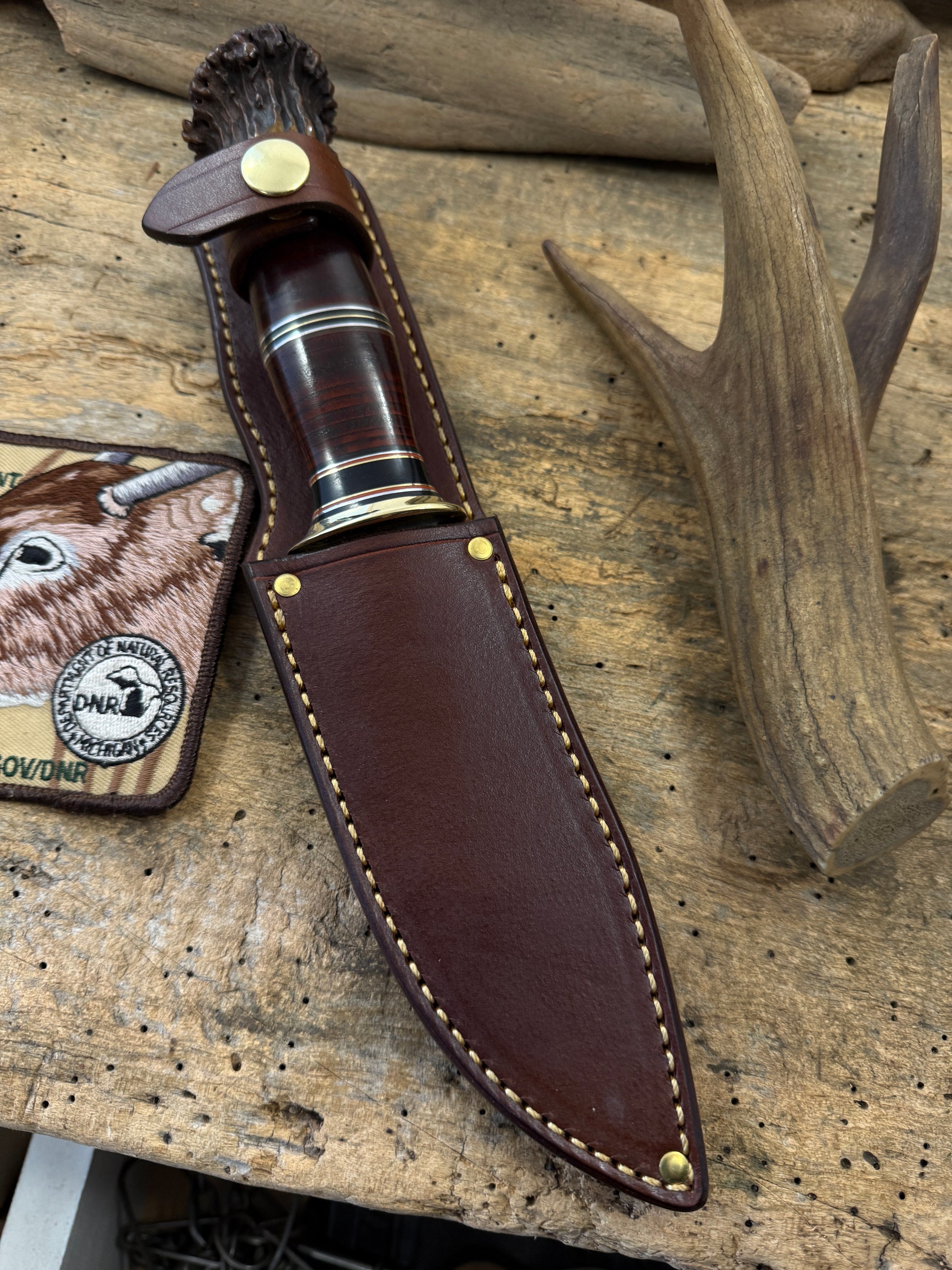 This Treeman Sticker has a hand forged 5" 1095 steel convex ground blade around .190 thick . Sharp as hell with a silver soldered brass guard. Hidden tang handle is stacked horse hide " Hard as Hell" killer spacer arrangement and a pinned 1930s Wisconsin crown stag butt . Crown came for a very old hunting camp out in the boonies from back in the day. OAL is about 10 1/4". Comes in a full stitched sheath made to fit perfectly.