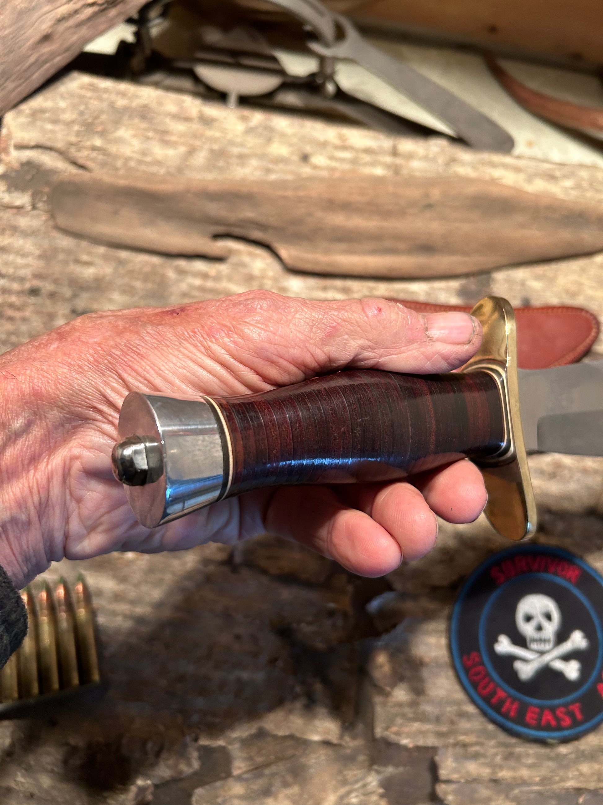 This older Randall Model 12-8 big Bear Bowie is one hell of a knife. This one has never been sharpened or used just stashed away and collected buy who knows how many people. 8" carbon steel blade ,forward curved brass guard with a stacked leather commando handle and aluminum butt. Original rough back sheath with the soft Arkansas stone. Priced to sell. Thanks, Jim