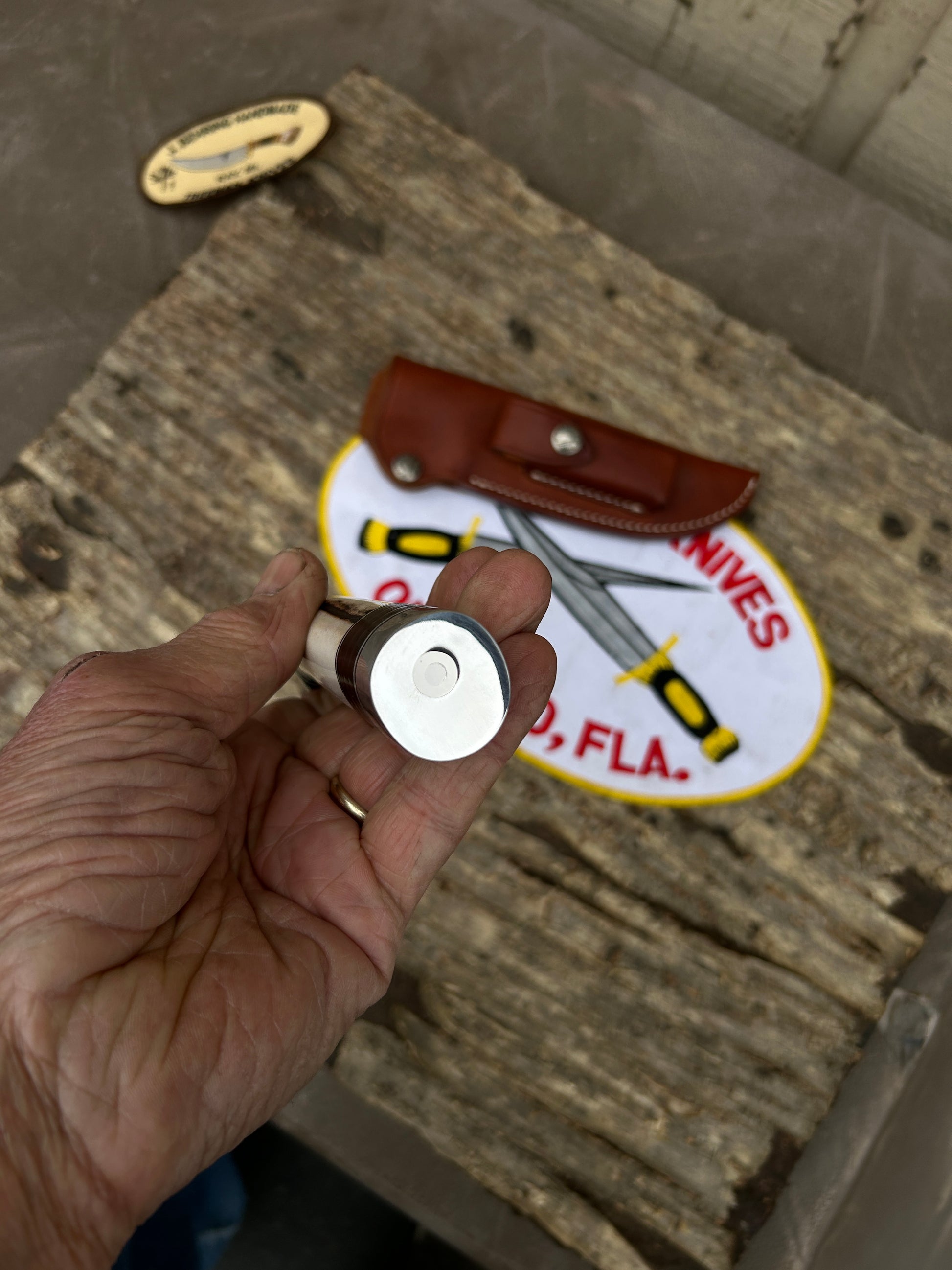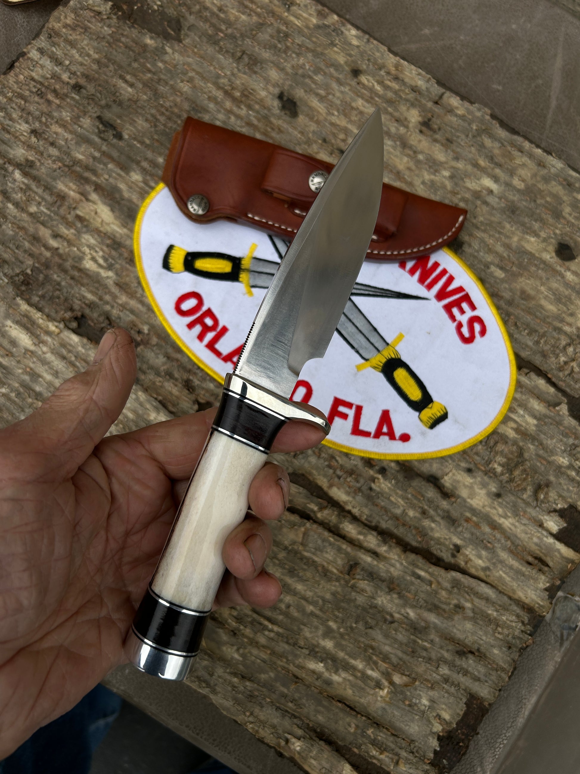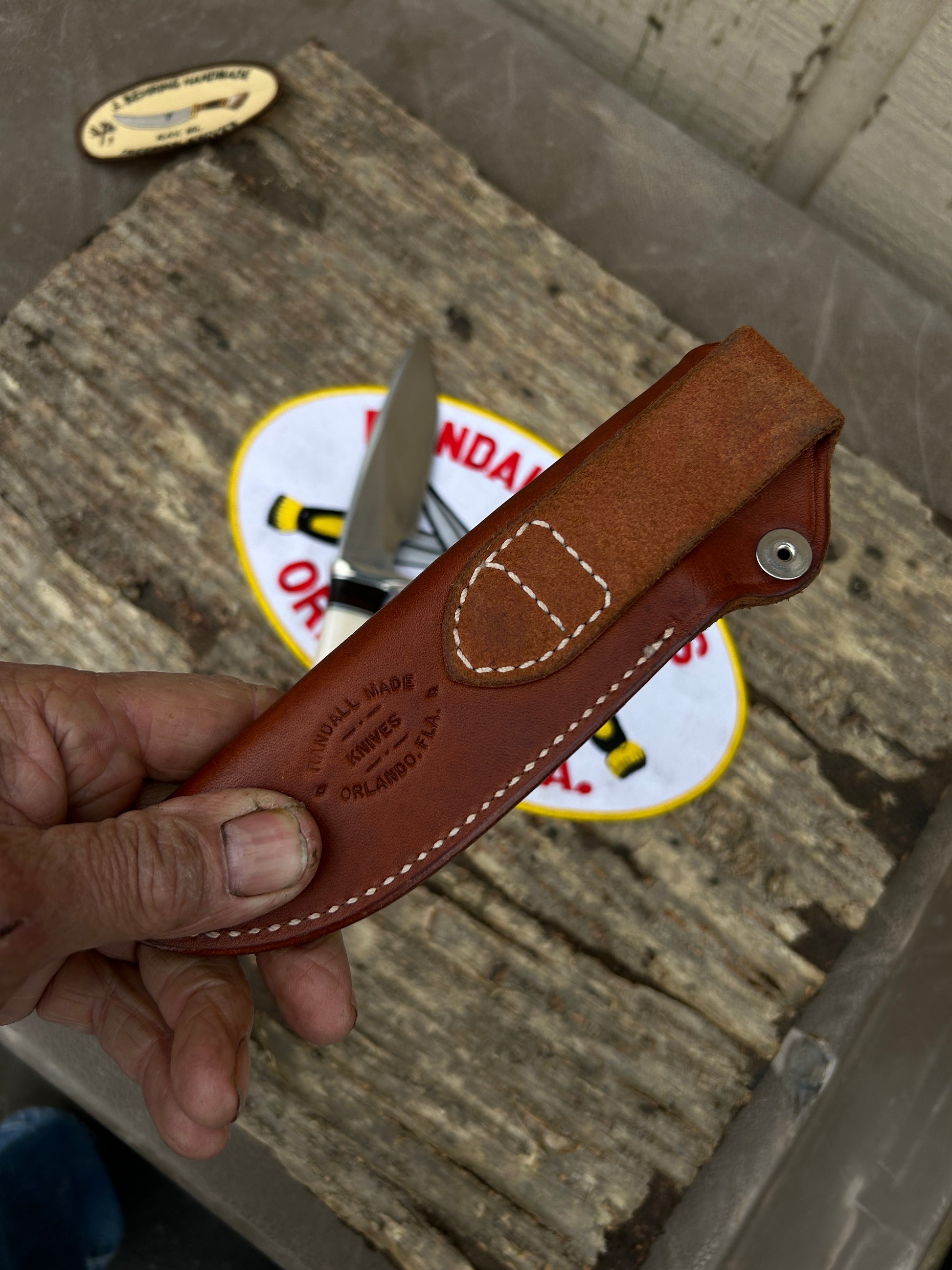 This Randall Model 25 Trapper has a 5" carbon blade with nickel silver guard and a polished sambar stag handle with aluminum butt. Knife is as new and comes in a stone pouch sheath. Ready to ship today . Thanks ,Jim