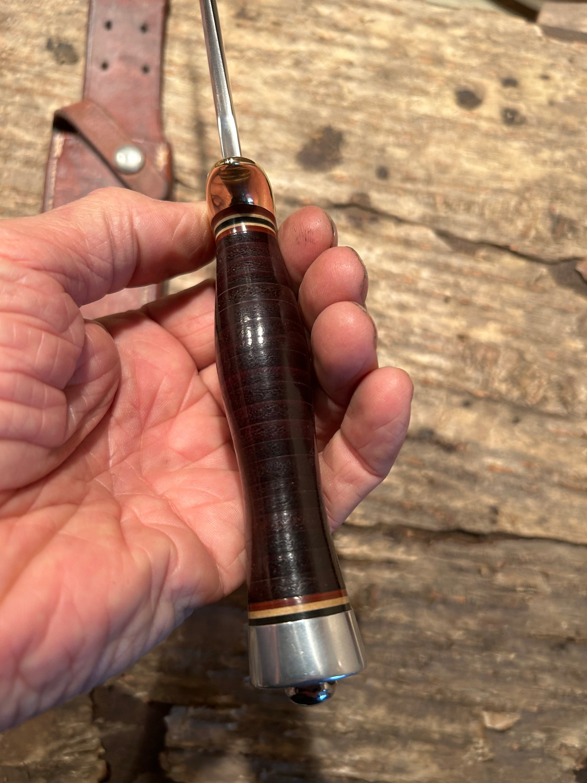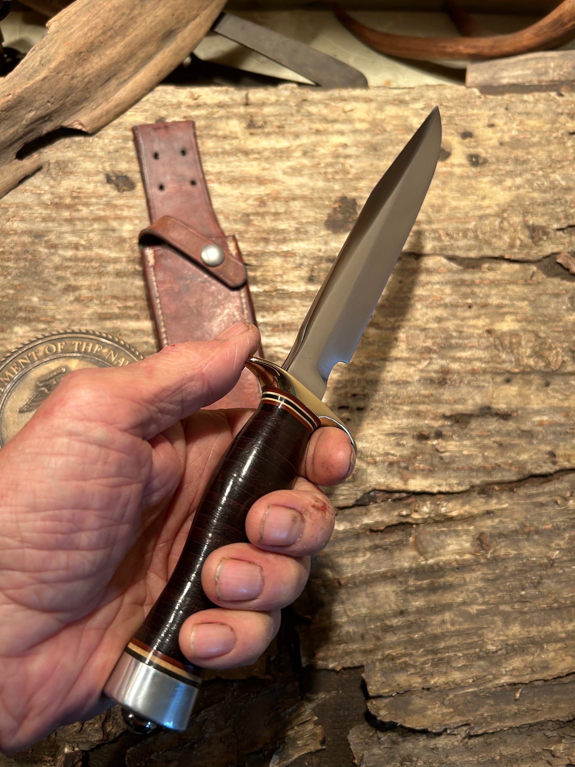 This is one hell of a nice older Model 1-7 in an old waxed dive knife sheath. Who knows if it was ordered this way of somebody mixed up the sheaths at one time or the other. Either way the blade is dam near perfect, never sharpened . Commando leather handle with aluminum butt with set nut. Double brass guard . Waxed sheath has the drain hole and in nice condition solid as a rock ready for some wet weather adventure. Any way it is what it is and its priced to sell. Tanks, Jim