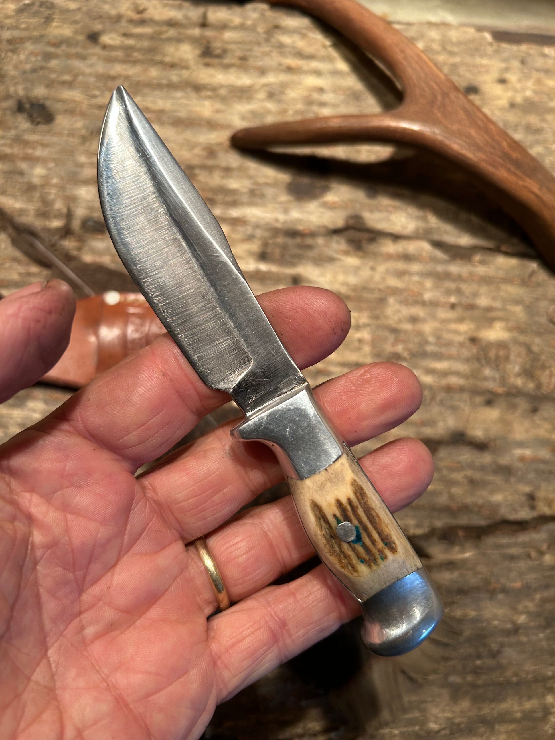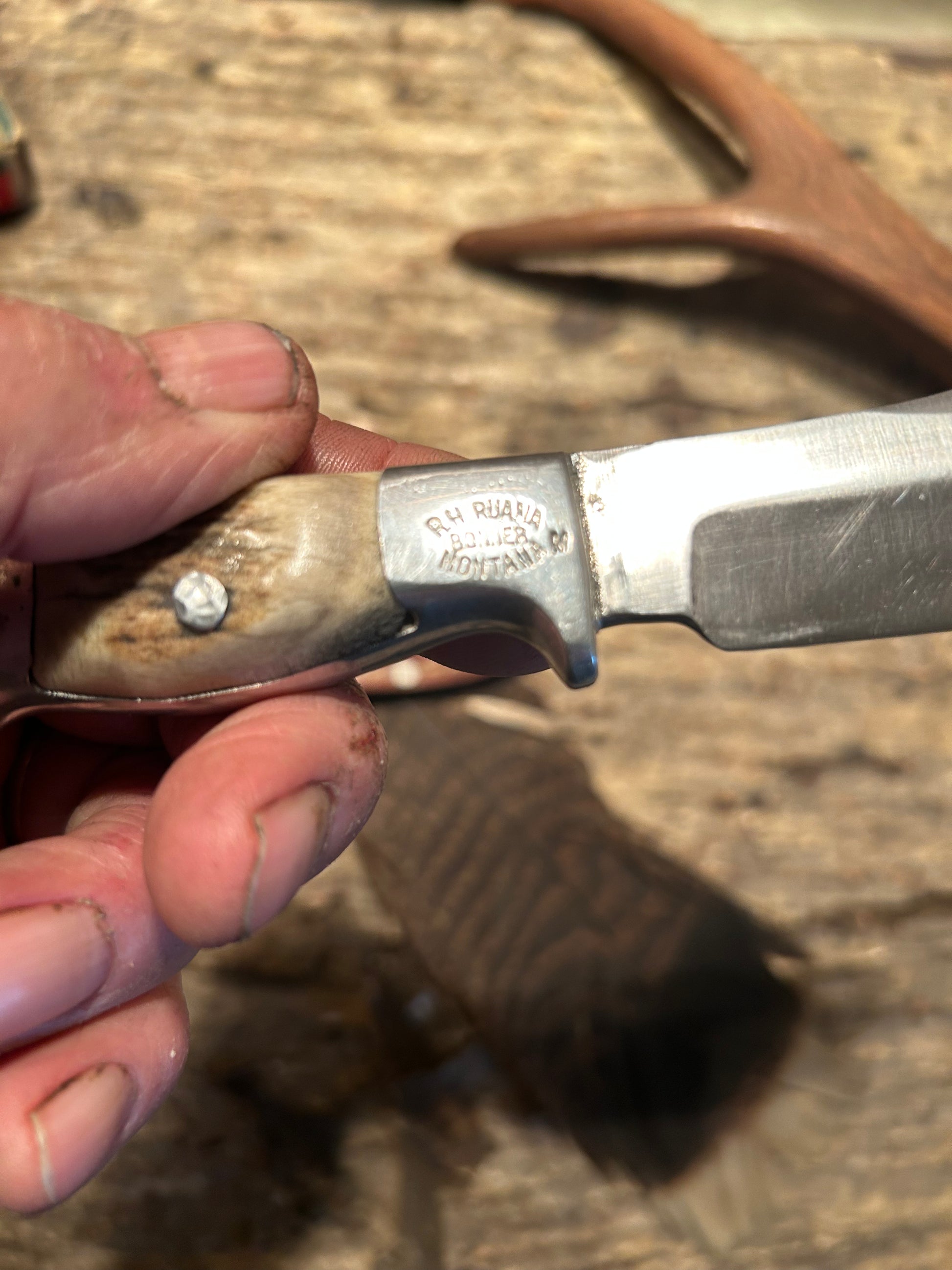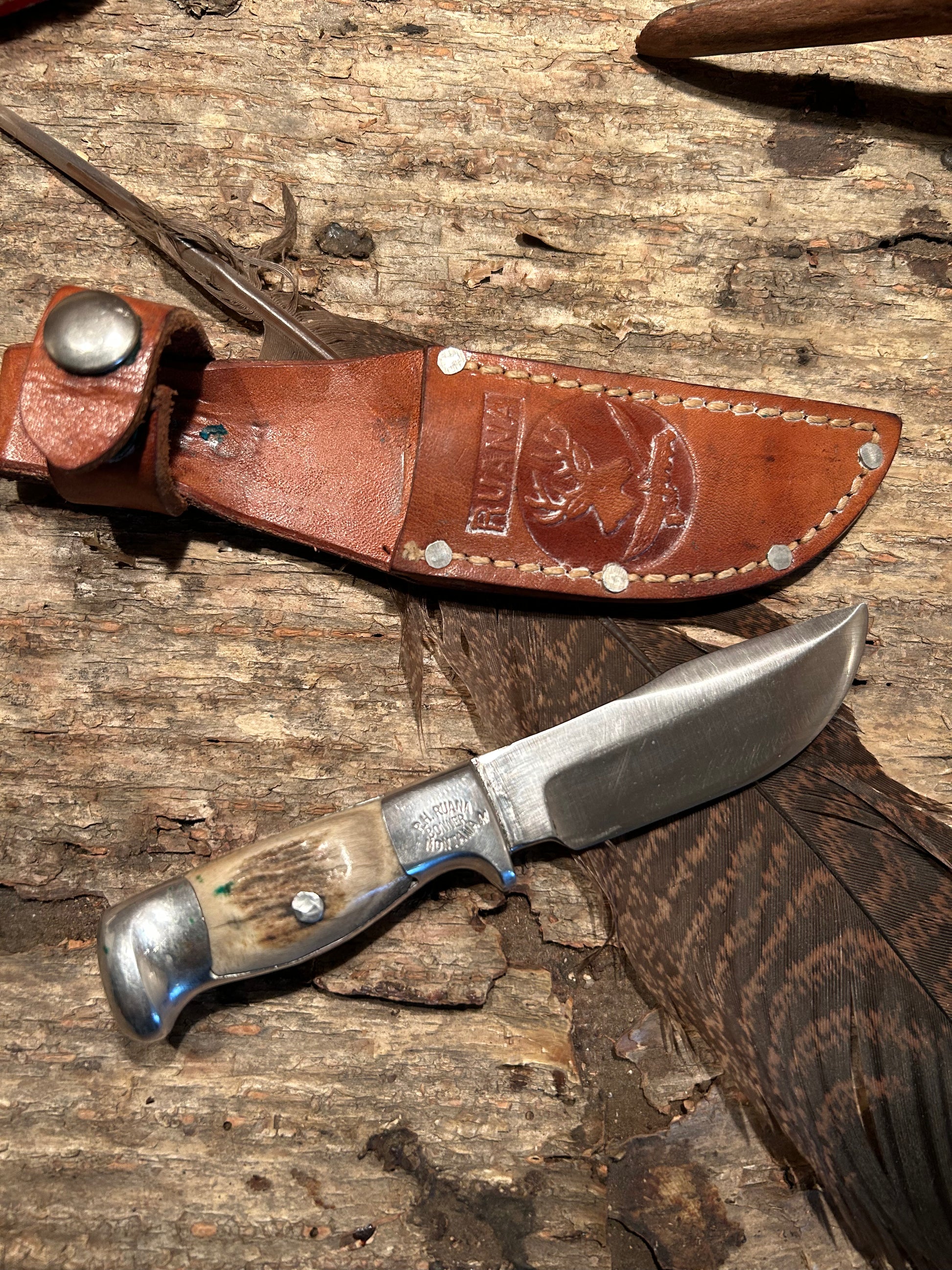 This vintage smoke jumper has always been every body's favorite Ruana. Just a cool little piece of history. This Ruana 10B has a forged 3 1/2" blade in Rudy mint condition with an aluminum handle with elk horn inserts. M stamped so its pre 1982. Made when Rudy was still with us. Sheath is original to the knife and ready to ship . Been a wile since I have had a smoke jumper. Its safe to say I have bought and sold several thousand Ruanas over the years and hope to be able to offer up some more soon. Thanks, Jim