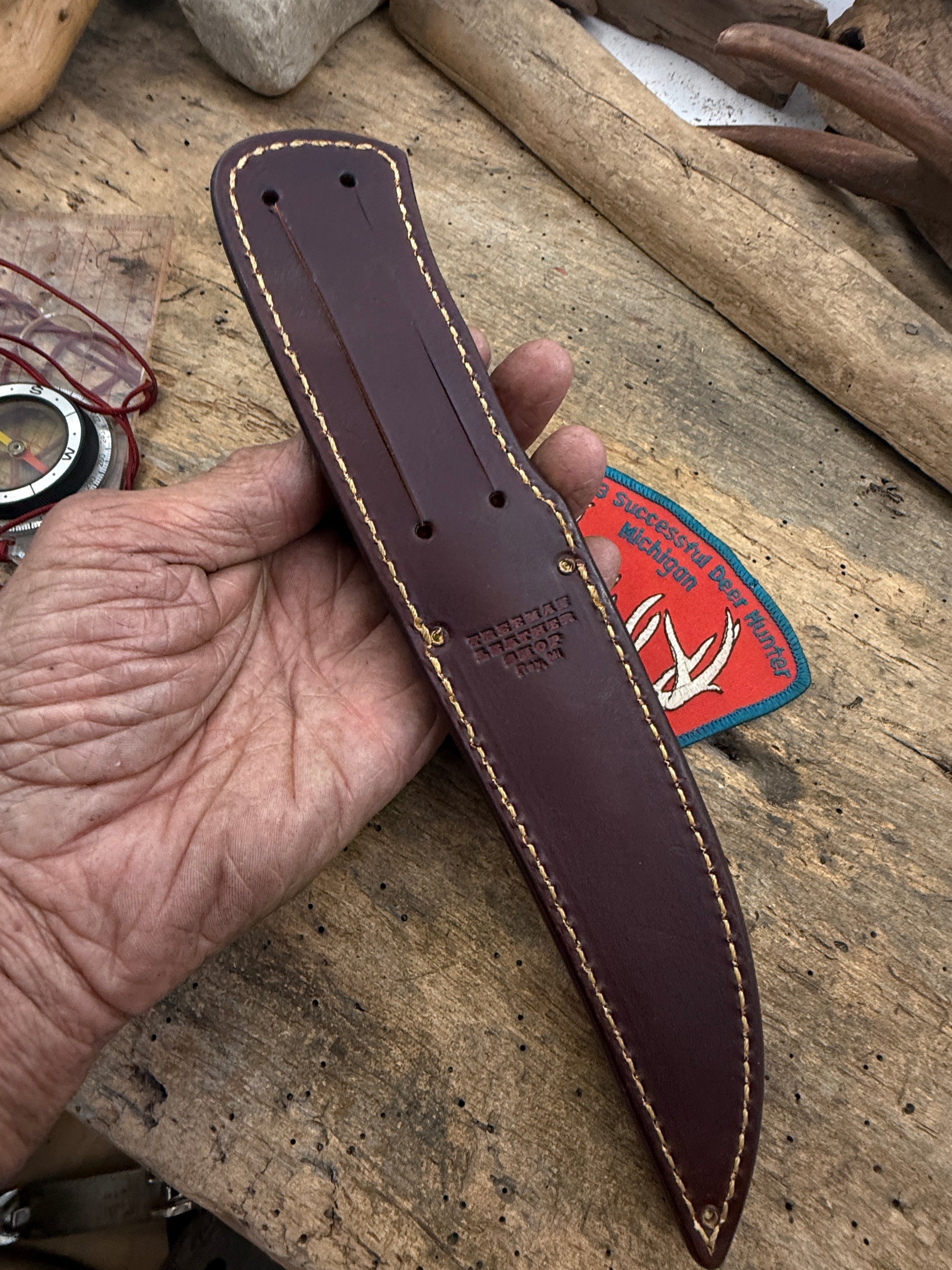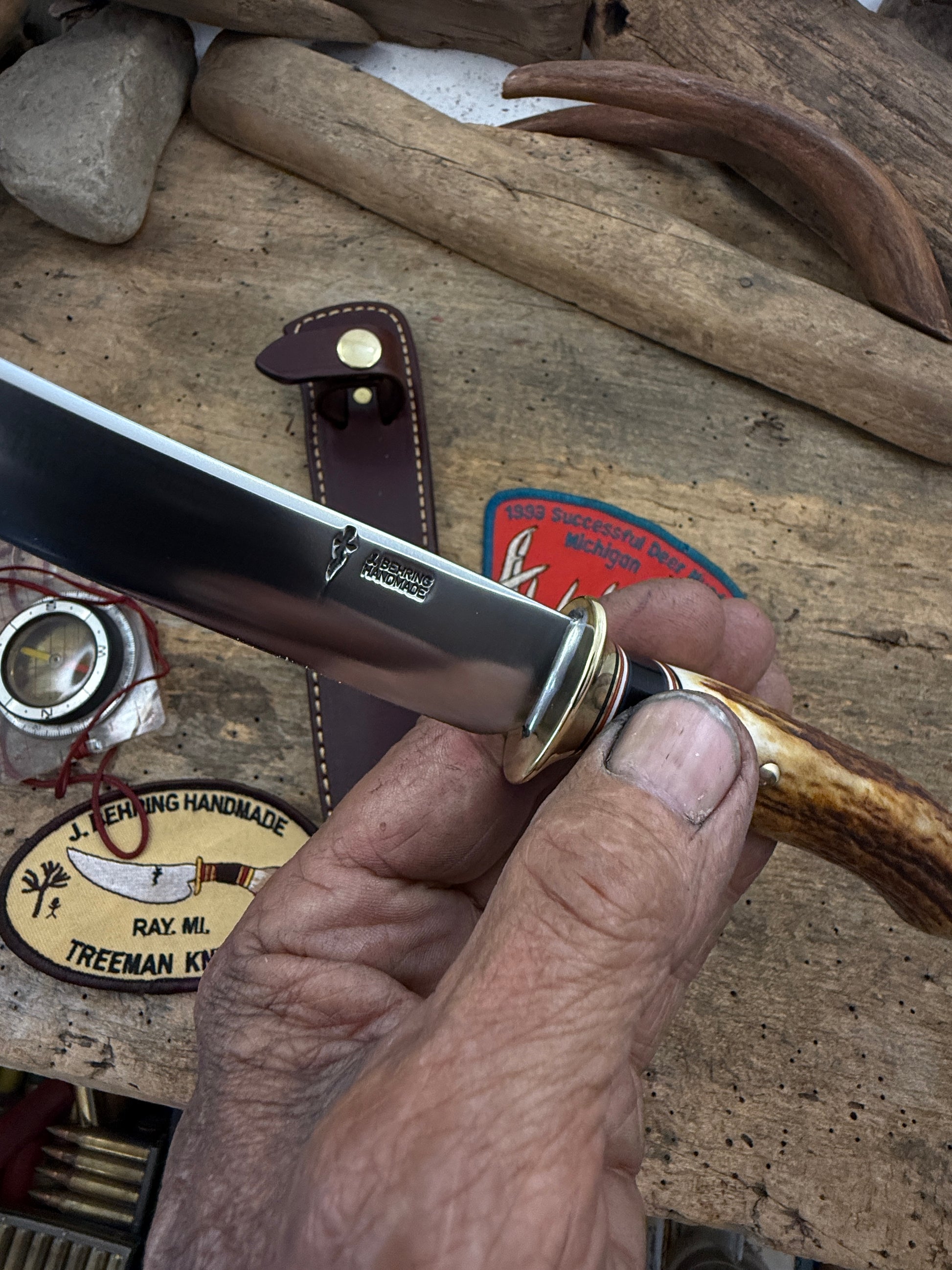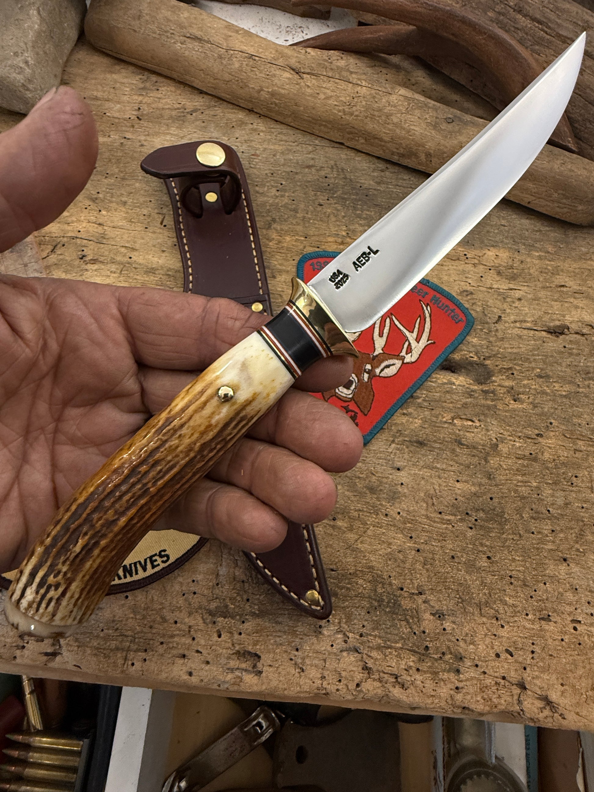 This wonderful Deer & Trout is perfect for that hunting trip thats just around the corner. 5 1/4" Stainless razor blade steel convex ground slicer. Guard is brass and the hidden tang handle is sambar stag with a sheep horn butt cap. OAL is about 9 7/8". Comes in a full stitch belt sheath. Thanks, Jim