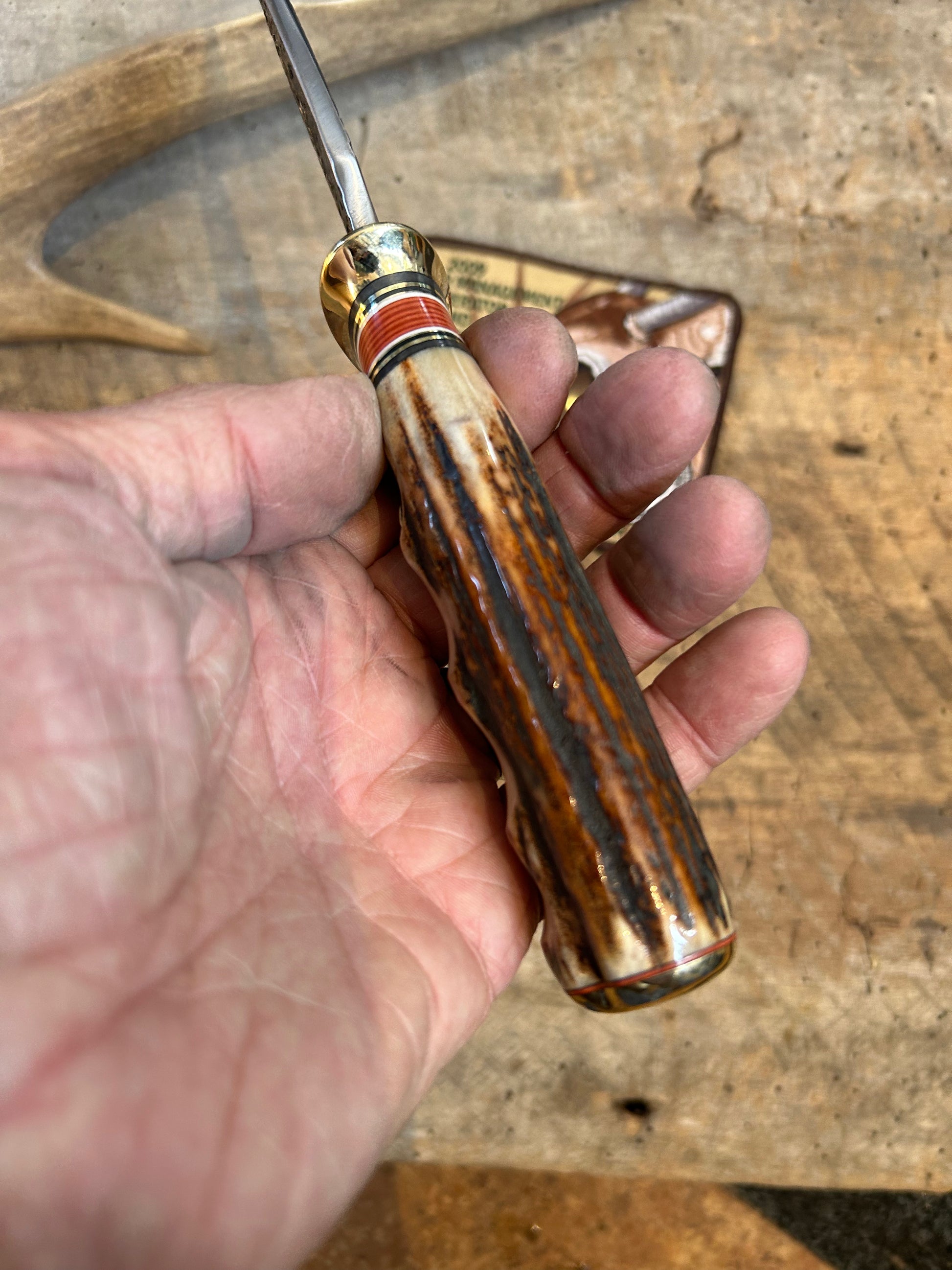 Treeman 5" Alaskan Hammermark Stag Finger Grip Handle DBL Brass