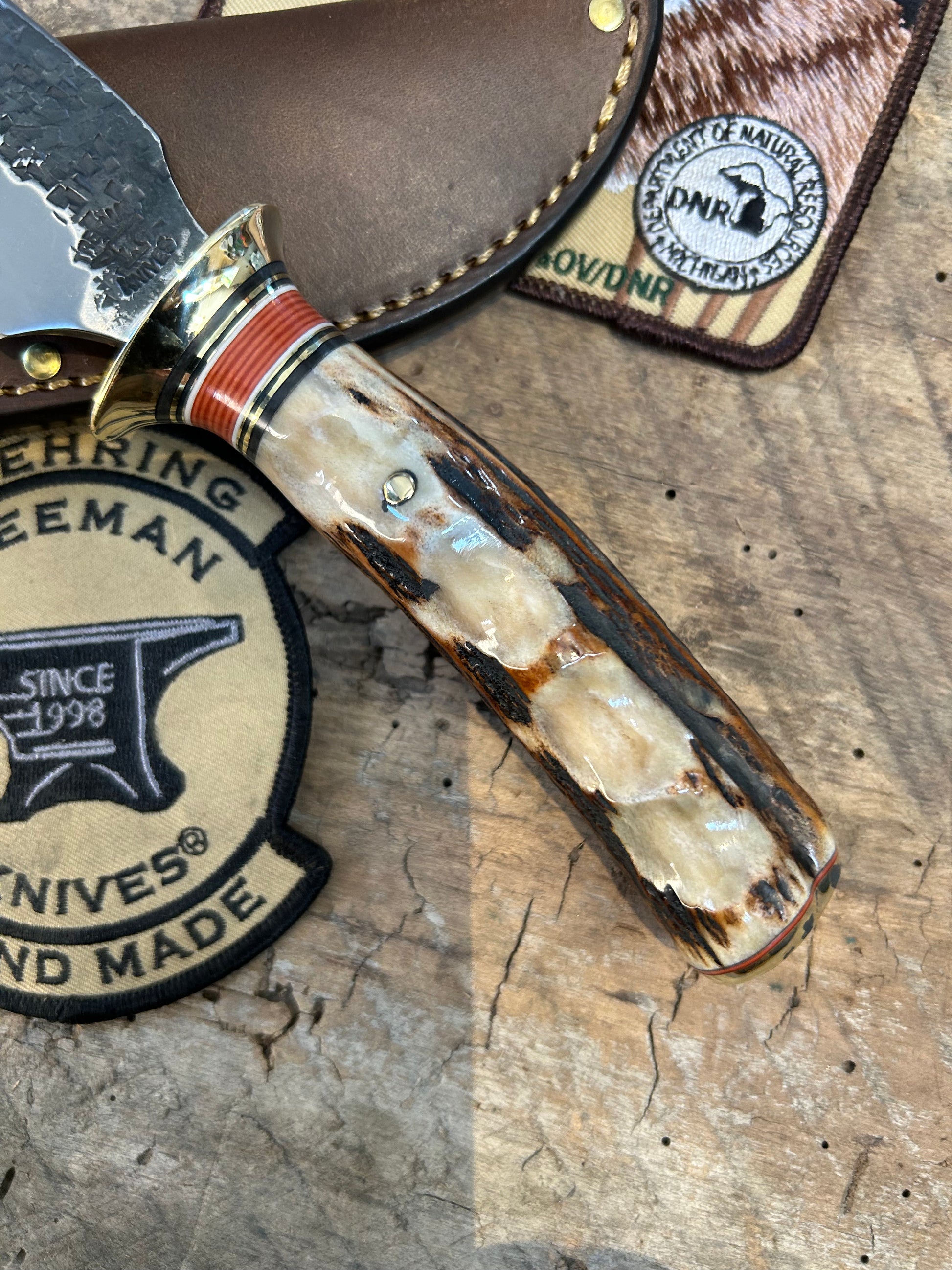 This J. Behring Handmade Alaskan has a hand forged 5" hammer mark blade made of 5160M spring steel eith a blade thickness of about .200. Hollow ground with a nice temper line and sharp as hell.  Silver soldered brass guard with a primo finger grip sambar stag pinned handle. Domed brass pinned but cap to finish it of nicely. The made to fit pouch sheath has solid brass rivets and made of 9 oz top quality leather. This is a perfect all around knife for just about any adventure. Priced to sell.  The world is gone crazy, inflation out of control and I still have kept my prices down . Thaks, Jim