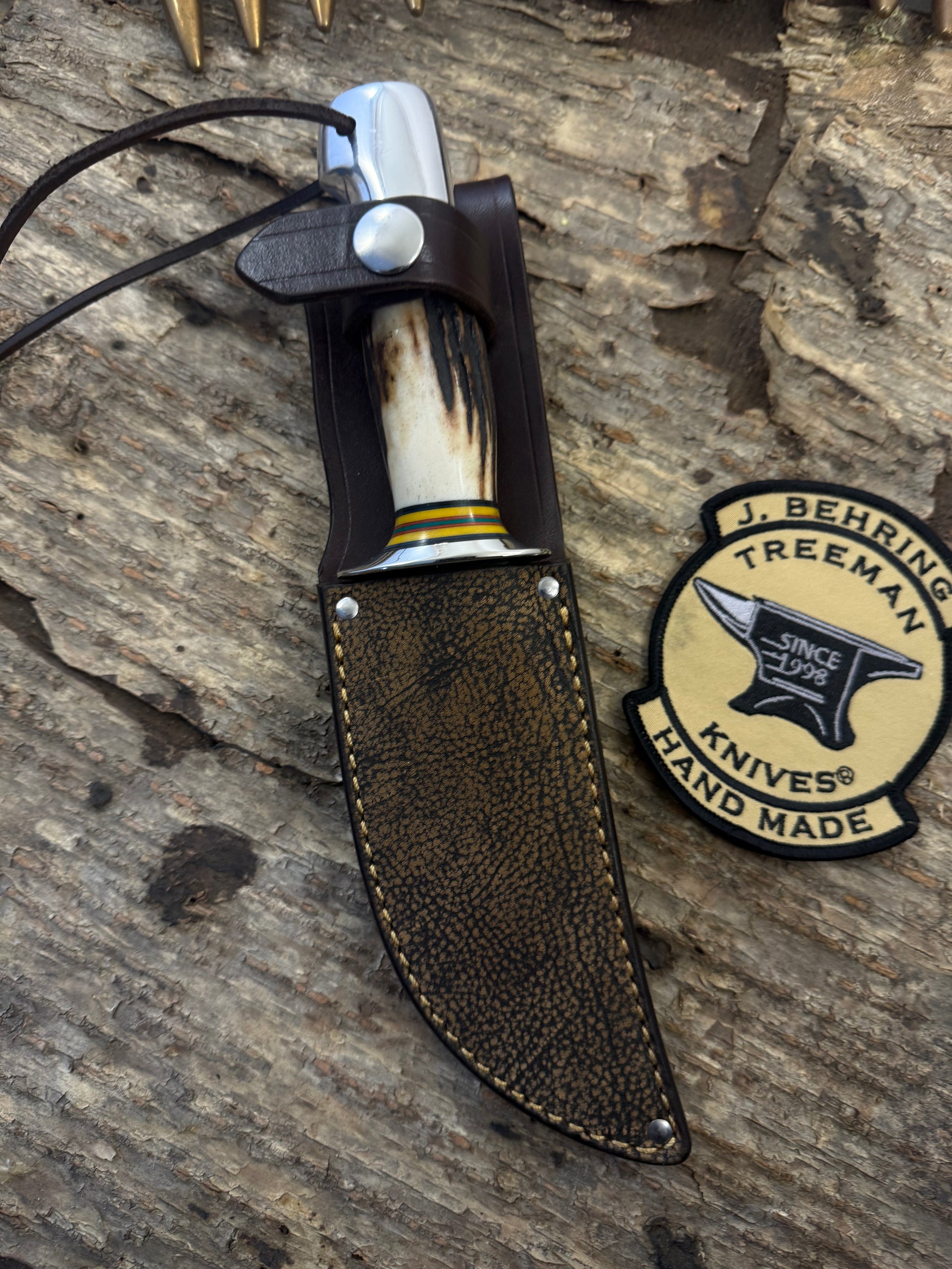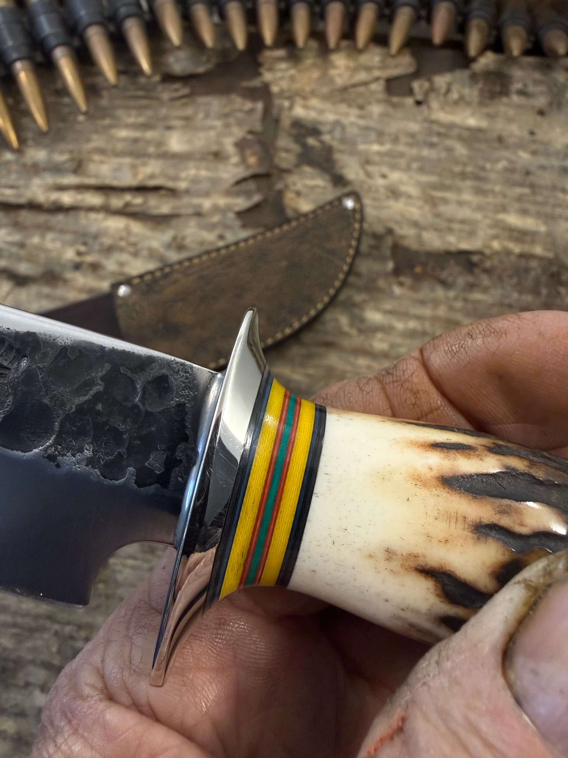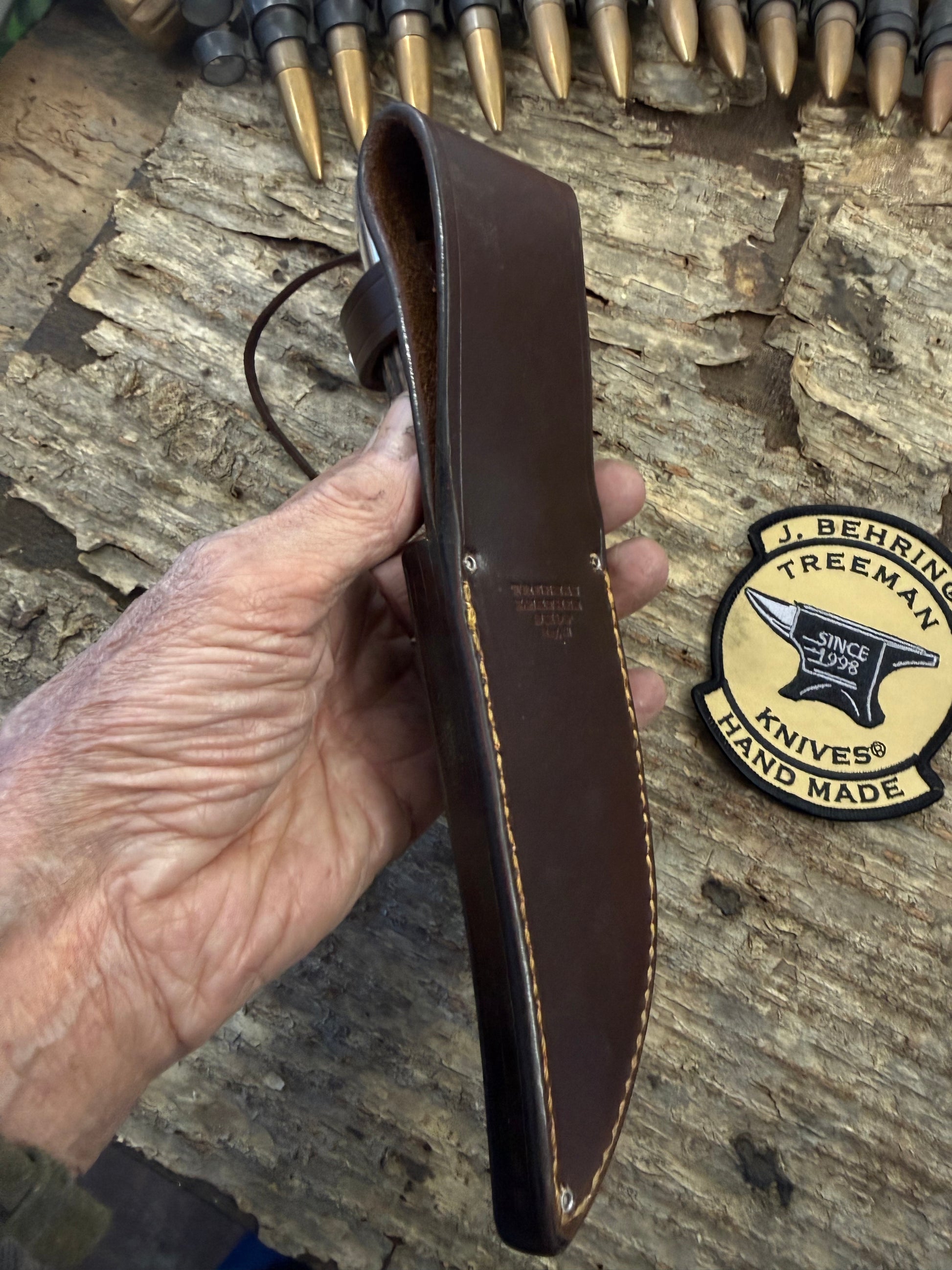 This Treeman Big Bay Hunter has a 5" hand forged hammer marked blade about .210 thick with a hollow grind made of 5160 spring steel. Guard is silver soldered nickel silver. Hidden tang runs almost to the end of the pinned aluminum crows beak butt. OAL is about 9 3/8" . Comes in a Giraffe belt sheath . Ready to ship. Thanks, Jim