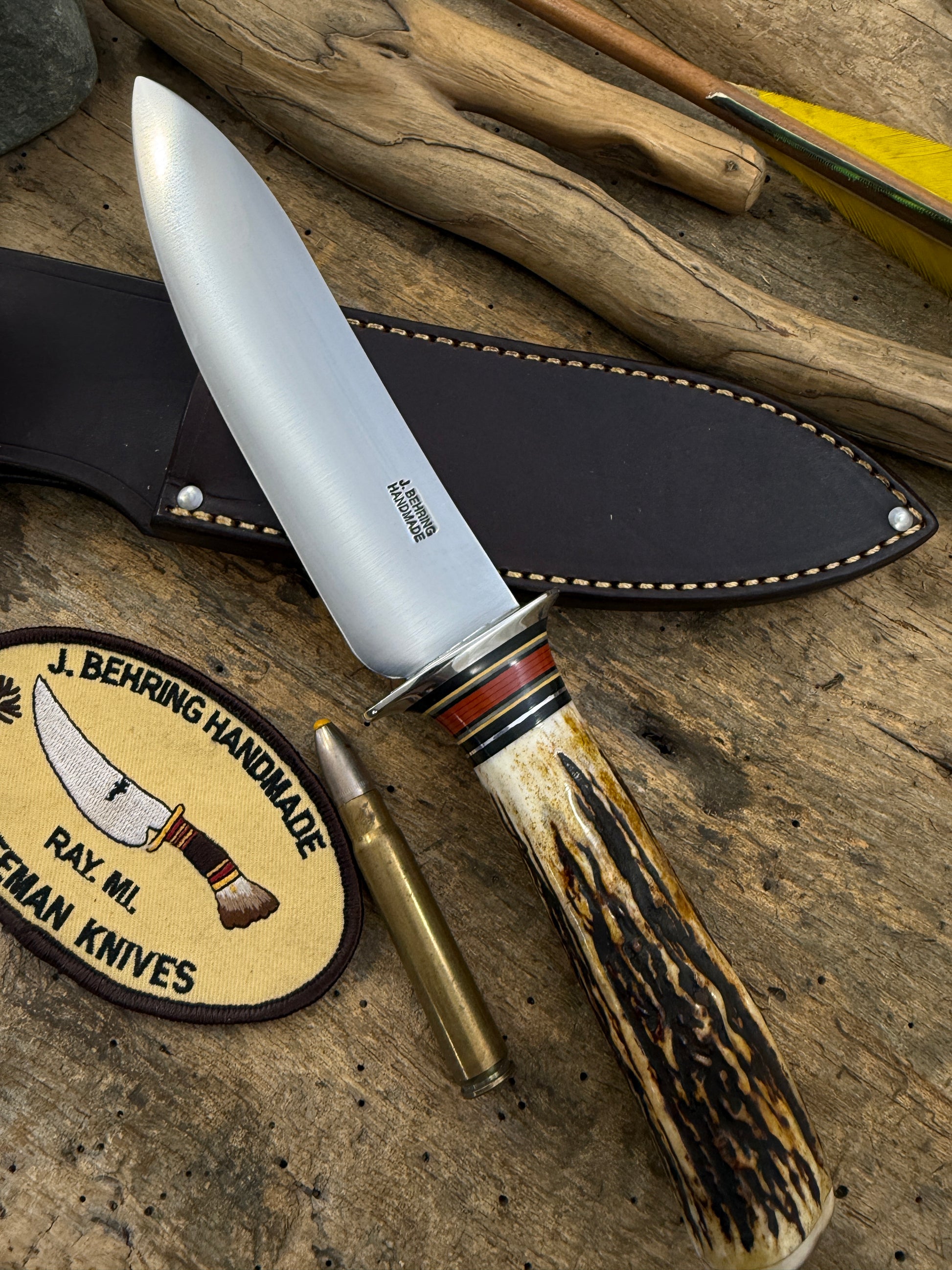 This old school Drop point hunter has a 6 " blade made of AEB-L stainless steel. Blade is razor sharp and about .090 thick. Super slicer for sure. Silver soldered nickel silver guard . Hidden tang sambar stag handle with a mammoth ivory butt cap. OAL is about 11". Comes in a top quality belt sheath. Thanks, Jim TMK