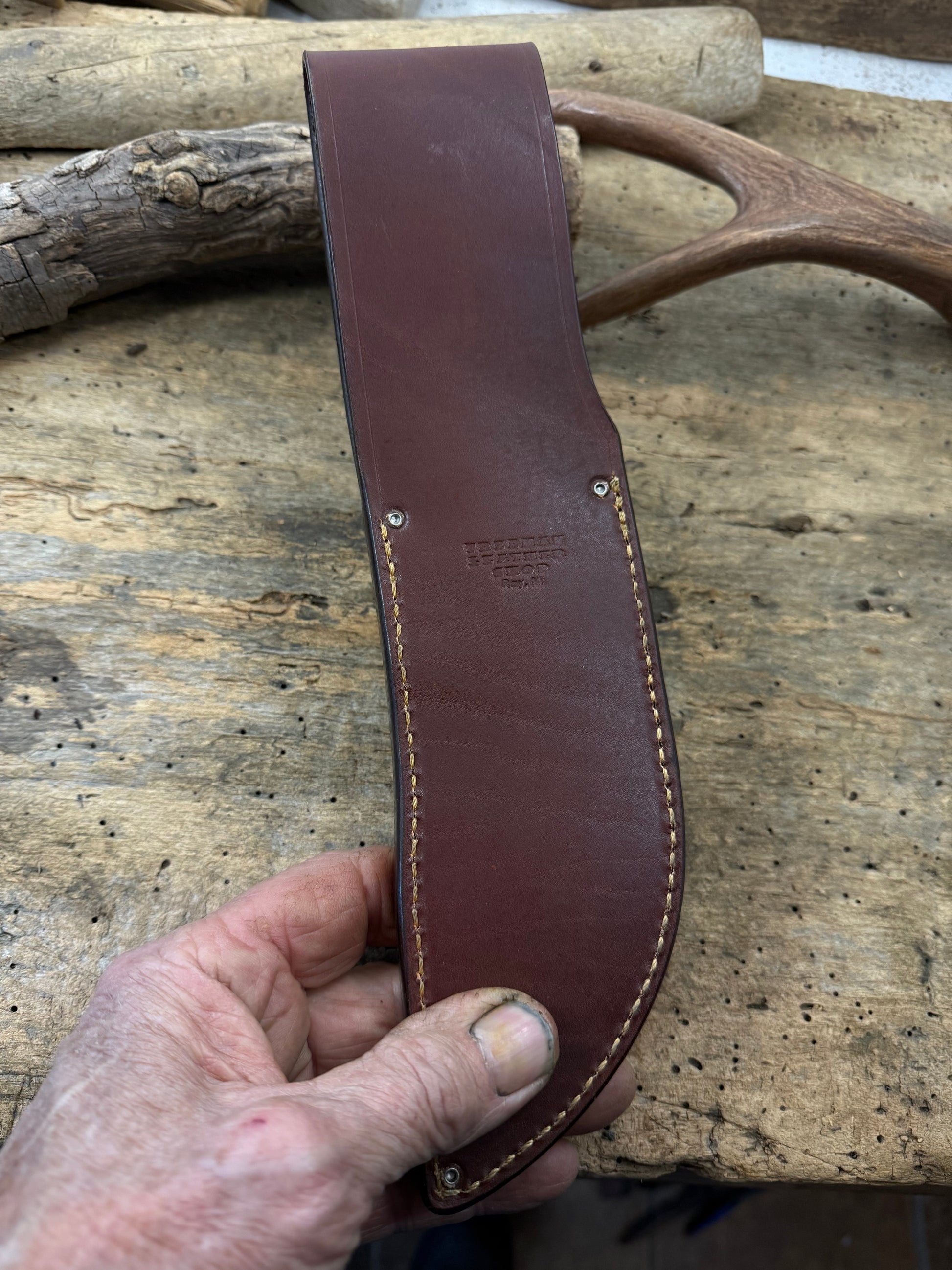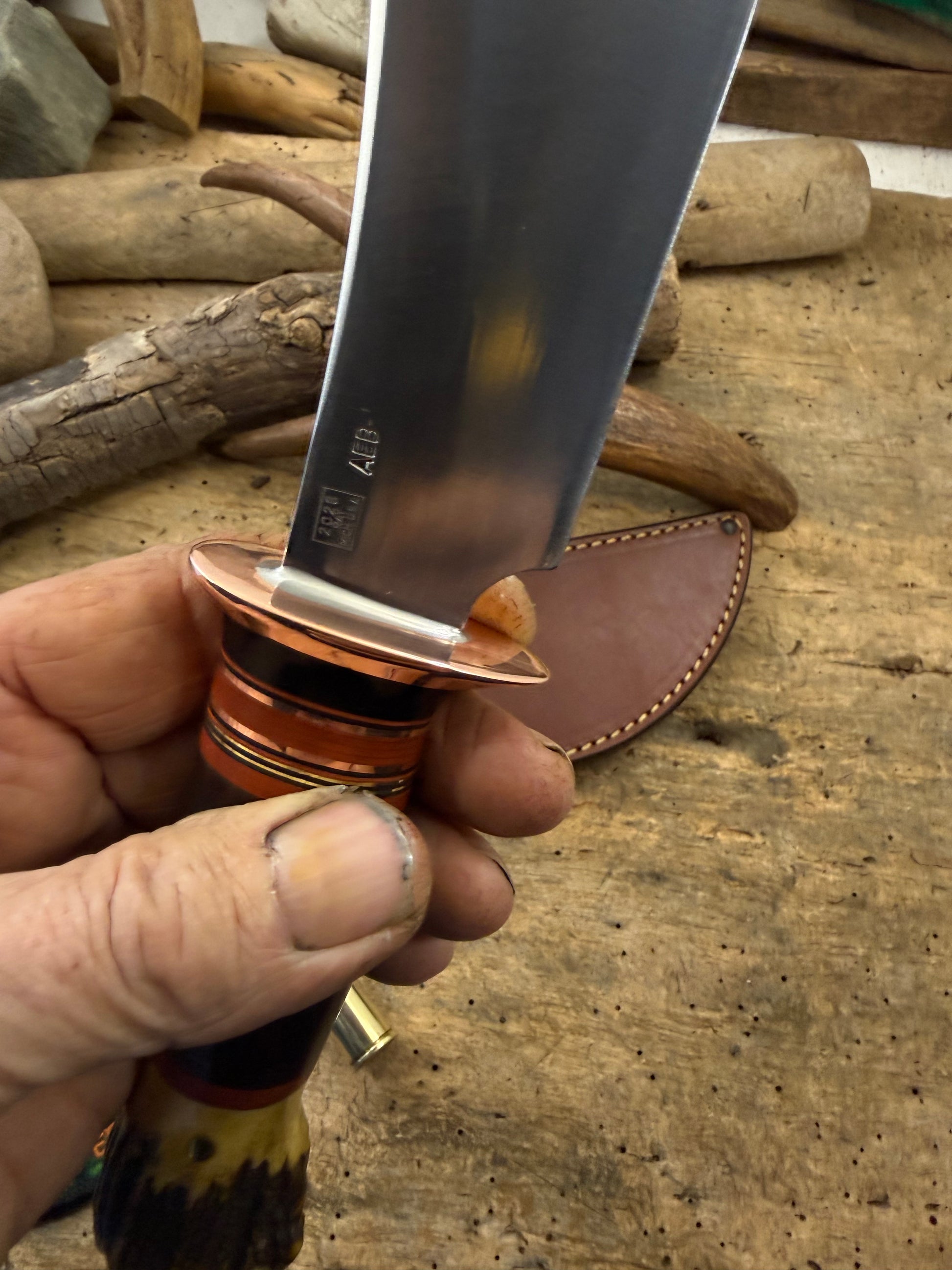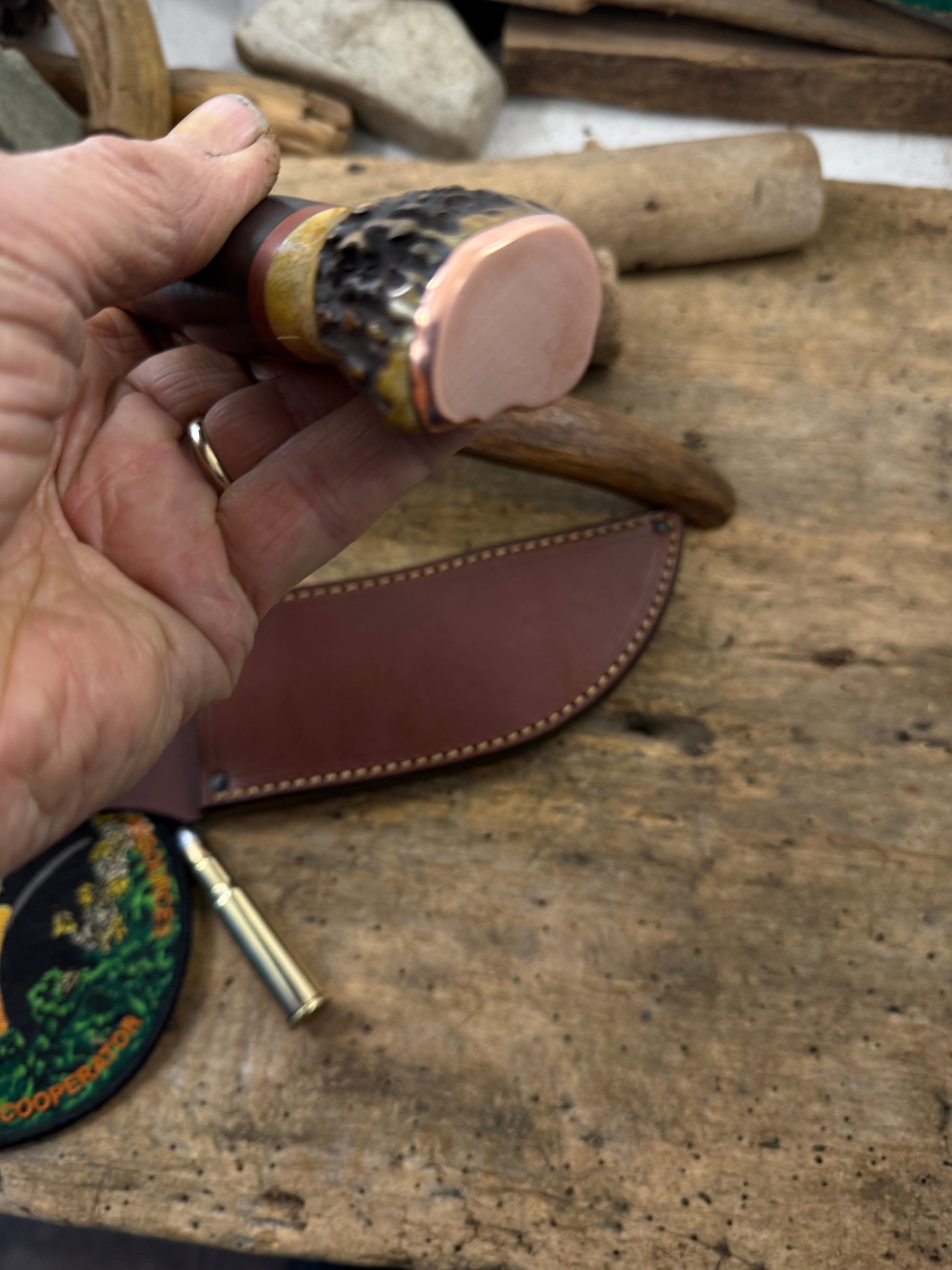 This is a very special Wood monk with copper hardware. I made this model up about 15 years ago. Blade is a cross between a Woodcraft and a Nesmonk skinner . This blade is 6" long and about .160 thick. Silver soldered Copper guard. Stacked horse hide handle with a sambar stag butt pinned with a copper butt cap, pined as well. OAL is about 11". Comes in a perfect fit belt sheath with black rivets. Ready to ship and one of only a few ever made. Thanks, Jim