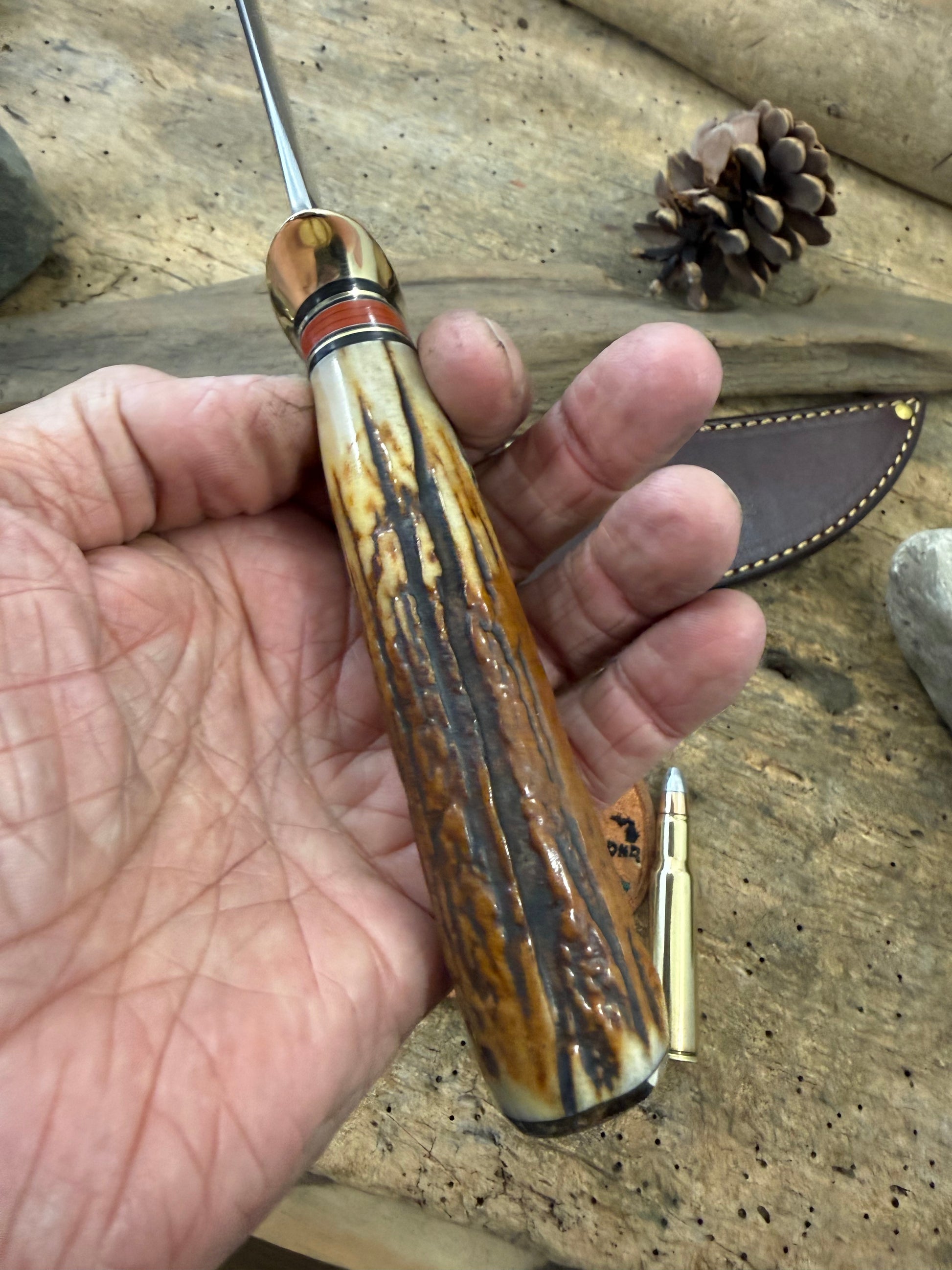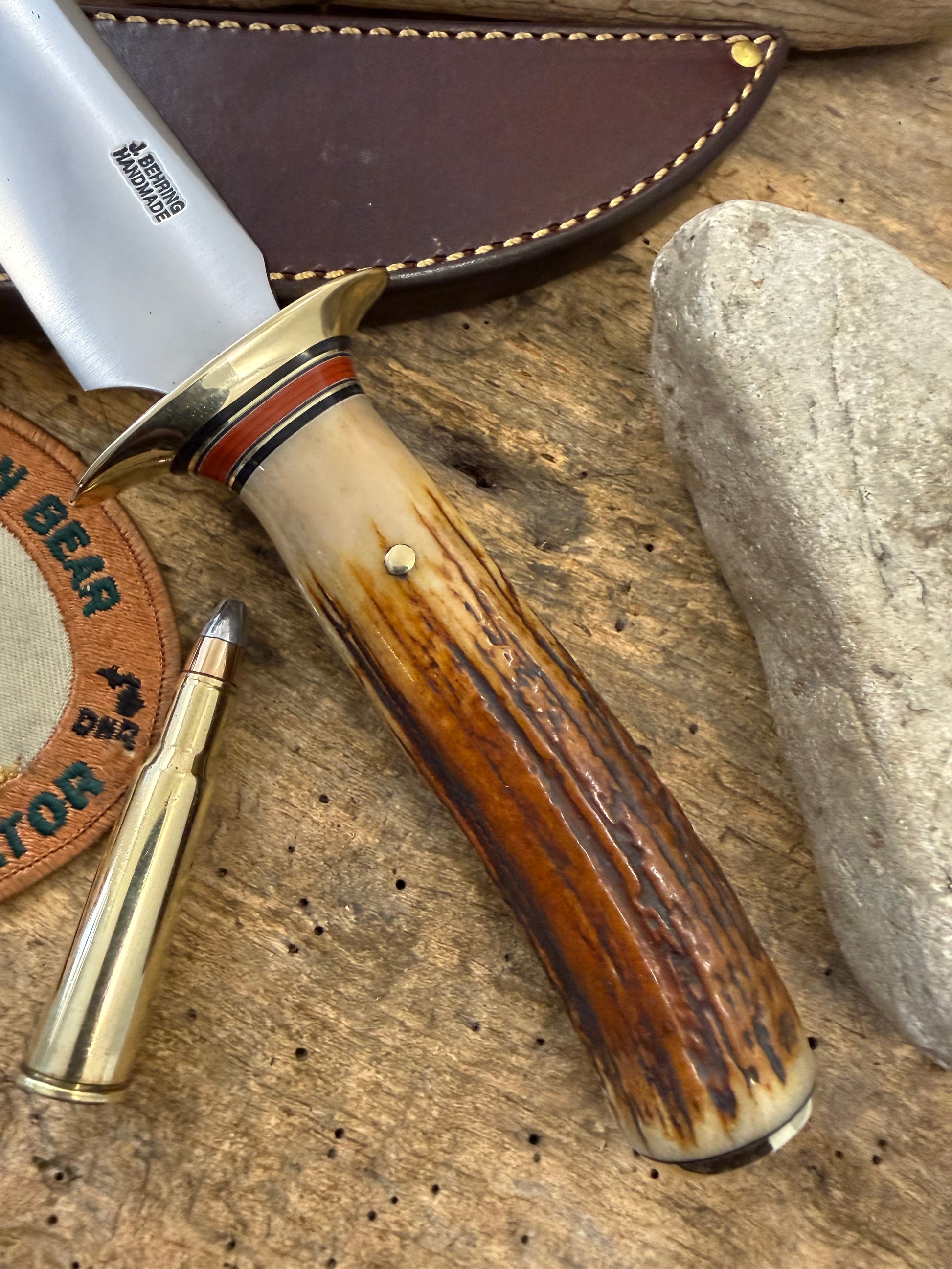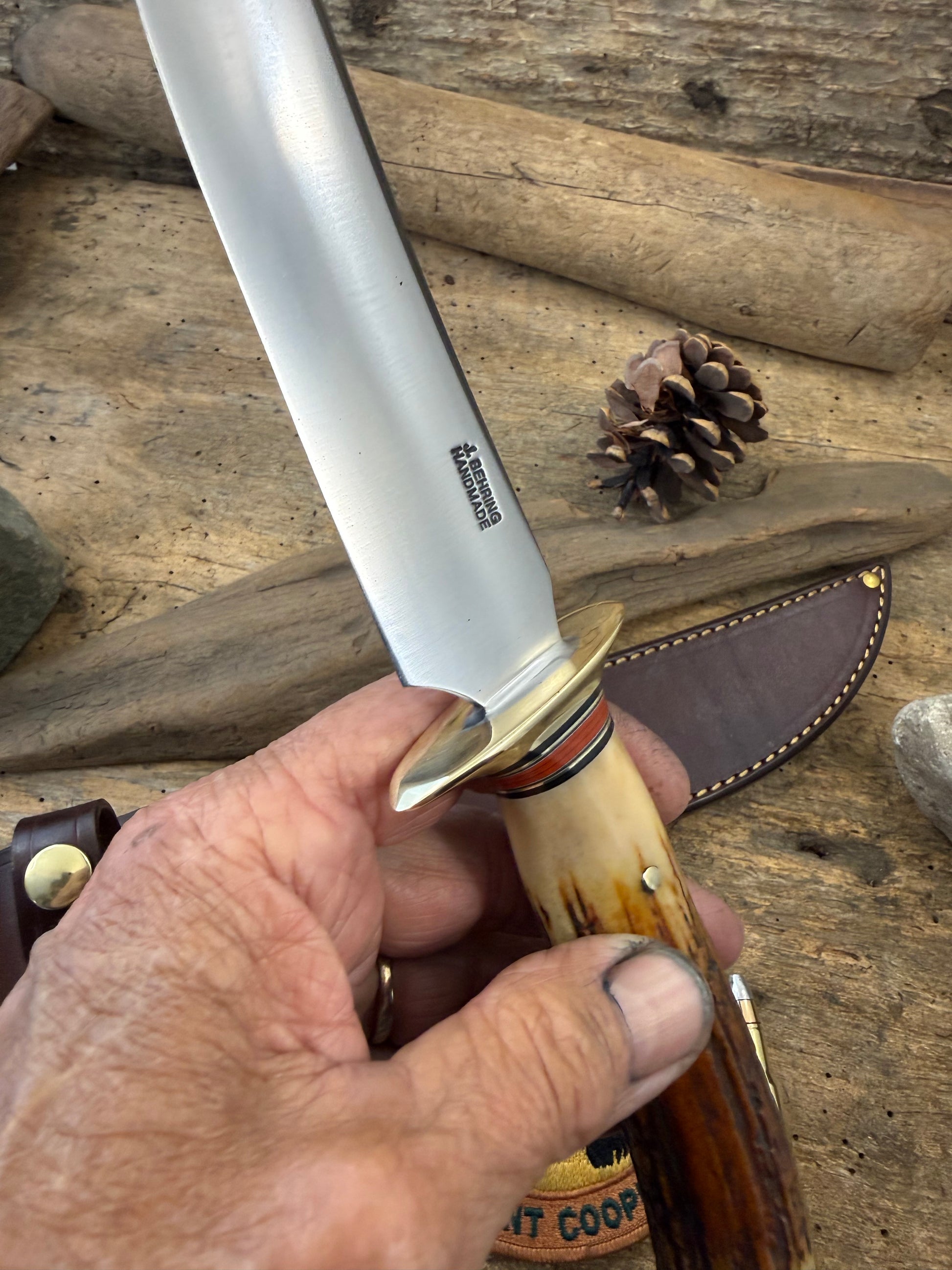 This wonderful camp fighter has a 7" hand forged 1095 steel convex ground blade. Silver soldered brass double guard. Pinned red stag handle with a pinned brass butt cap / OAL is about 12". Comes in a wide mouth belt sheath. Ready to ship. Thanks, Jim