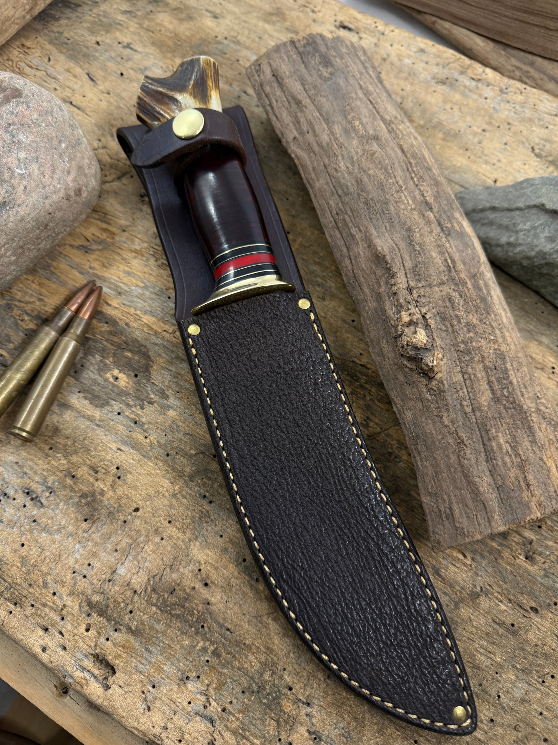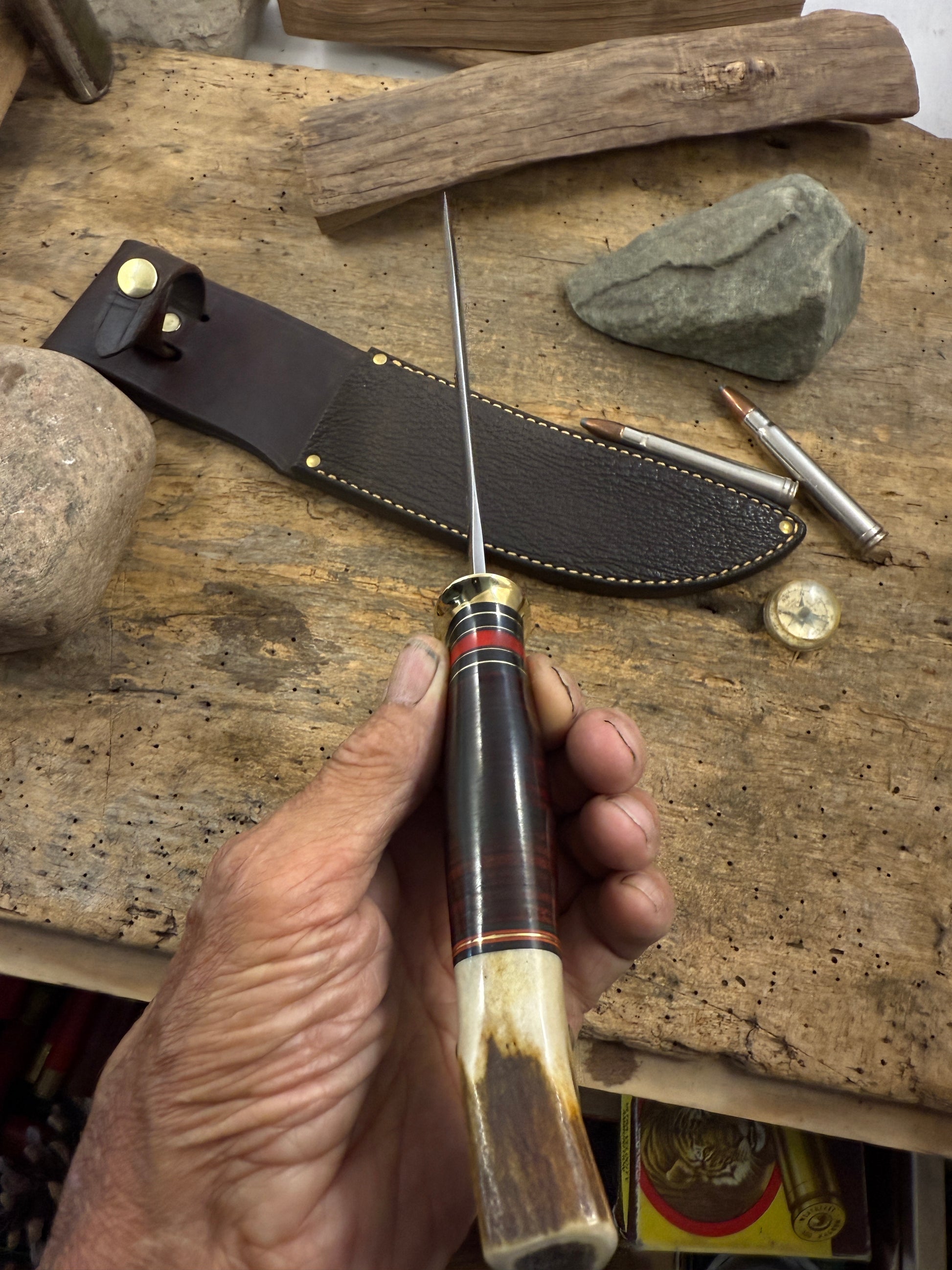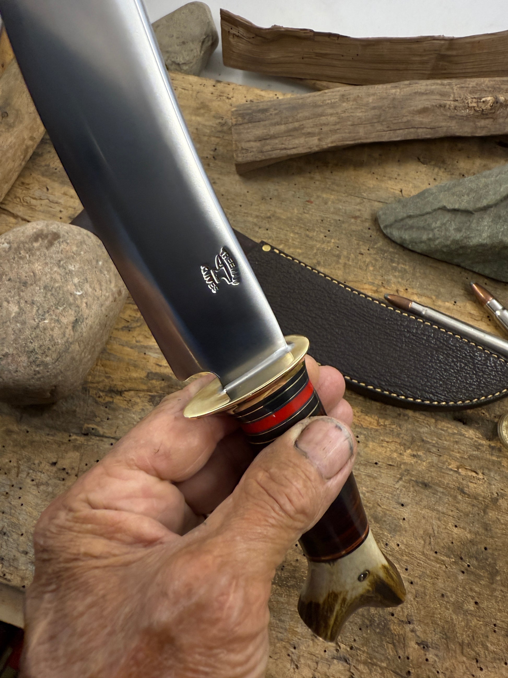 This Treeman has a 7 " hand forged blade with a brass silver soldered guard. Blade is 5160 and about .150 thick for a real slick slicer. Convex ground and has the Anvil stamp with USA 2025 on the back side. Handle is stacked horsehide with a nice spacer arrangement . Pinned hidden tang runs all the way back to the crotch stag butt. OAL is about 12 3/8". Comes is a shark sheath with rivets. Nice all around camp/hunter that's ready to ship. Thanks, Jim TMK