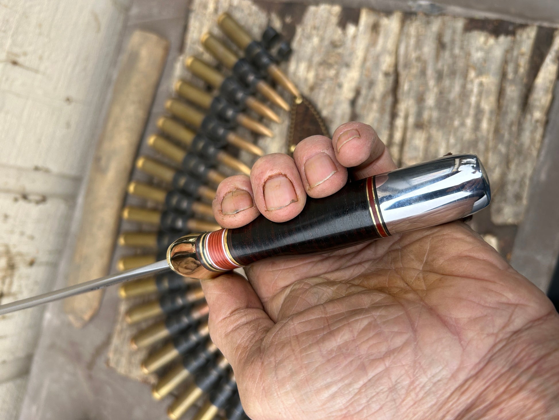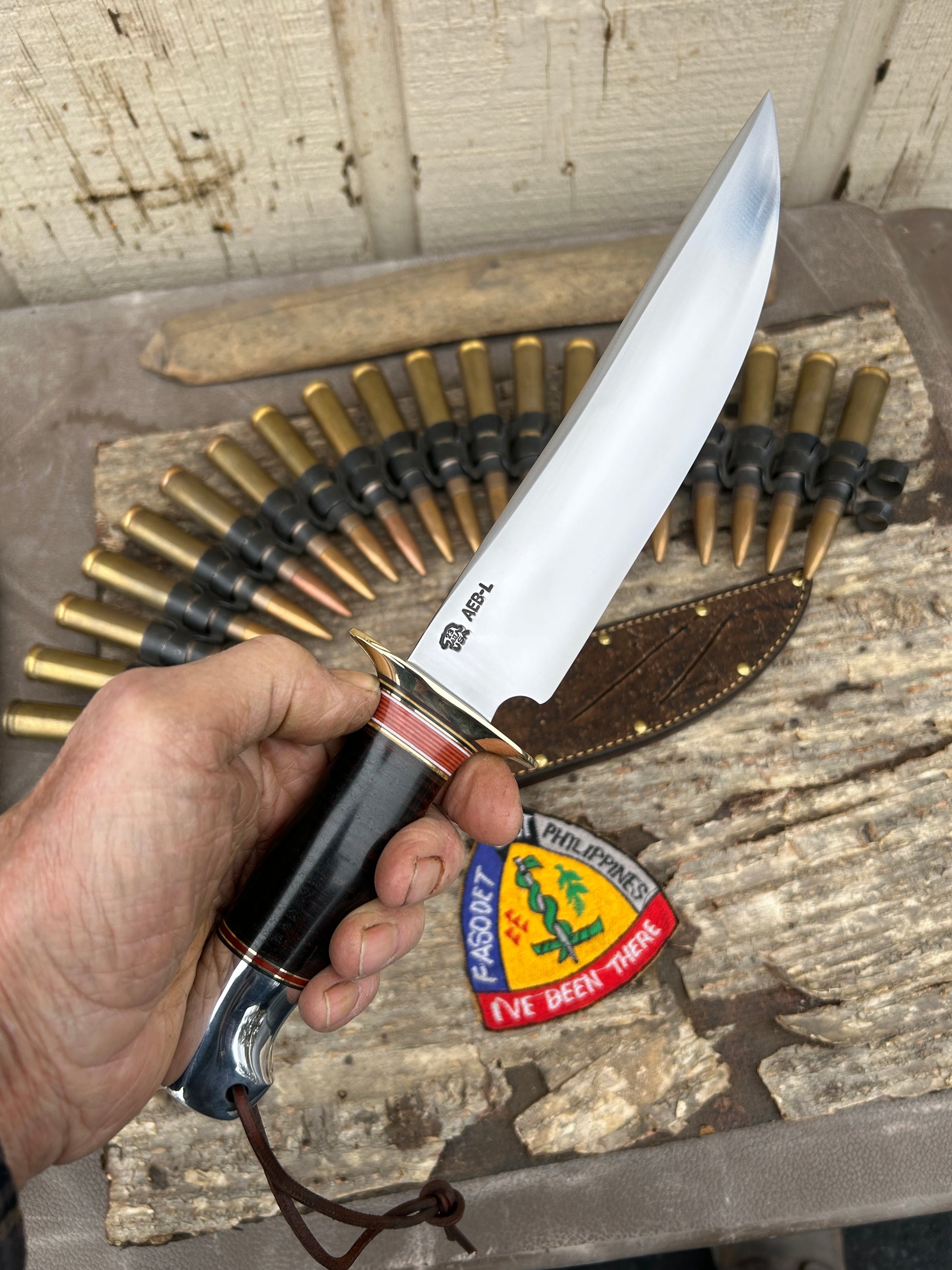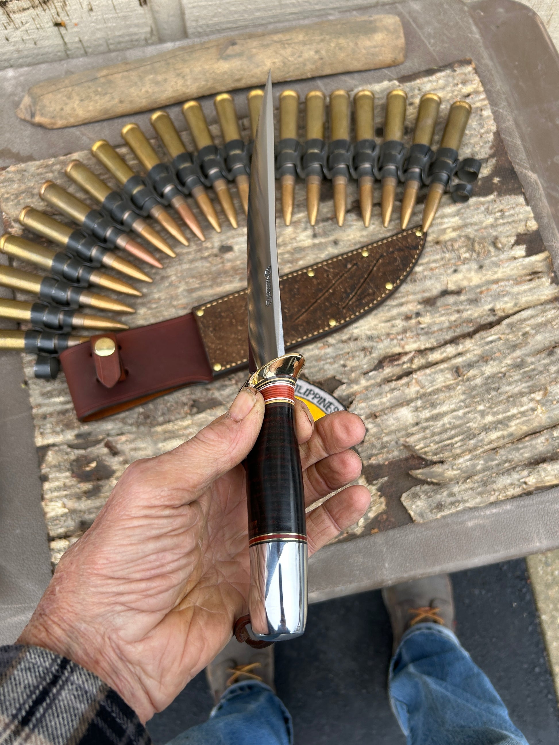 Heading says it all. Its a rock solid big ass fighter that will last a few life times . Blade is about .200 thick. Sharp as hell. Brass guard silver soldered. Tight stacked super durable horse hide with a pinned aluminum crows beak butt. OAL around 12 3/4". alanced and a feel in the hand not to many knives have. Giraffe Rocco sheath. Ready to ship. Jim