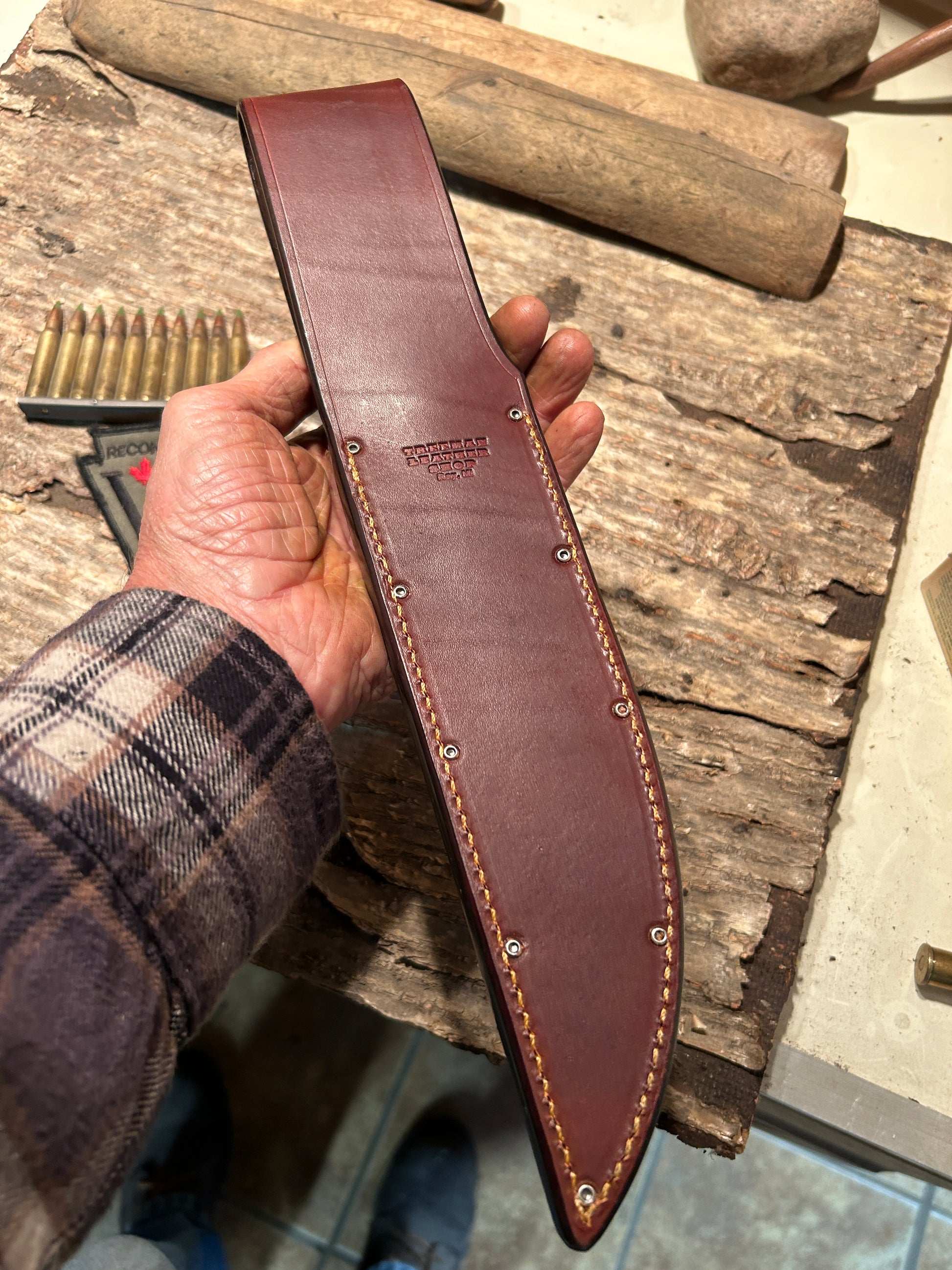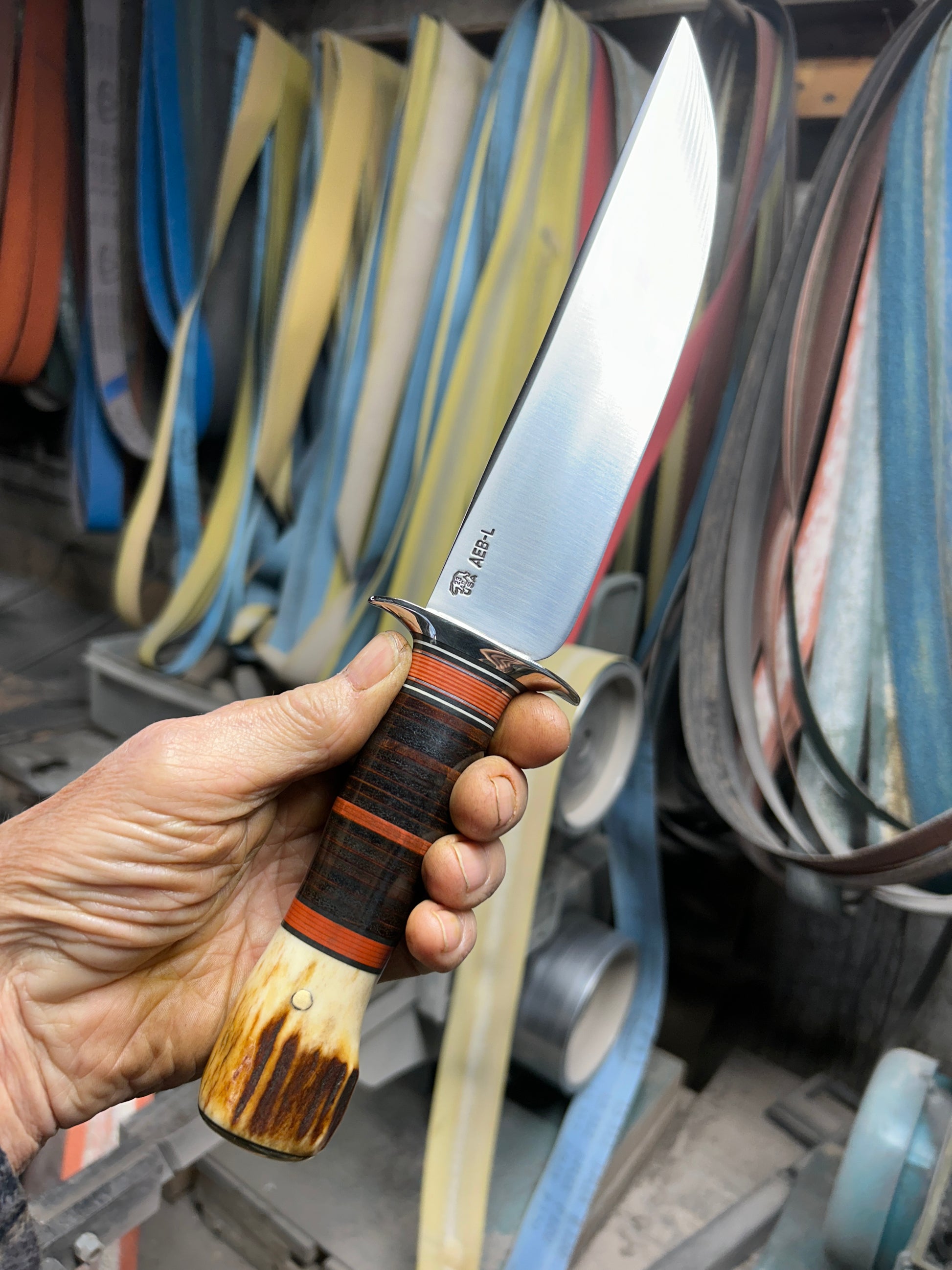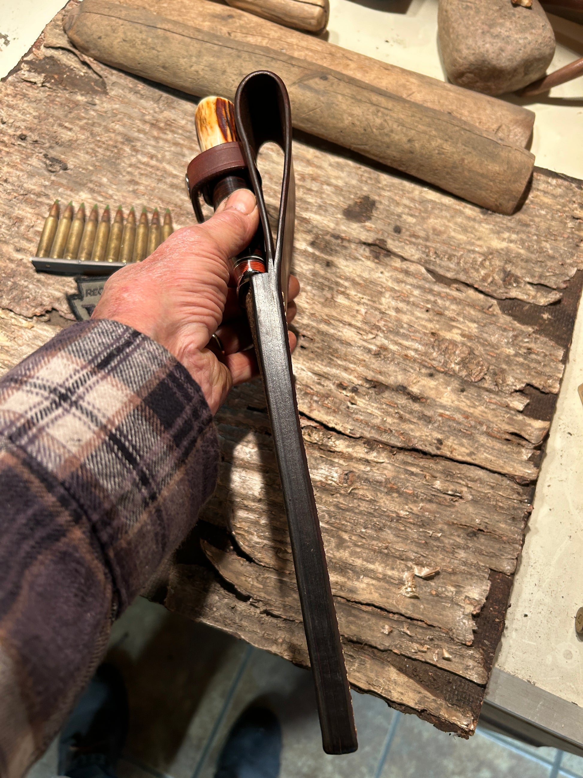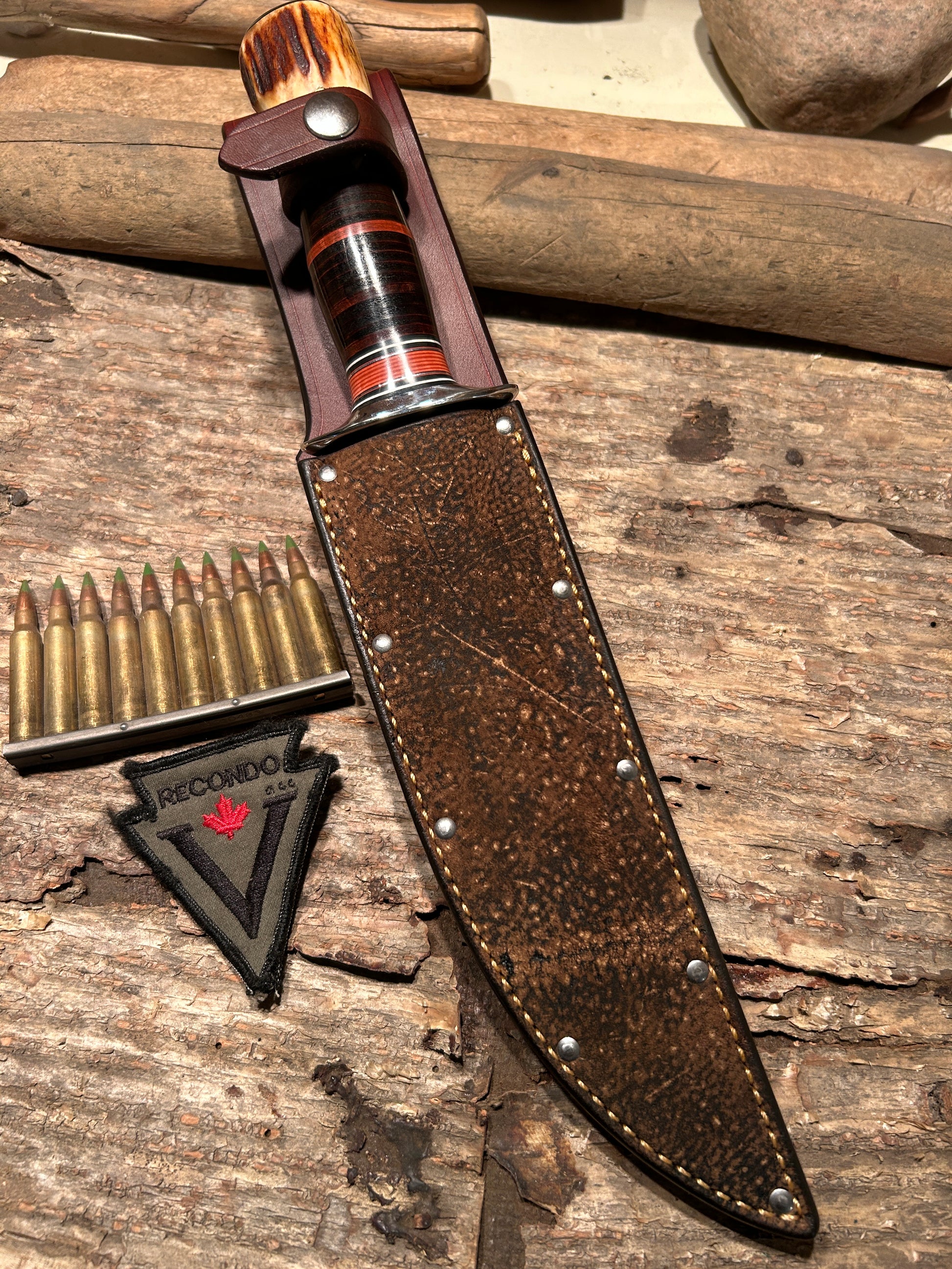 This J. Behring Handmade double skull fighter has an 8" blade about .190 thick. Convex ground for strength and a razor edge. AEB-L stainless cero tempered and will not rust or stain. Its comparable to ball bearing 52-100 carbon steel. Silver soldered nickel guard . Hidden tang runs almost to the end of the red stag crowns beak butt with a pinned domed brass cap to finish it of nicely. Handle is durable stacked horse hide with a one off spacer arrangement. OAL is about 13 3/8". Comes in a made to fit Giraffe hide sheath with stainless steel rivets.  Badd ass fighter ready to go now. Thanks, Jim