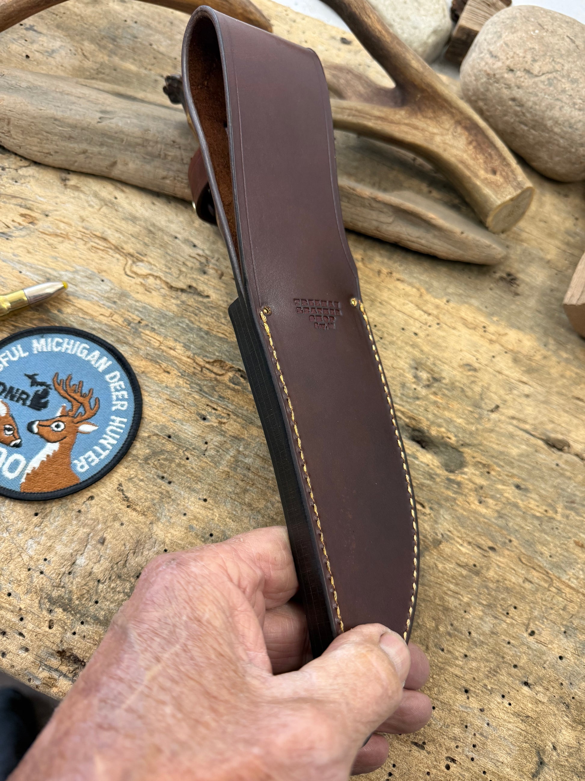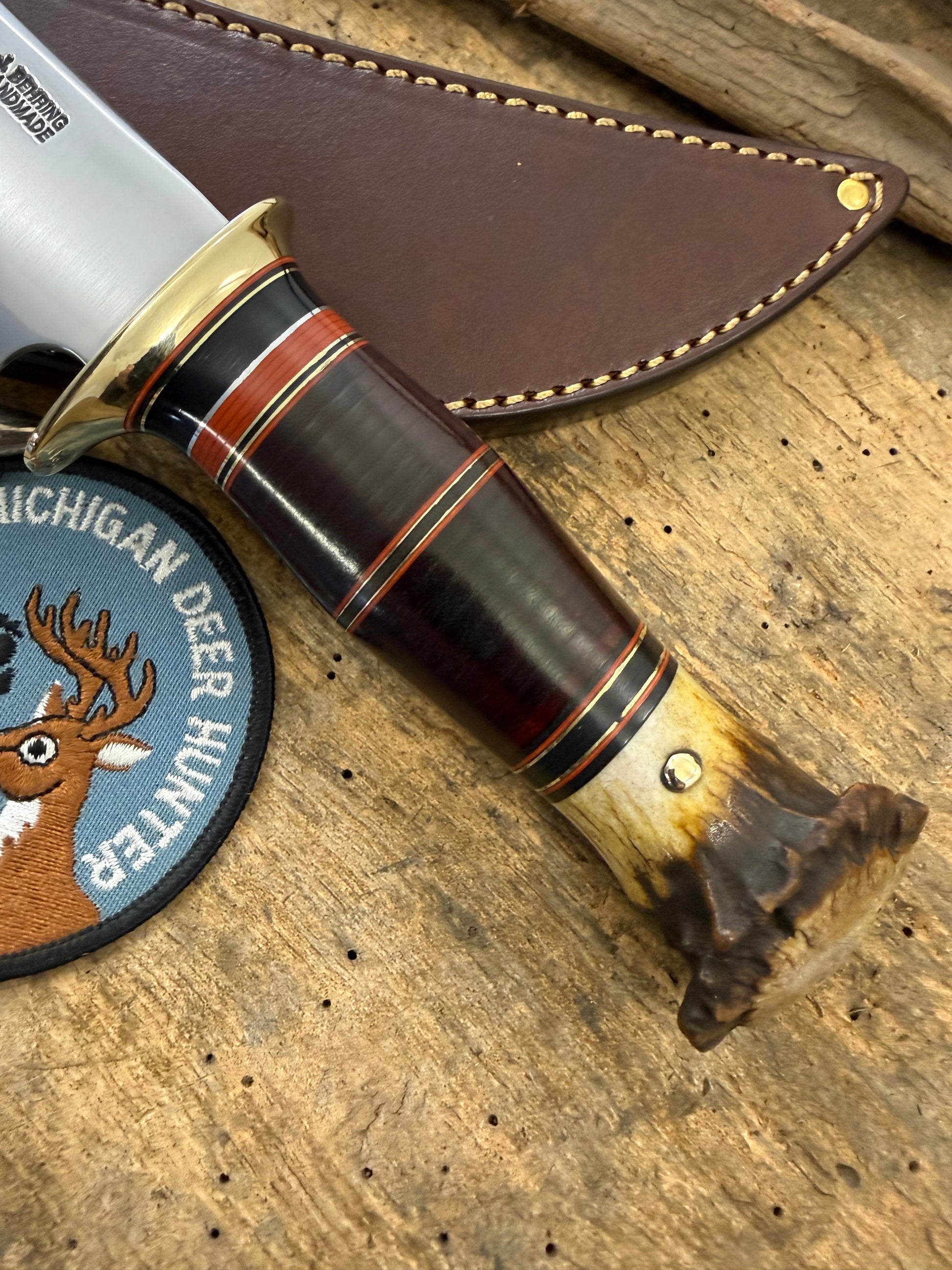 This Treeman Old School Big 6" crown stag hunter has a hand forged .190 thick 1095 steel convex ground blade . Silver soldered brass guard / Hid tang pinned crown stag with old school spacer pattern. Horse hid is 3 times tougher than cow hide and 3 times the cost. Last a life time and more. Priced to sell and ready to ship. Thanks, Jim