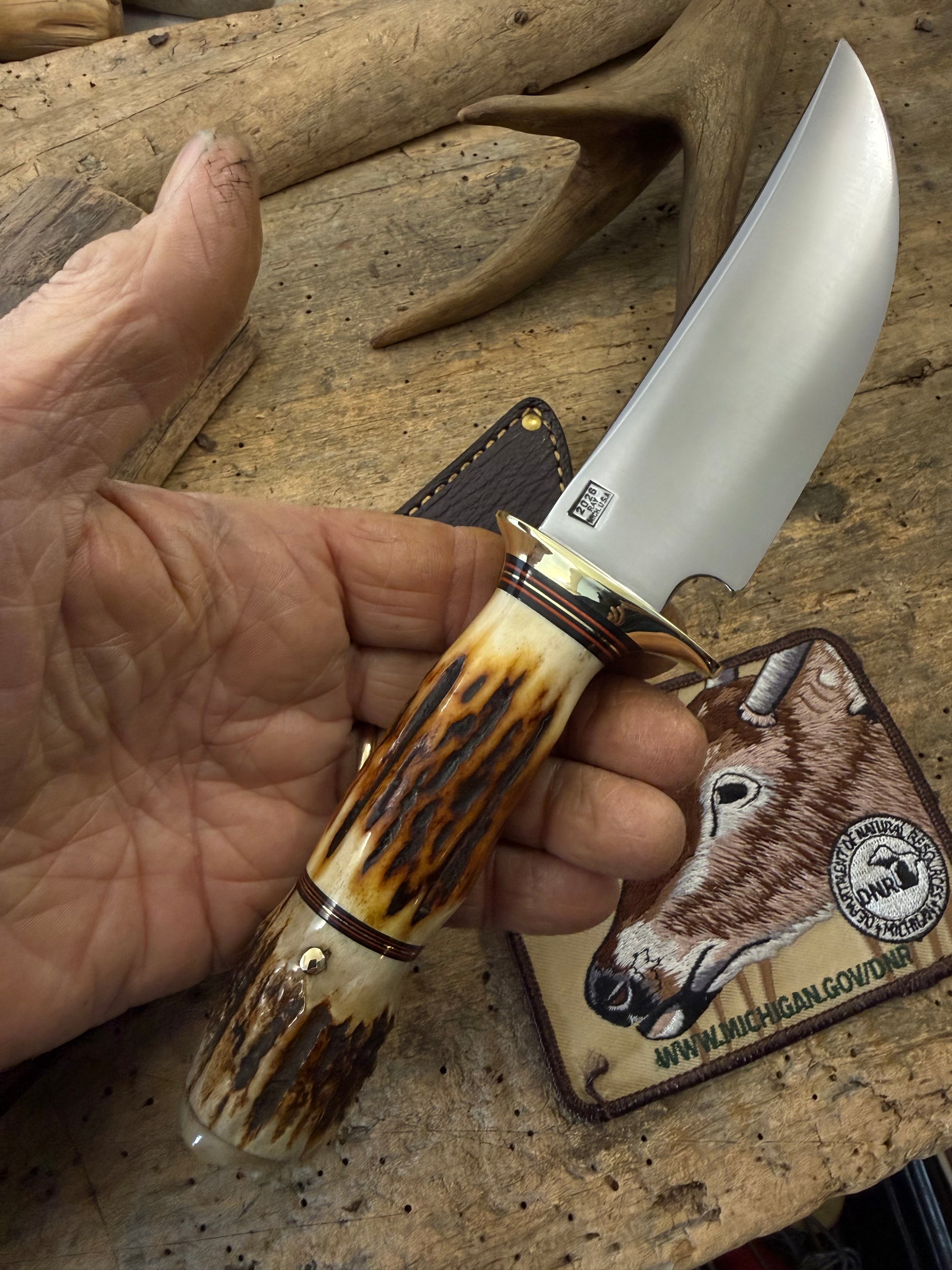 This Treeman Big Bay Hunter has a heavy duty hand forged blade 5" .250 thick convex ground blade with choil. The silver soldered guard is cartridge quality brass .Hidden tang handle is Stag Stag sambar with a pinned butt and sheep horn butt cap. OAL is about 9 1/2". Comes in a perfect fit shark faced belt sheath. Thanks, Jim