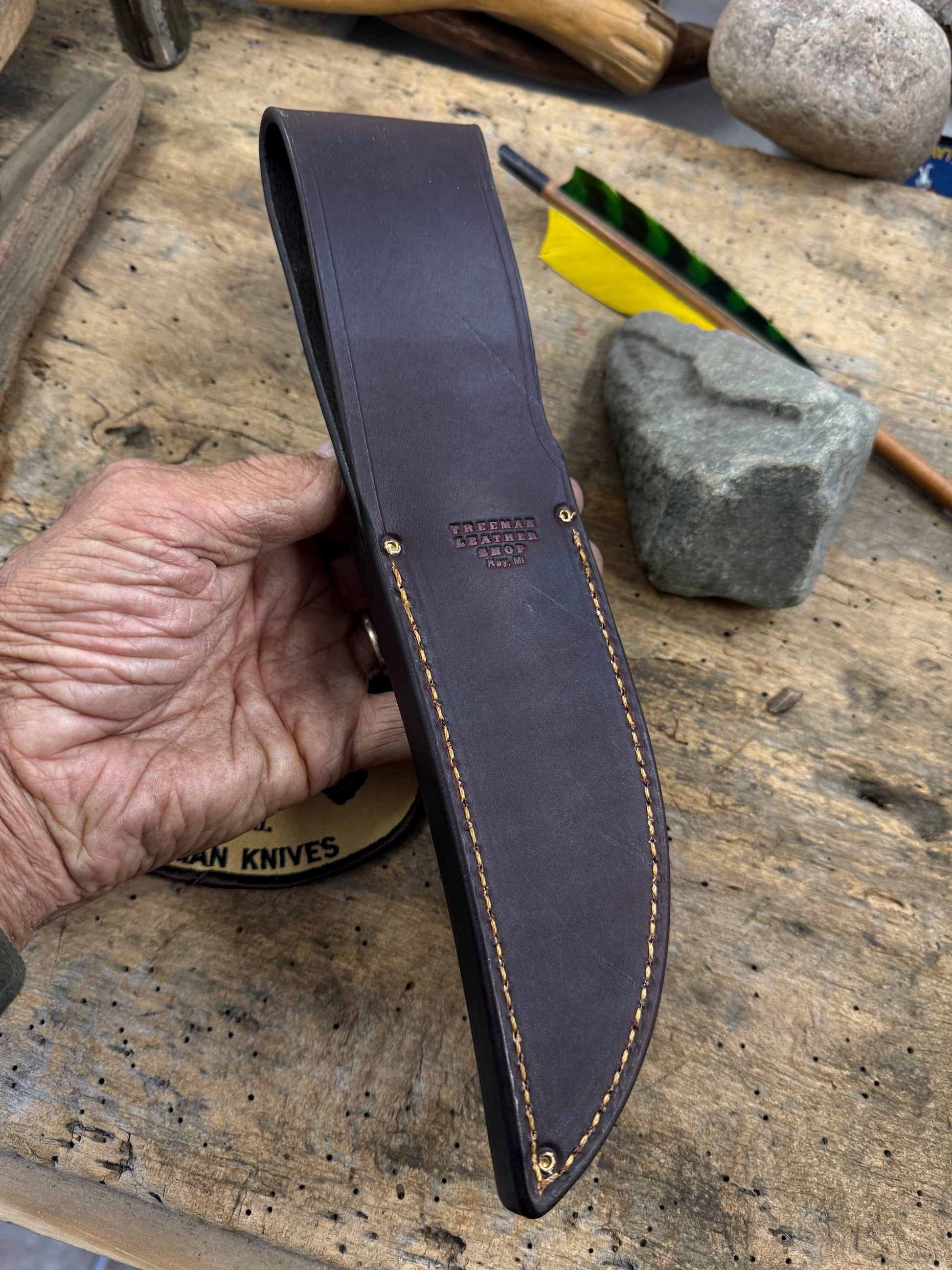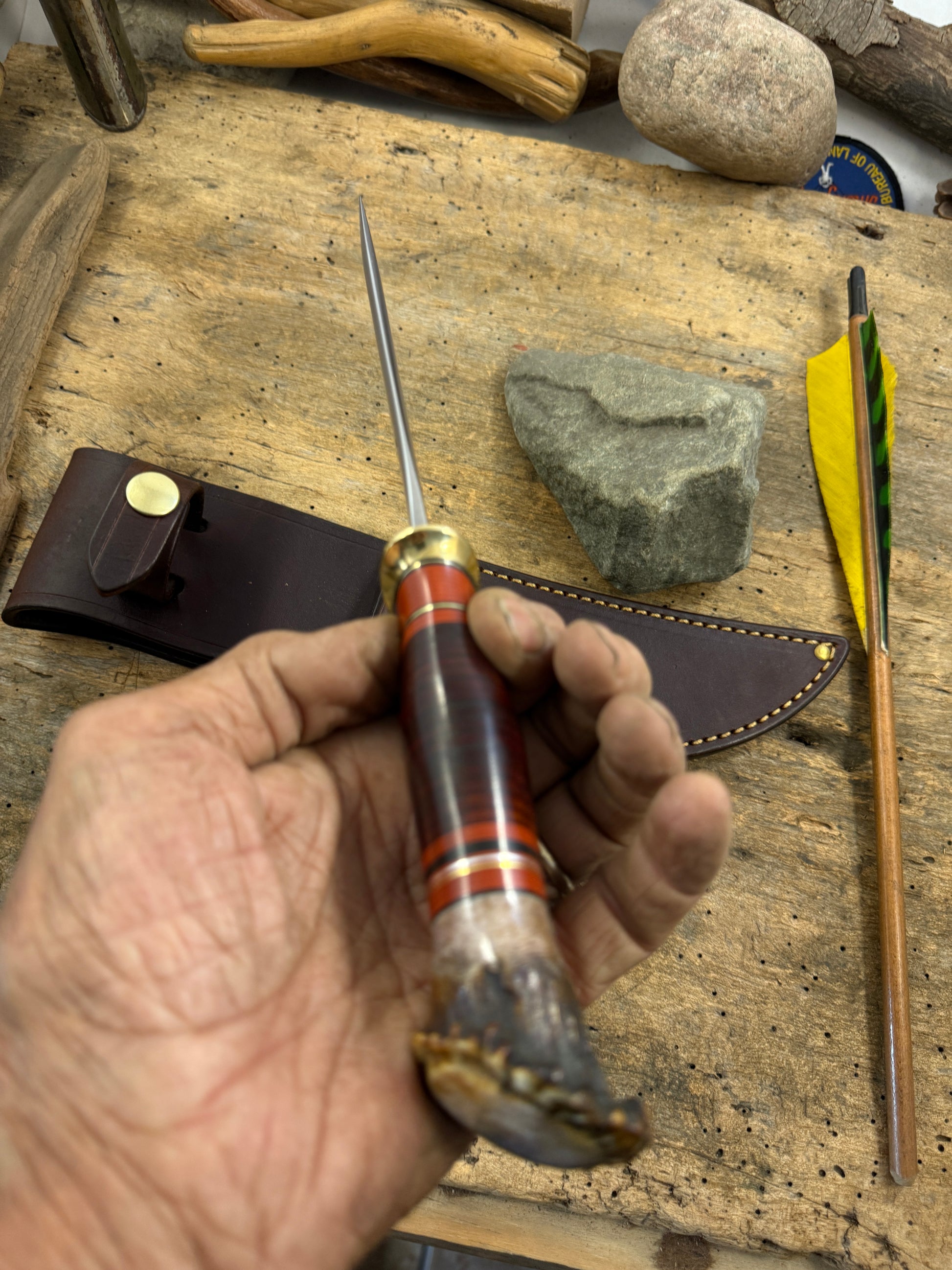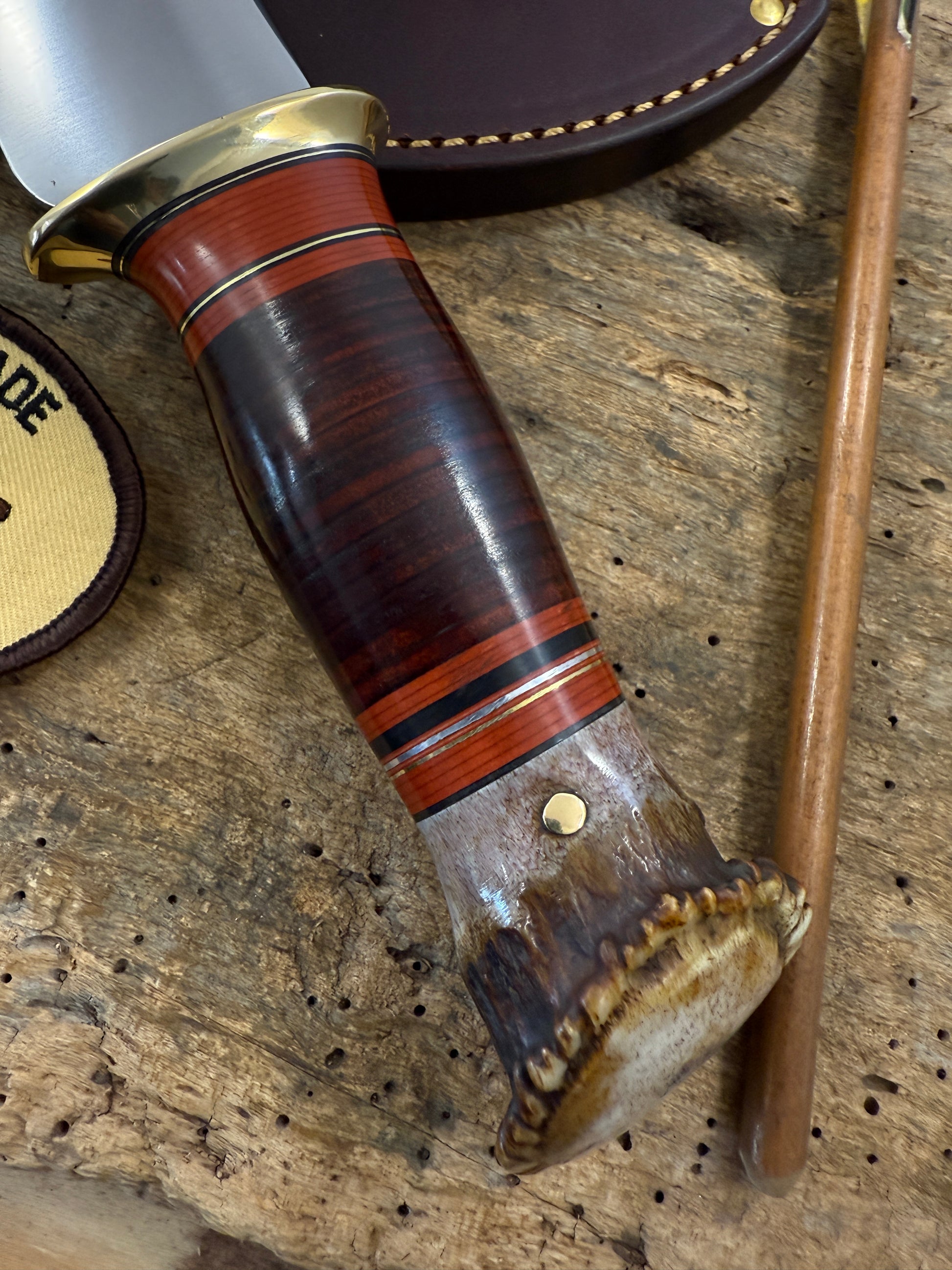 This Treeman has a 5 3/4" hand forged blade made of Pop's Pro Cut steel. Its supposed to be the latest and greatest steel . I can say it sure finished up nice. The guard is silver soldered brass . Perfect fit and finish and has a hidden tang pinned horse hide and crown stag handle . OAL is about 10 1/2". Blade thickness is about 3/16. Sheath is made to fit with 3 rivets as every sheath should be except fighters. Top quality leather with a slick burnish and stitch. Thanks, Jim TMK