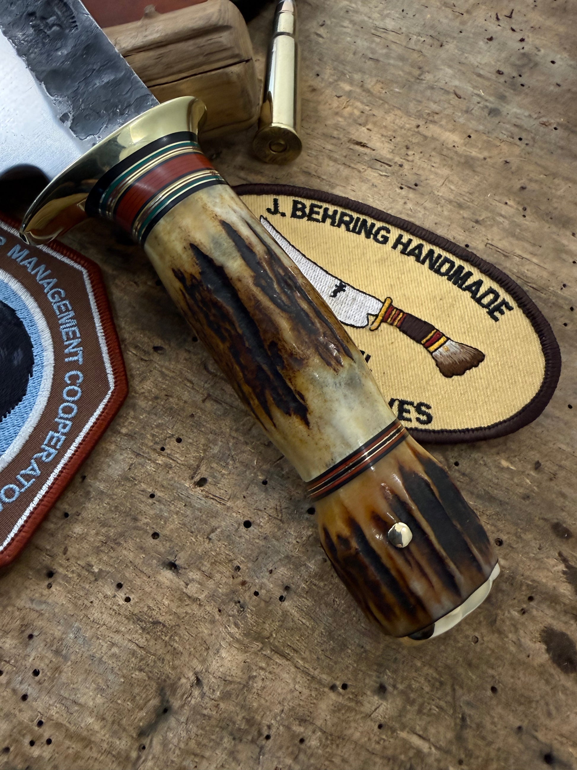 This is my favorite knife out of the last batch of 24 I made. Big heady duty Woodcraft 6 3/8" hand forged 1095 .250 thick hammer marked hollow ground blade. Used the anvil stamp on this 2026 date stamped knife . Guard is silver soldered cartridge quality brass. Hidden tang handle is primo Sambar stag/stag with a pinned butt cap. Just a cool knife with some green spacers mixed in . Great temper line on the blade. Comes in a made to fit antiqued finished belt sheath. Might just keep this one for my meager collection. Thanks, Jim