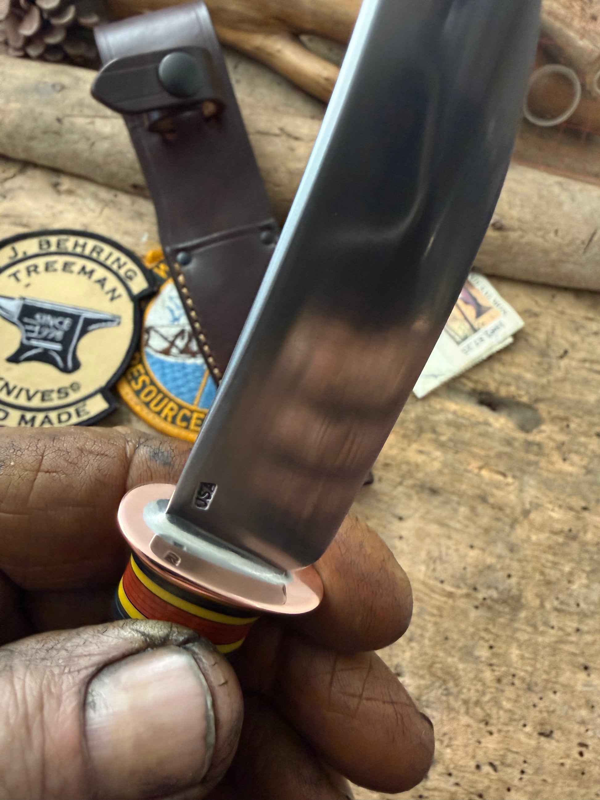 This gem has a 3 7/8" hand forged blade made of 1095 steel. Silver soldered copper guard. Stacked horse hide with the new Tuscan yello spacers . Crotch stag pinned butt. OAL is about 7 7/8". Comes in a made to fit belt sheath with black rivets. Thanks, Jim