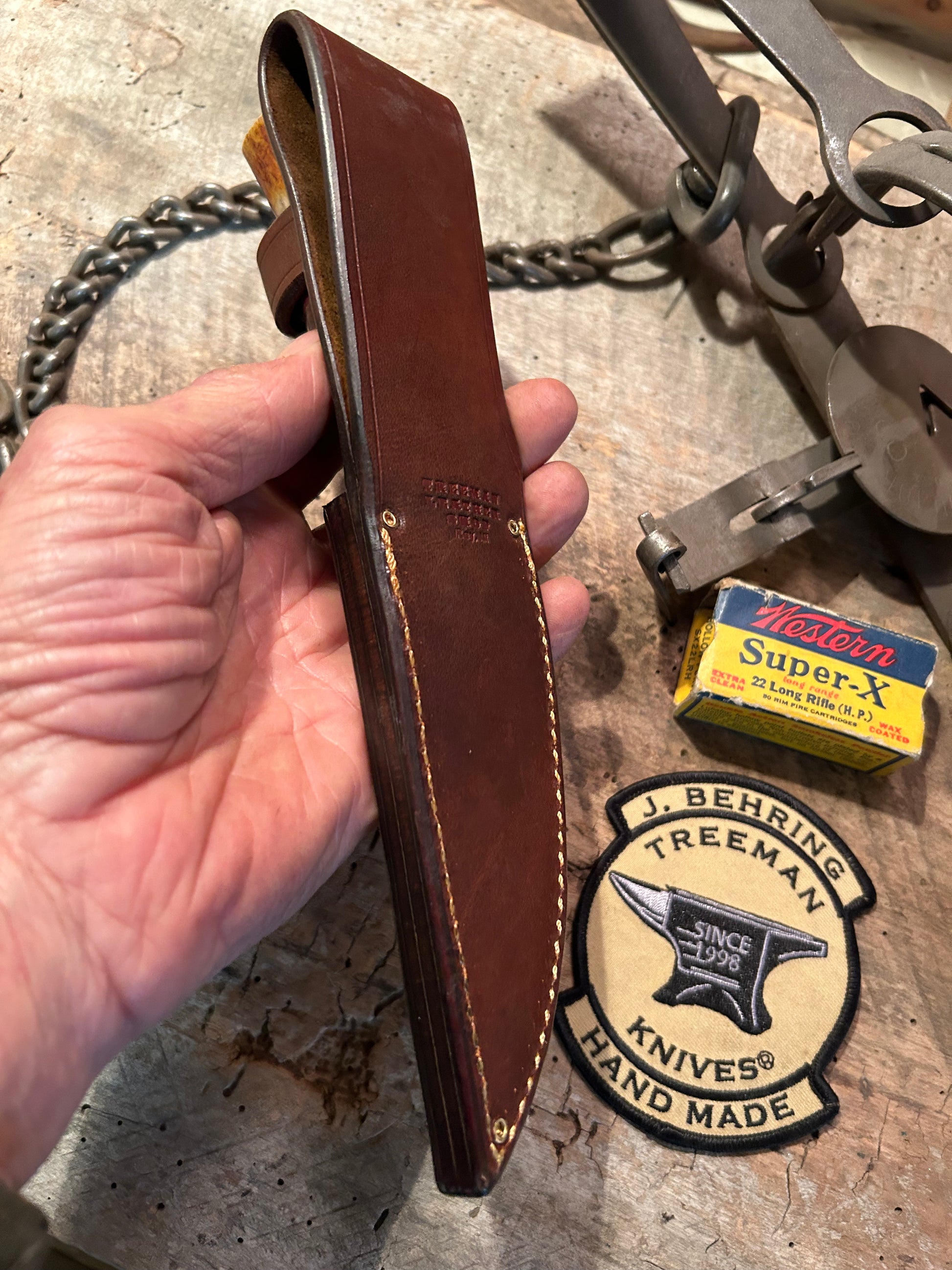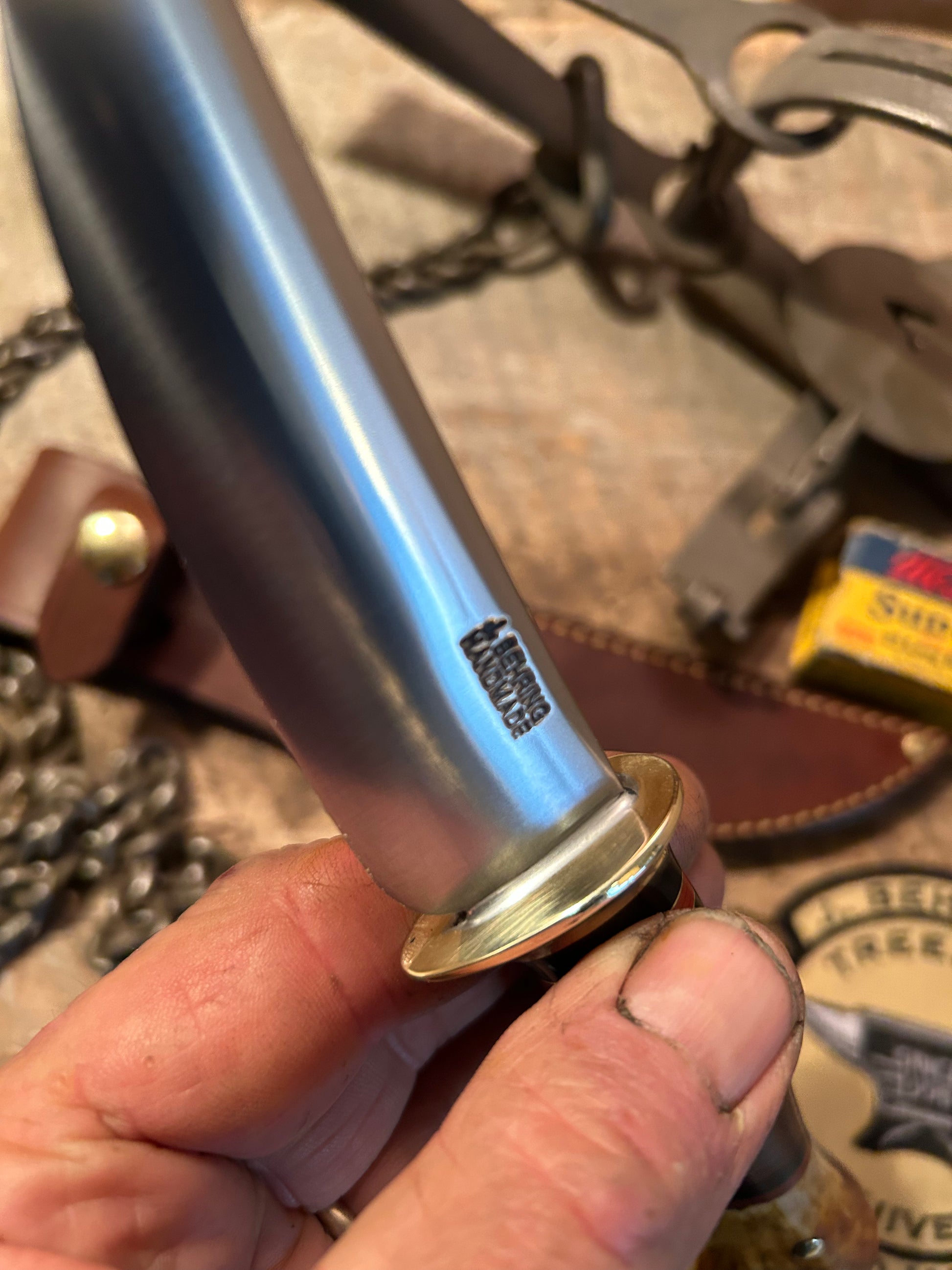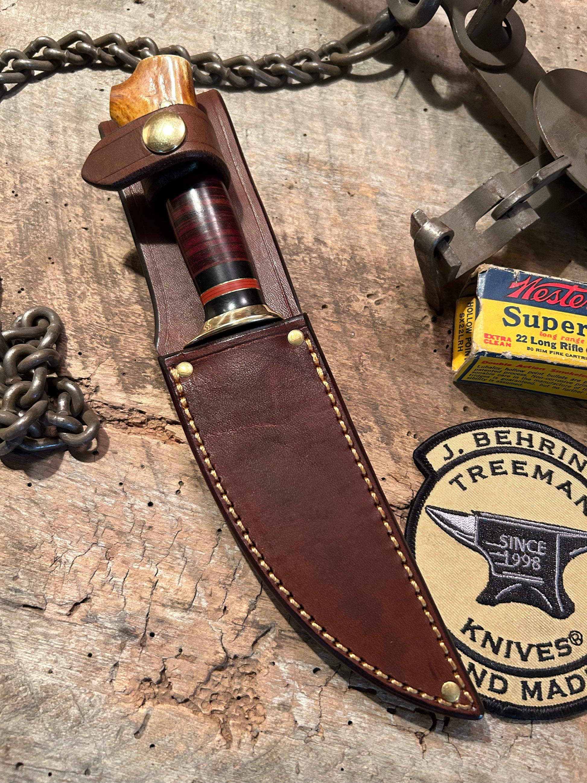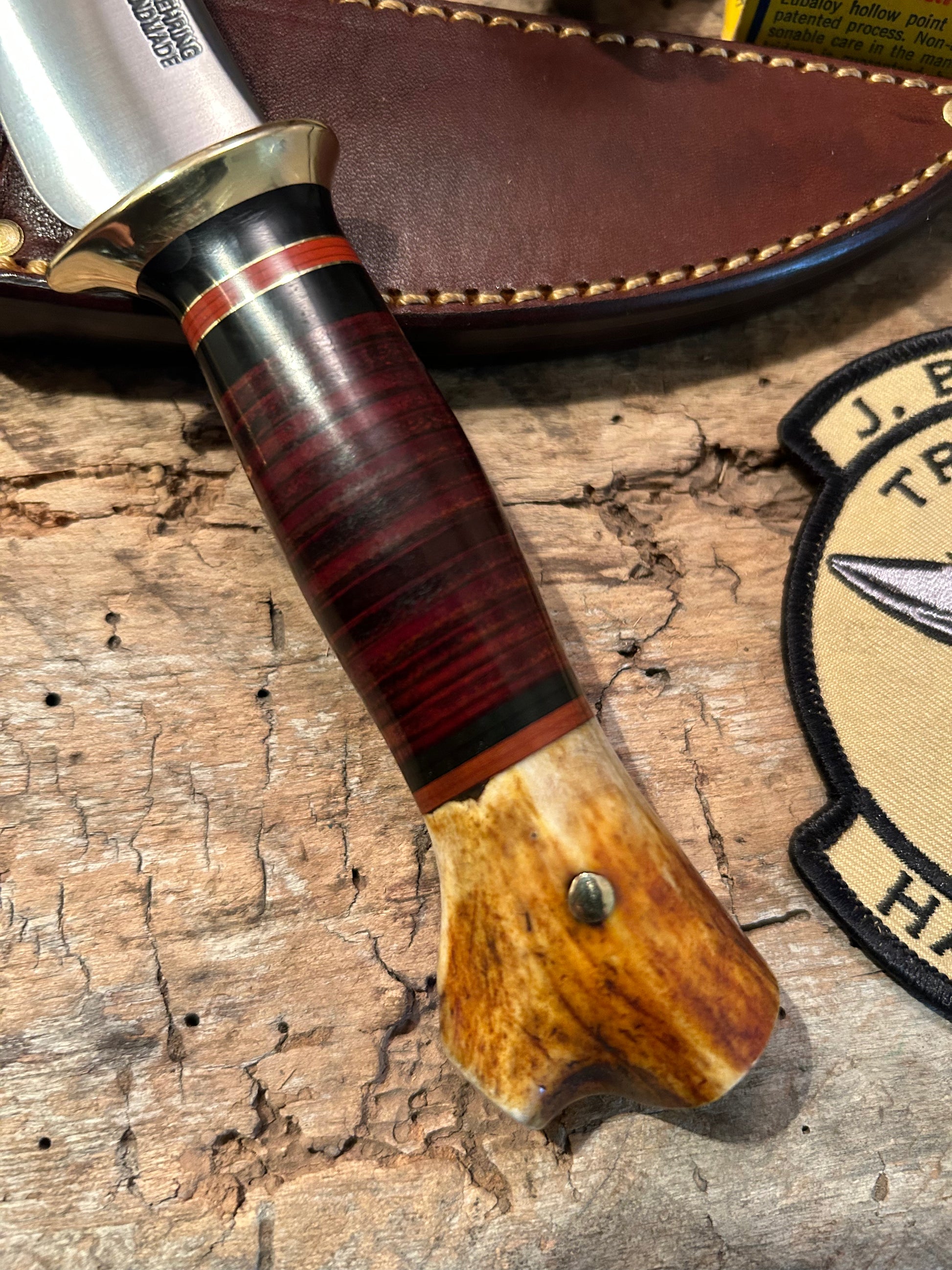 This J. Behring handmade Deer & Trout Sticker has a 4" hand forged 1095 blade with a silver soldered brass guard. The hidden tang handle has super tough horse hide hand cut and a cool spacer stack with a pretty little white tail croych stag pinned butt. Sheath made to fit perfect. Great little all around every day knife with a wonderful price tag.  Thanks, Jim