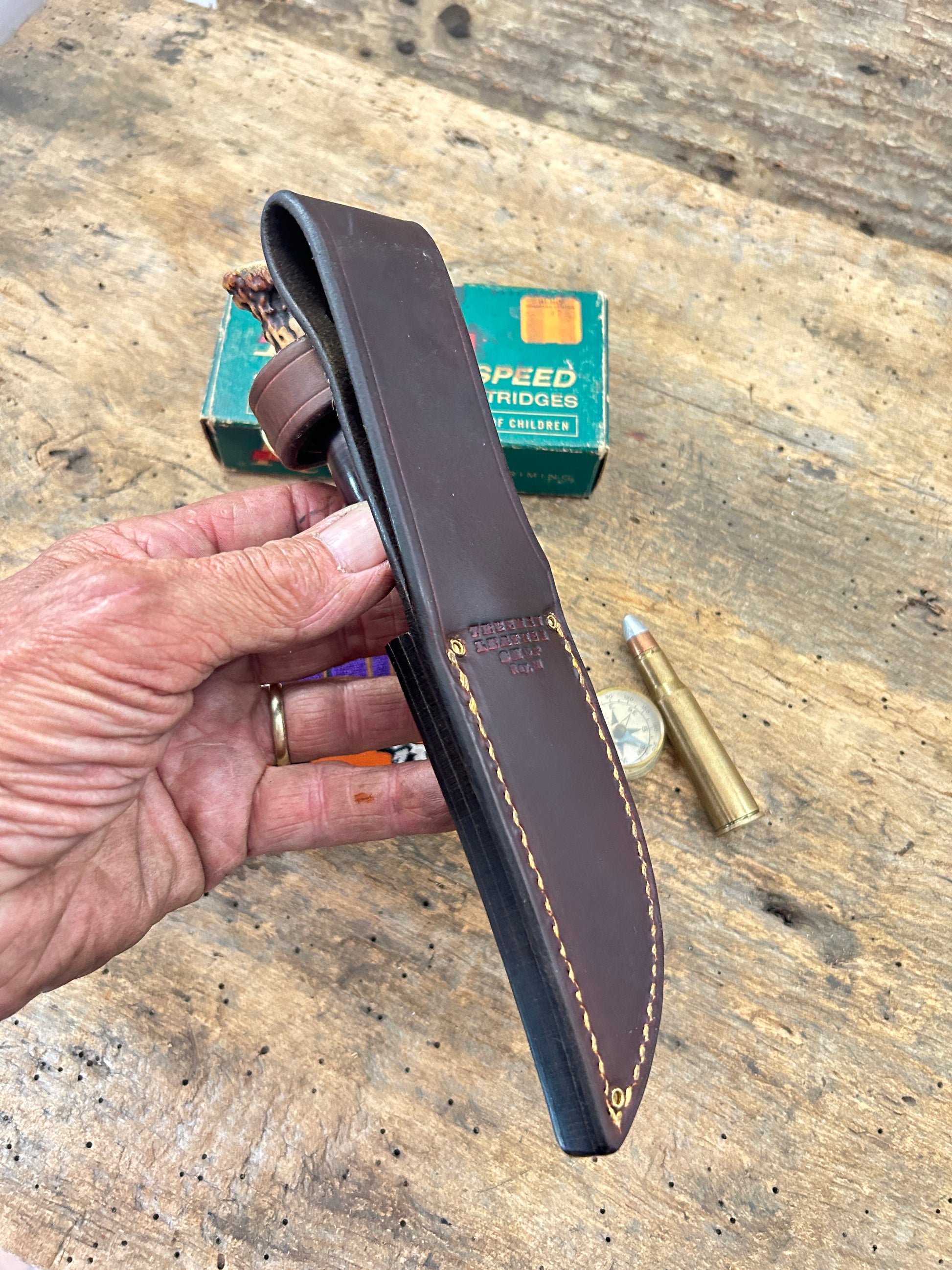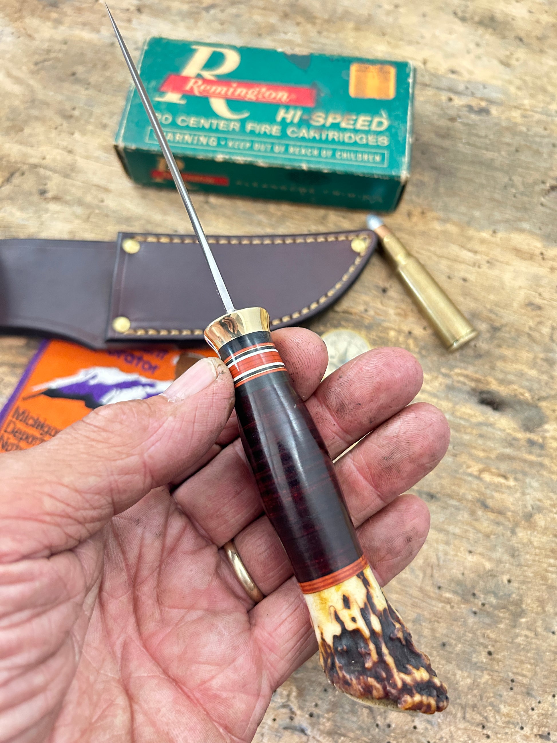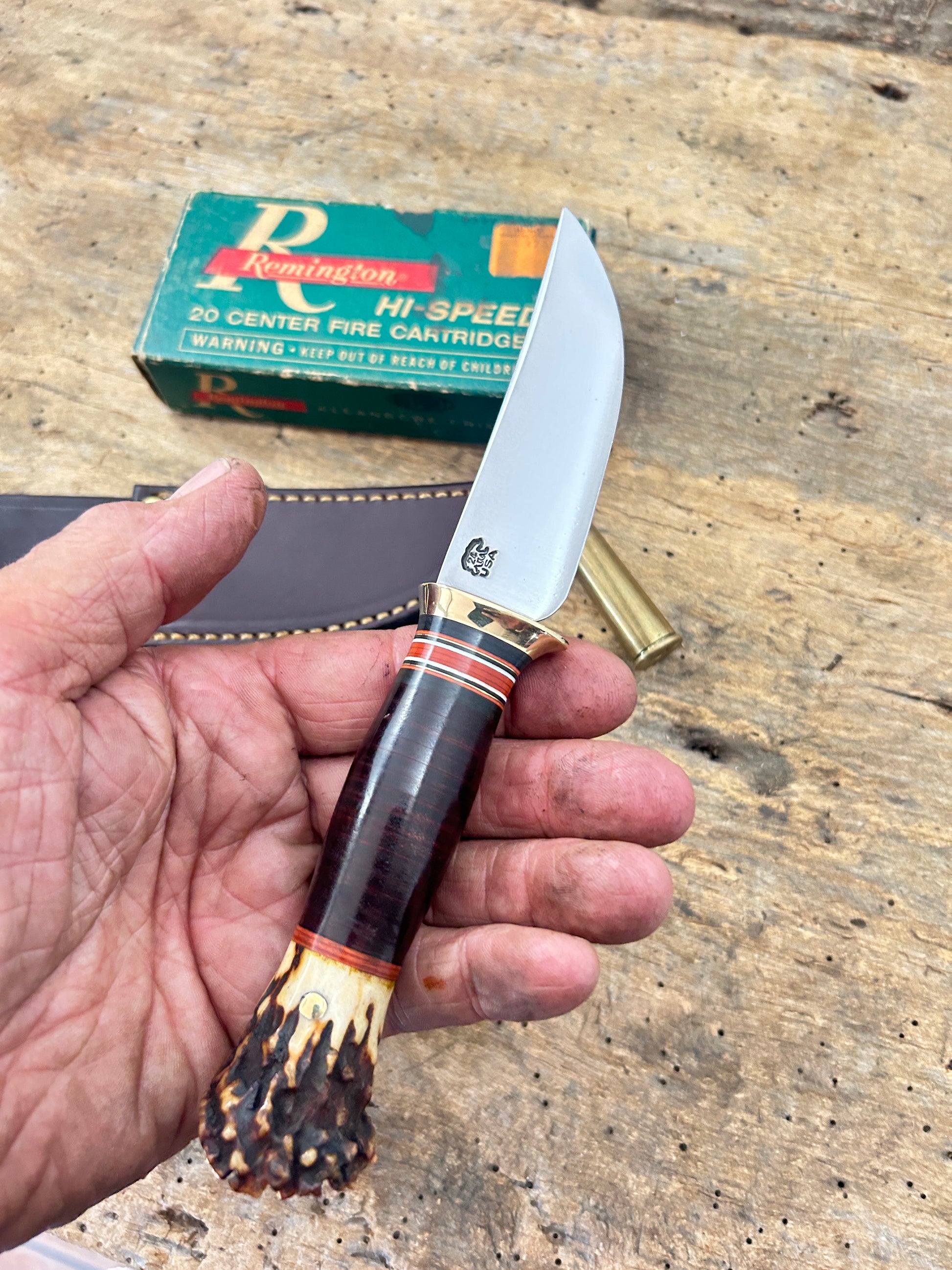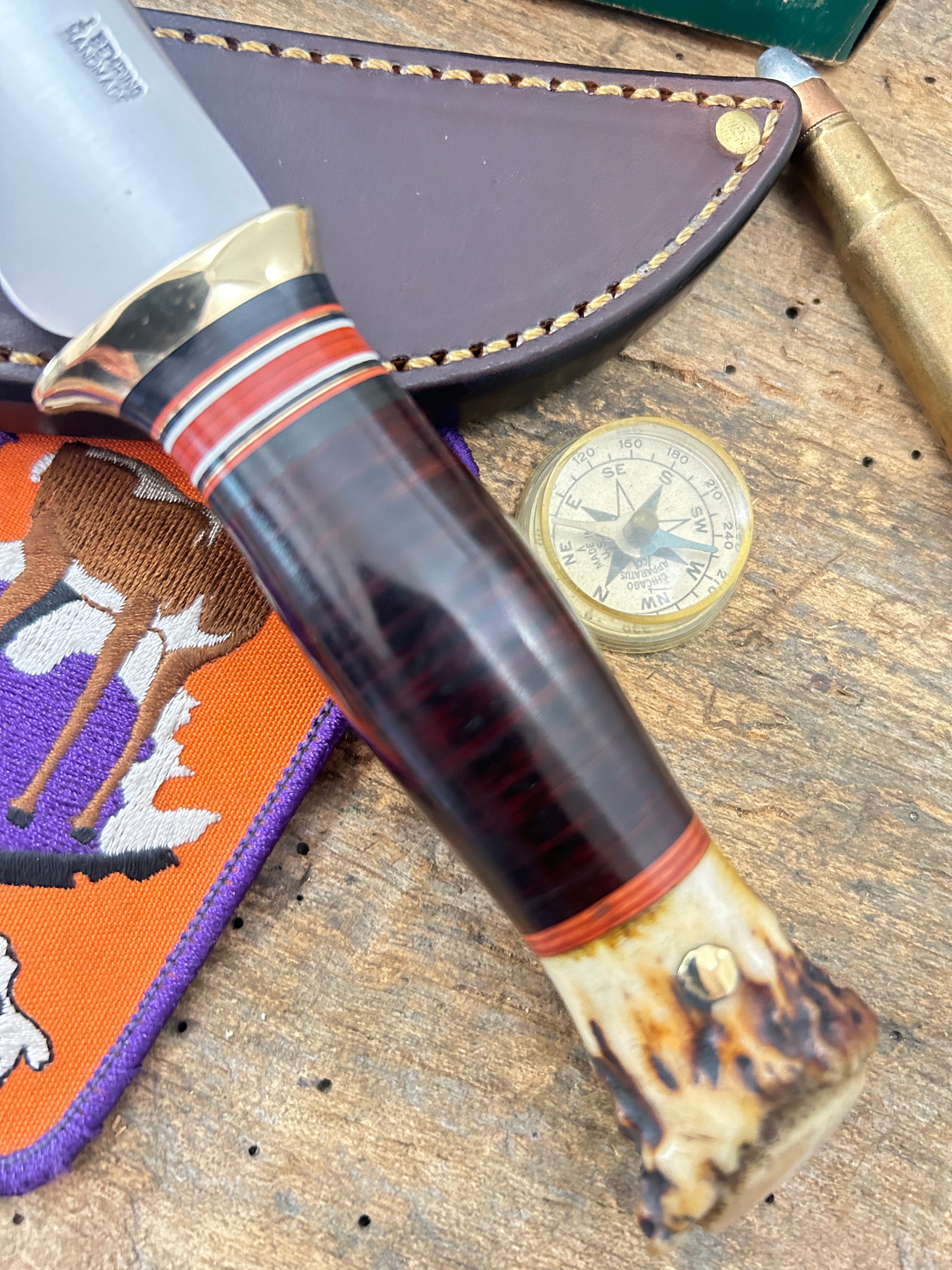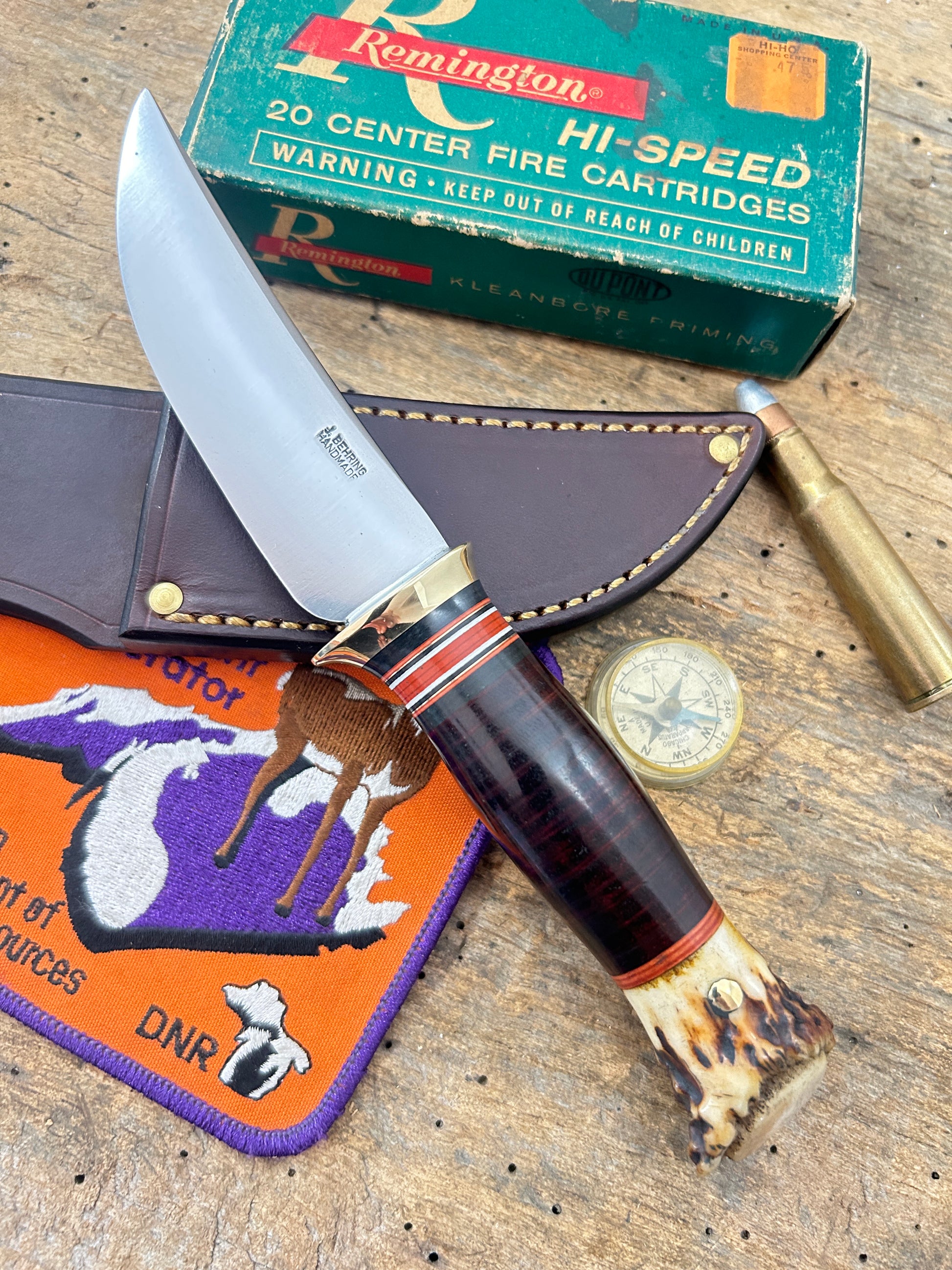 This old school Deer and Trout knife has a 3 7/8" hand forged blade made of 1095 steel. Convex ground with nice clear stamps. Silver soldered guard is brass. Hidden tang is stacked horse hide with a pinned 1930s Wisconsin crown stag . OAL is about 8". Comes with a made to fit belt sheath. Perfect deer hunting knife. Blade is about 1/8" thick. Priced to low . Getting close to the end of the road. Thanks, Jim