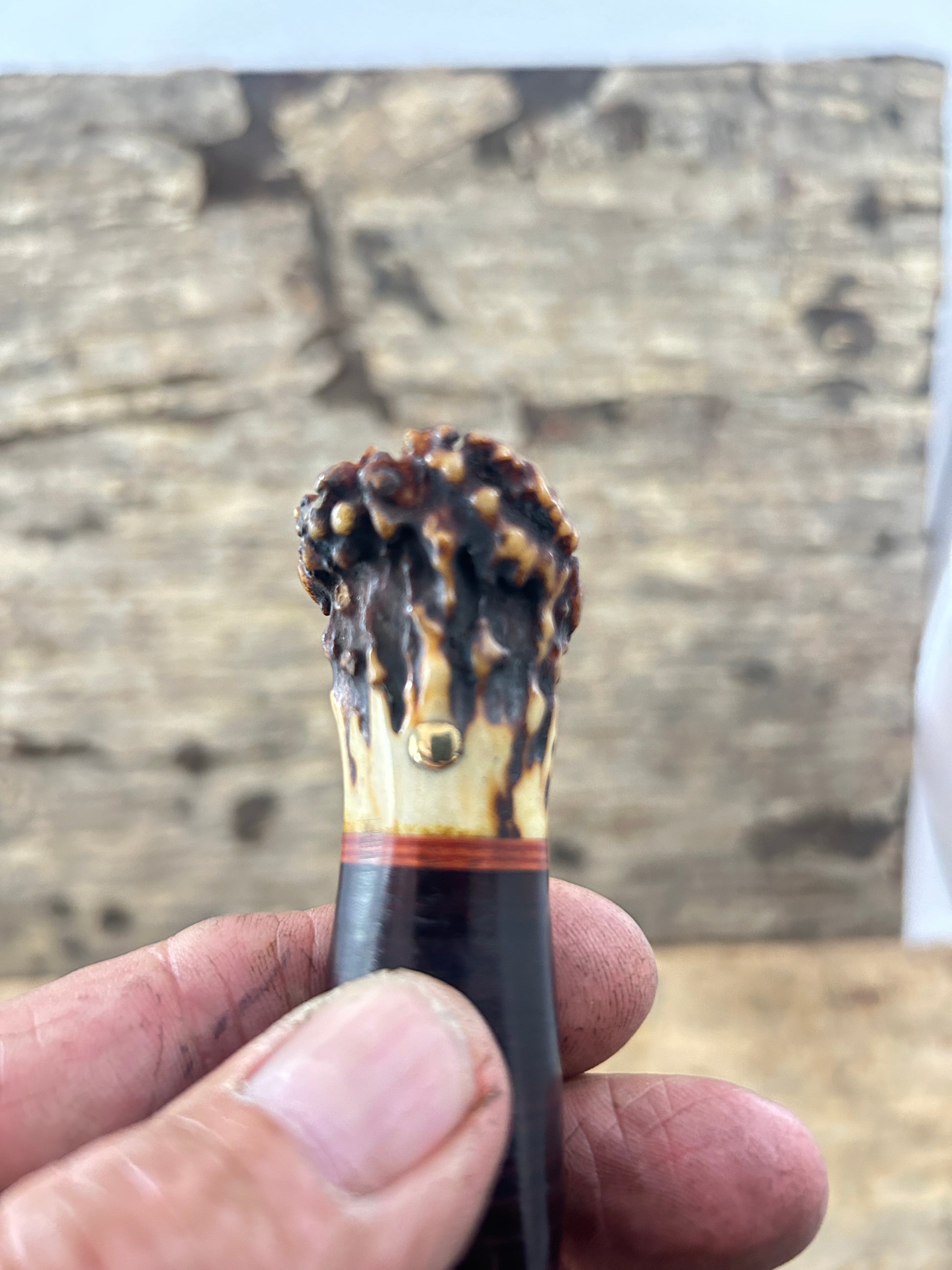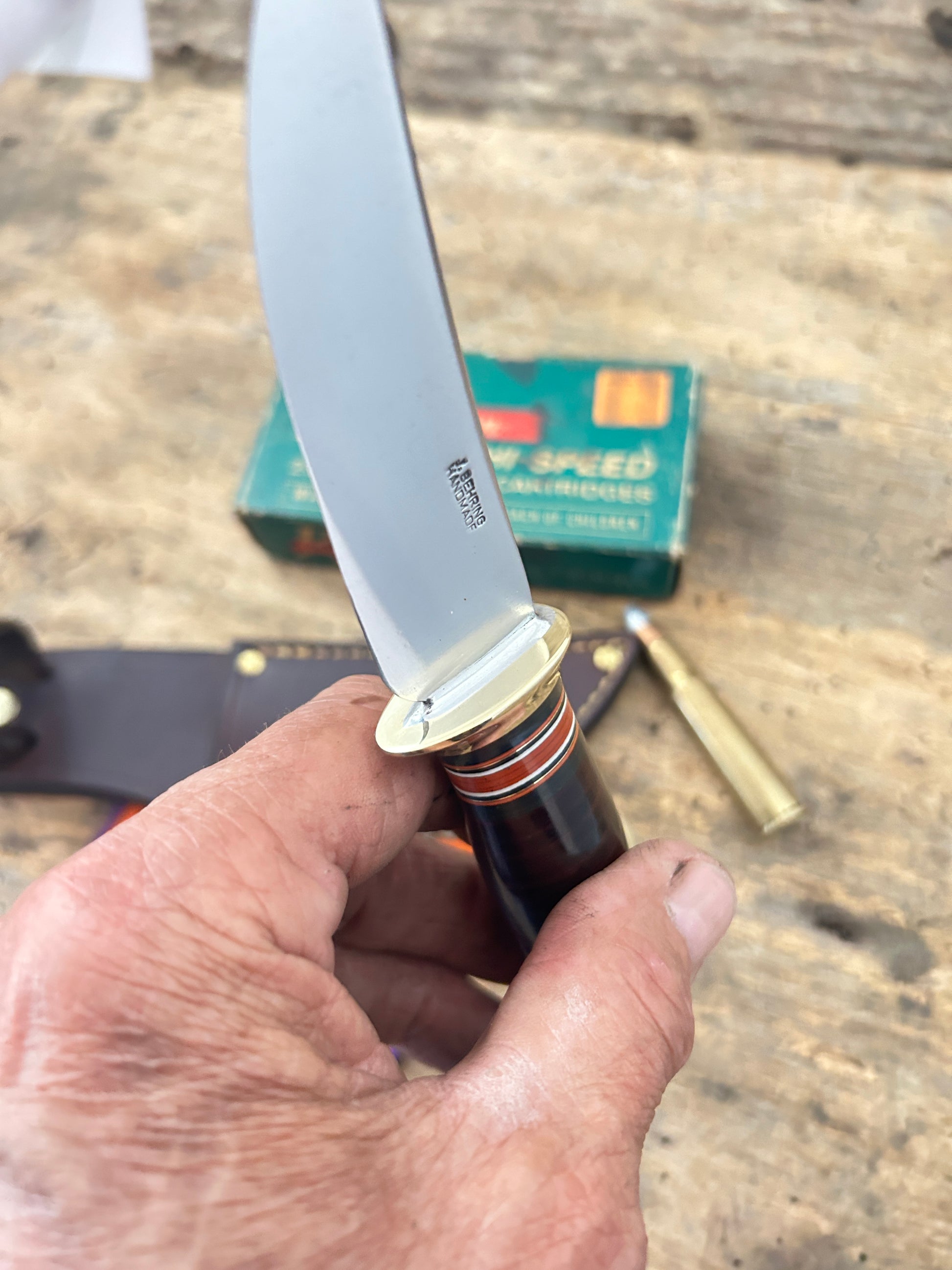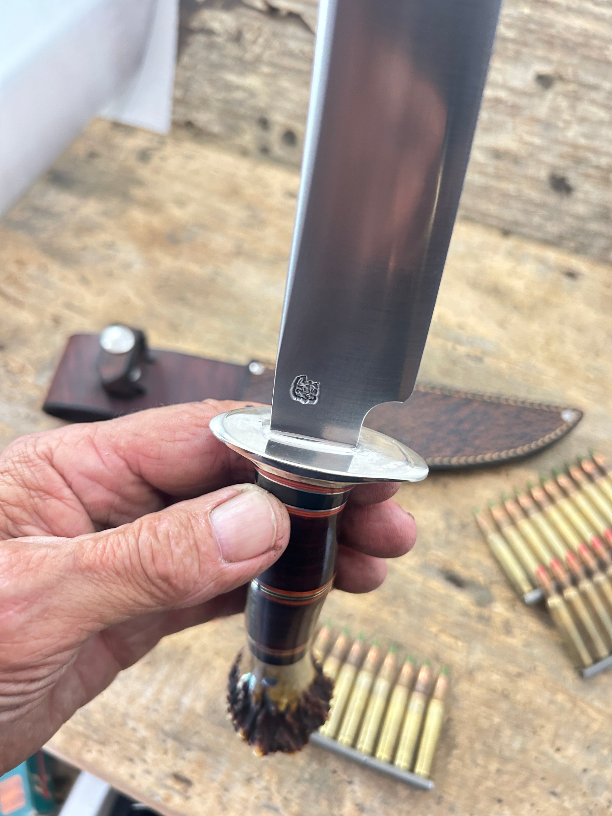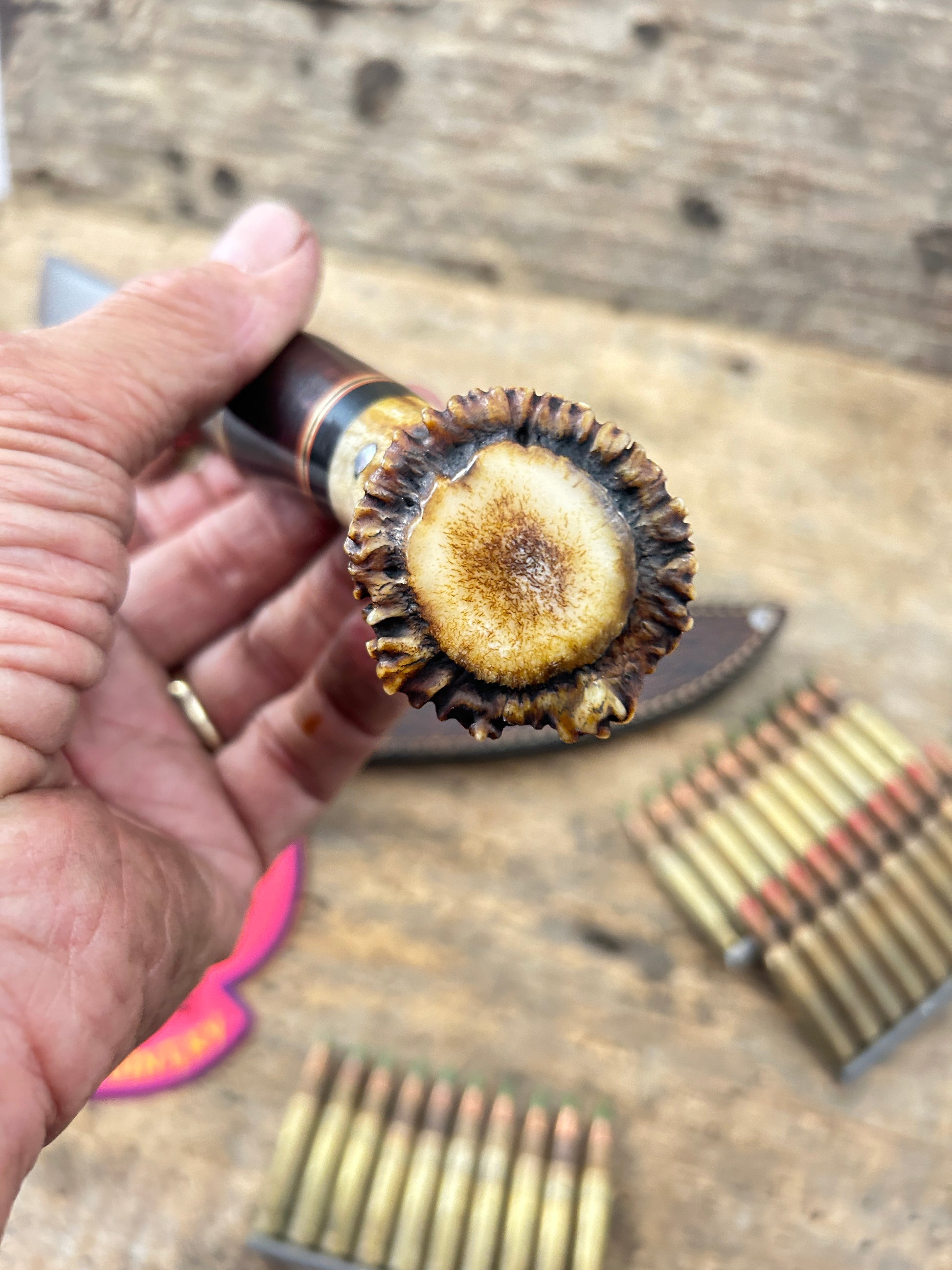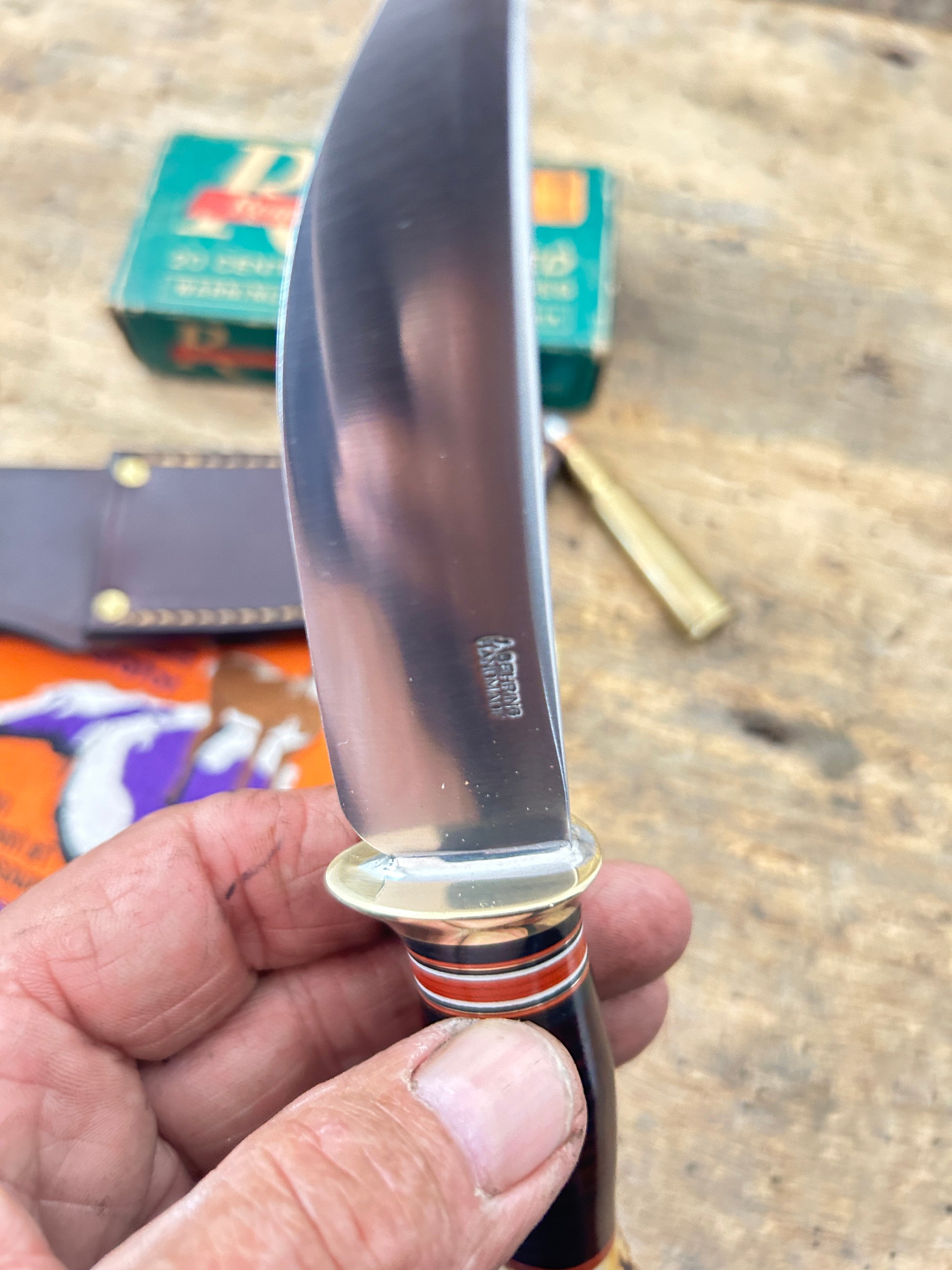 This old school Deer and Trout knife has a 3 7/8" hand forged blade made of 1095 steel. Convex ground with nice clear stamps. Silver soldered guard is brass. Hidden tang is stacked horse hide with a pinned 1930s Wisconsin crown stag . OAL is about 8". Comes with a made to fit belt sheath. Perfect deer hunting knife. Blade is about 1/8" thick. Priced to low . Getting close to the end of the road. Thanks, Jim