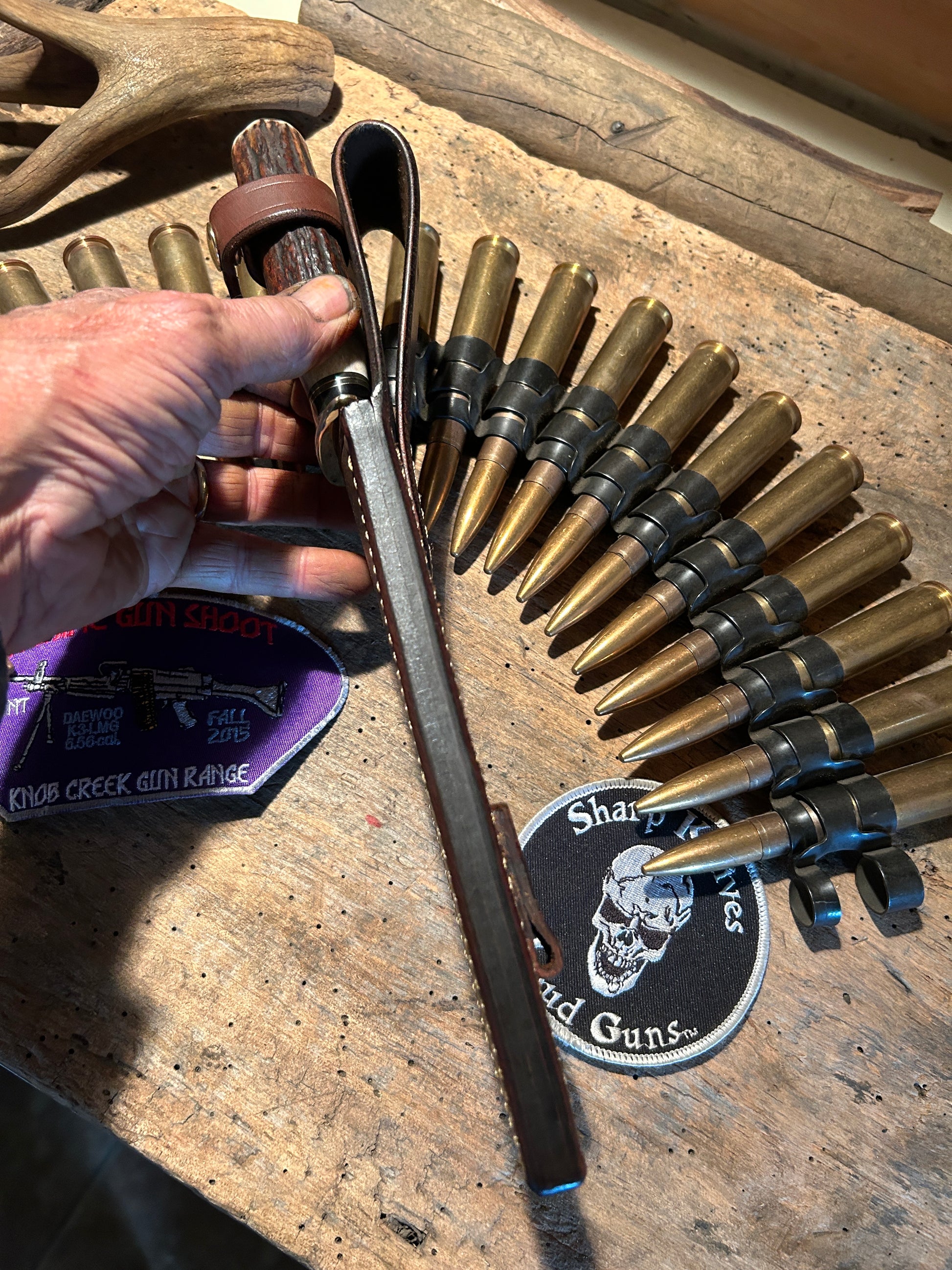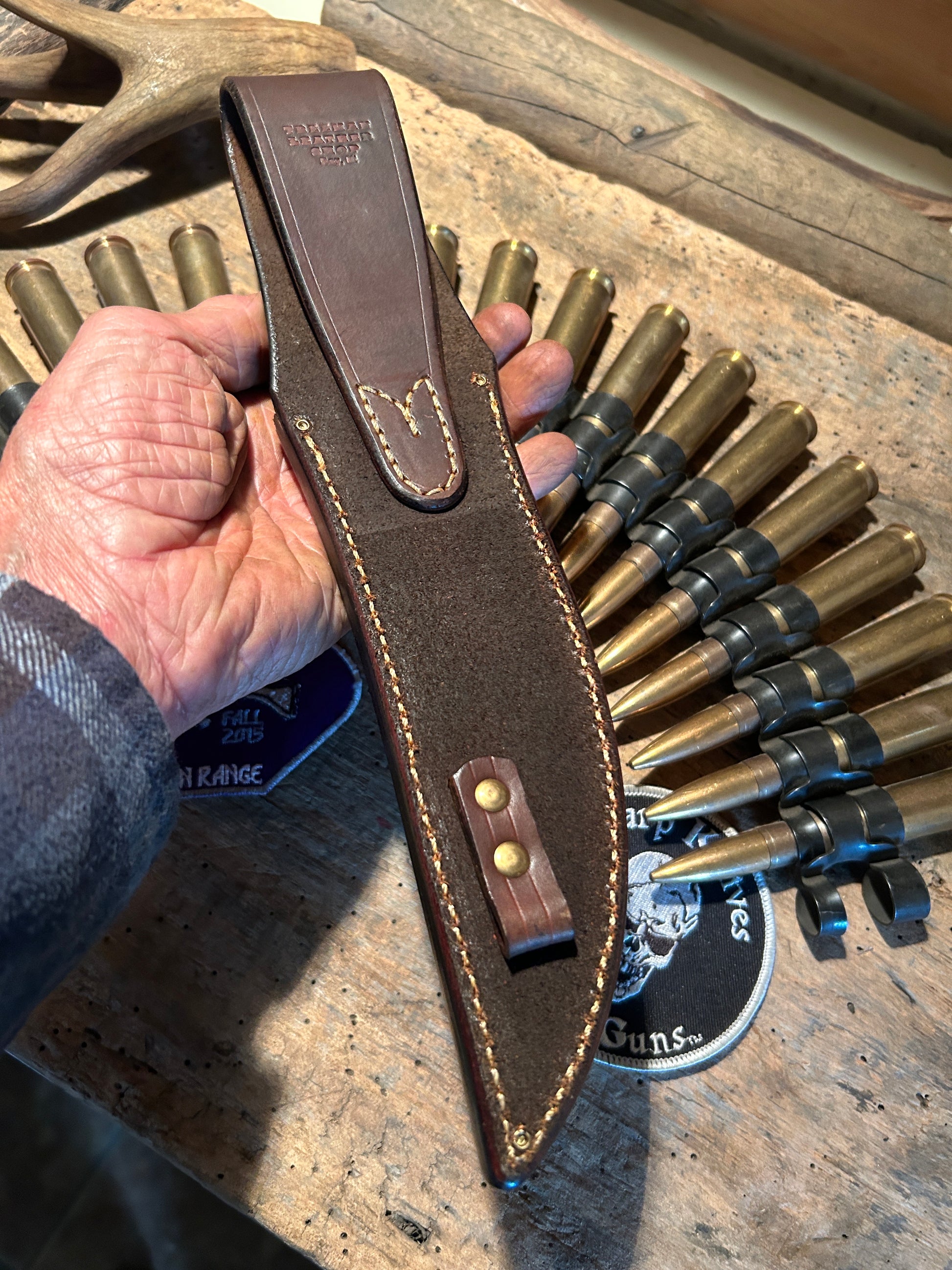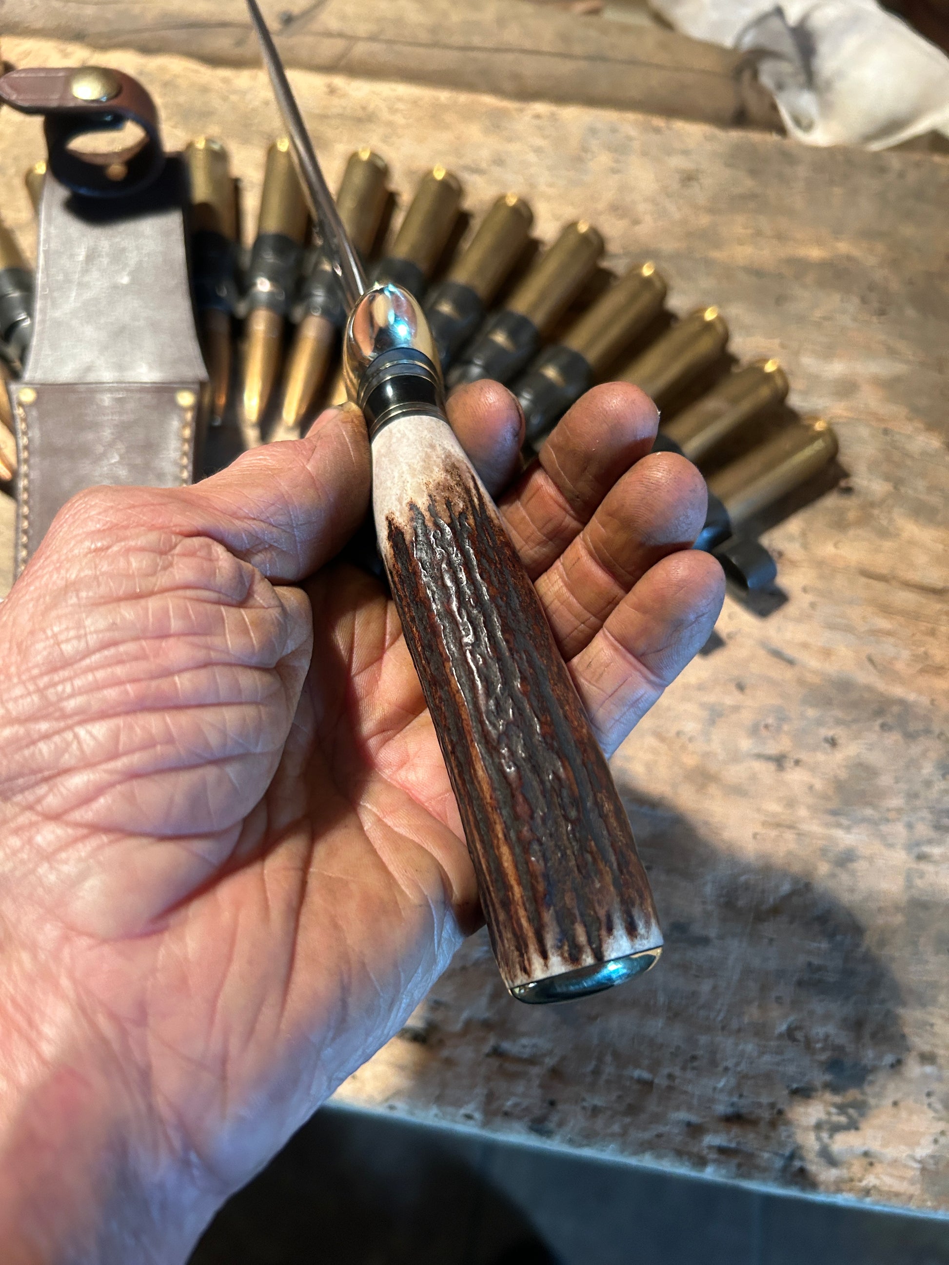 This J. Behring Handmade Double Skull Fighter has a 7" hand forged 1095 convex ground blade. Guard is silver soldered brass. Hidden tang handle is rock solid sambar stag with a pinned domed butt cap. OAL is about 12 1/4". Comes in a made to fit old school wide mouth belt sheath. Priced to sell. Thanks, Jim