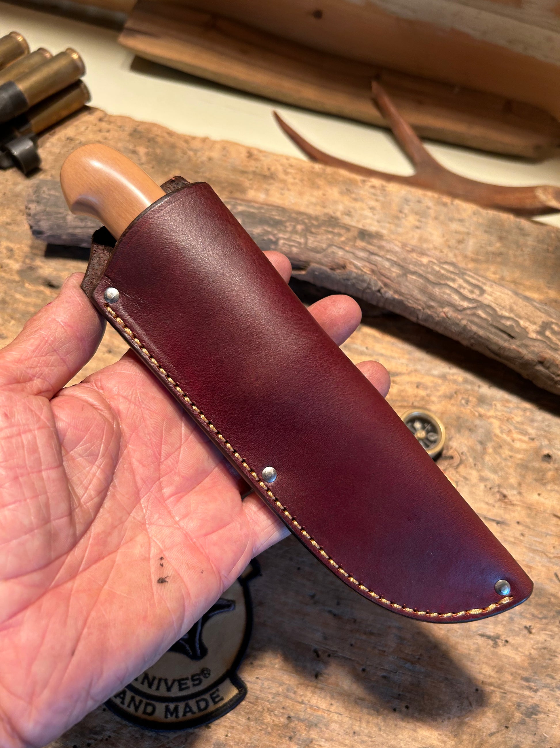 I can make this knife in a multitude of colors and handle materials. This is a one of a kind only a few made like it. This is the first one with this handle color. Blade is 4 1/2" long and sharp as hell. Thickness is .090 and its convex ground for superior strength. Nice deep anvil stamp and Michigan date stamp on the back side. Cool stack of spacers and a hidden tang that runs almost to the end of the linen micarta border patrol handle. OAL is about 8 7/8". This knife will cut and slice and work well is salt water or the most humid jungle. Comes with a made to fit perfect pouch sheath. It would be wonderful in the kitchen as well. Thanks, Jim