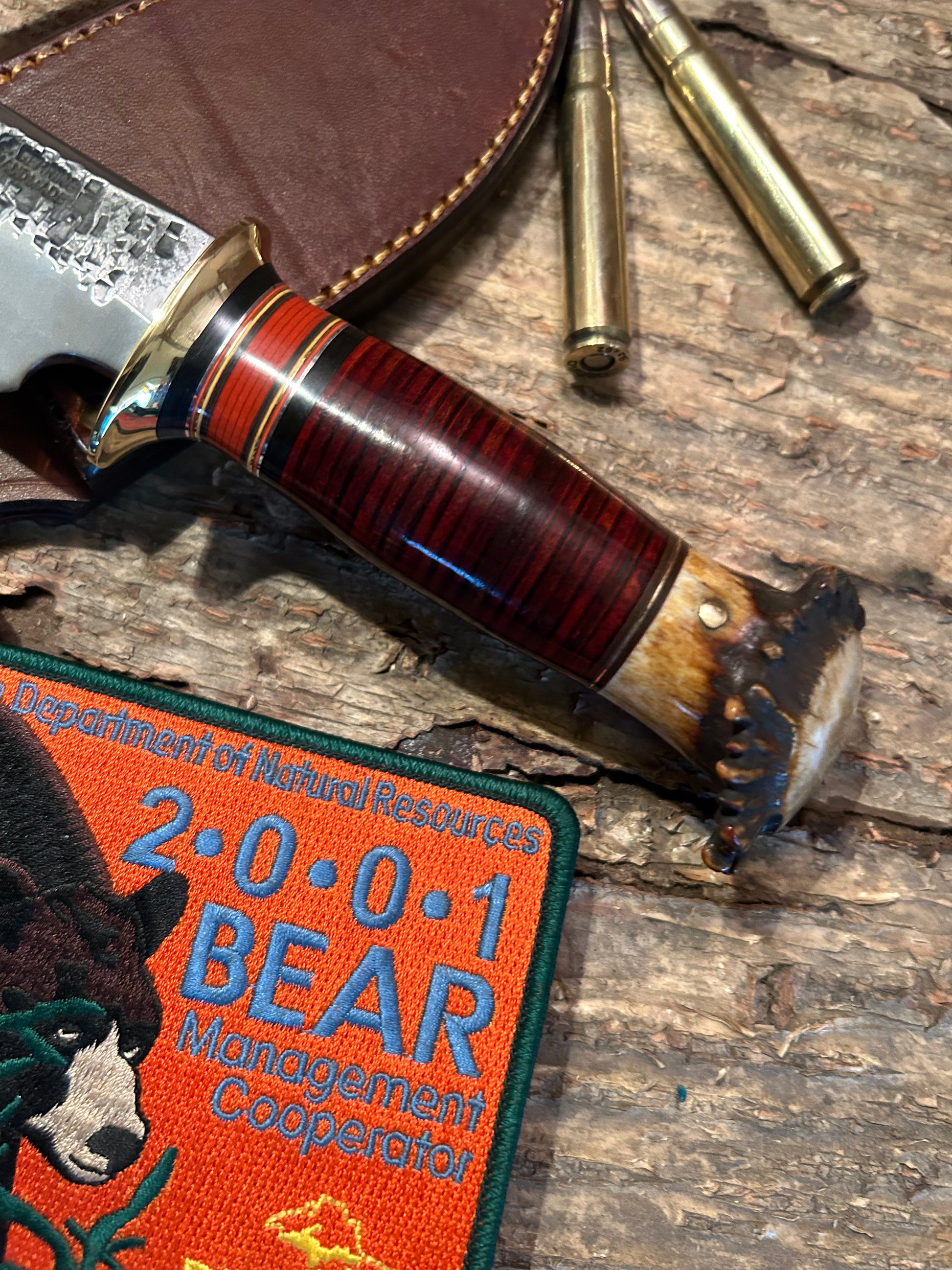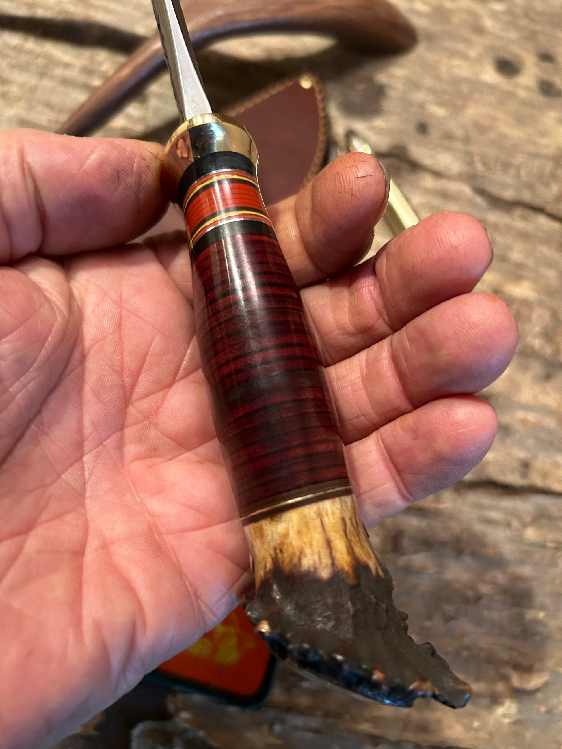 This J. Behring Handmade Fox River Hunter has a hand forged hammer mark hollow ground 1095 blade .250 thick just under 5". Silver soldered brass guard with a hidden tang pinned horse hide and crown stag butt OAL is about 9 1/2". Comes in a made to fit belt sheath. Thanks, Jim