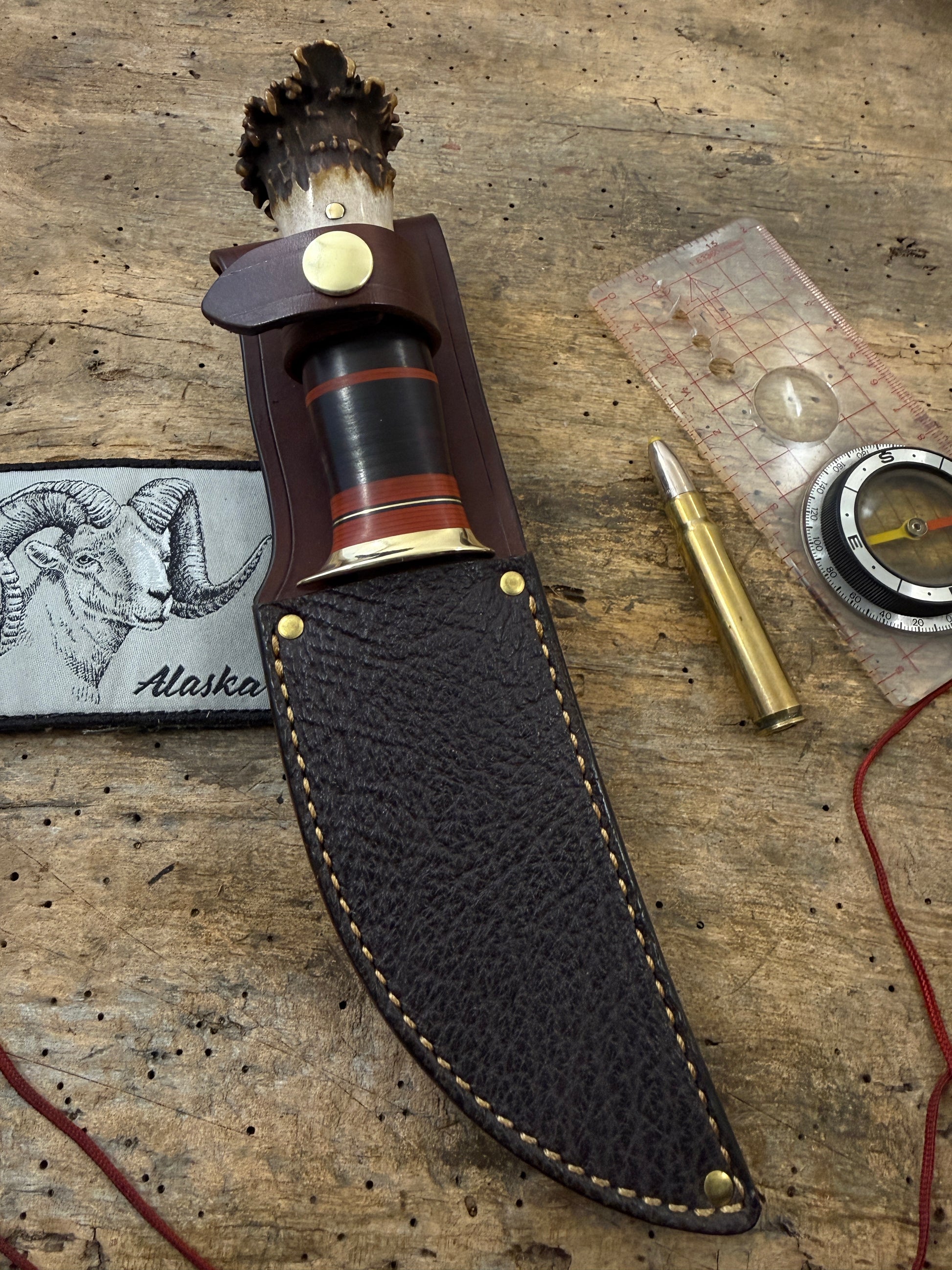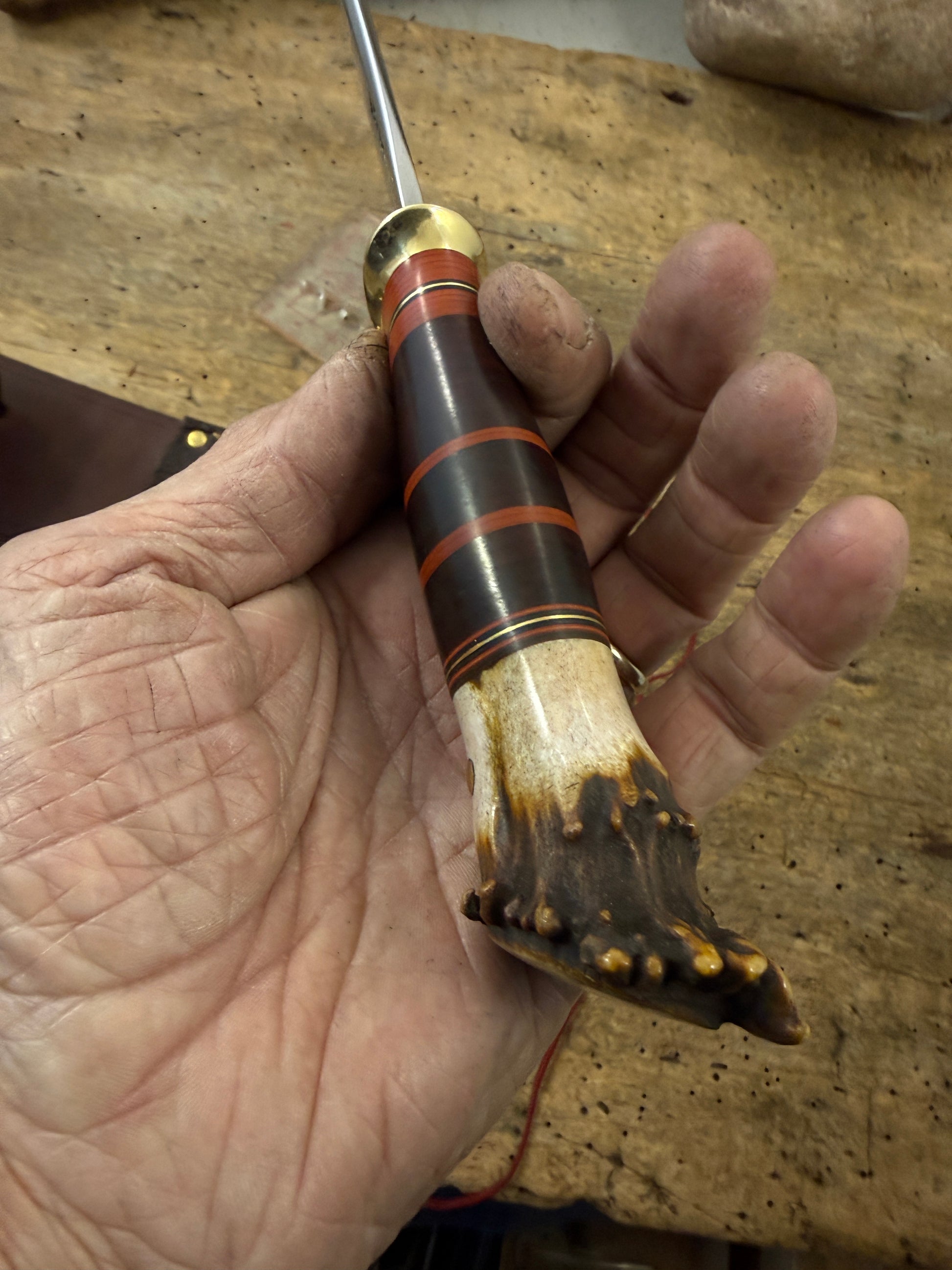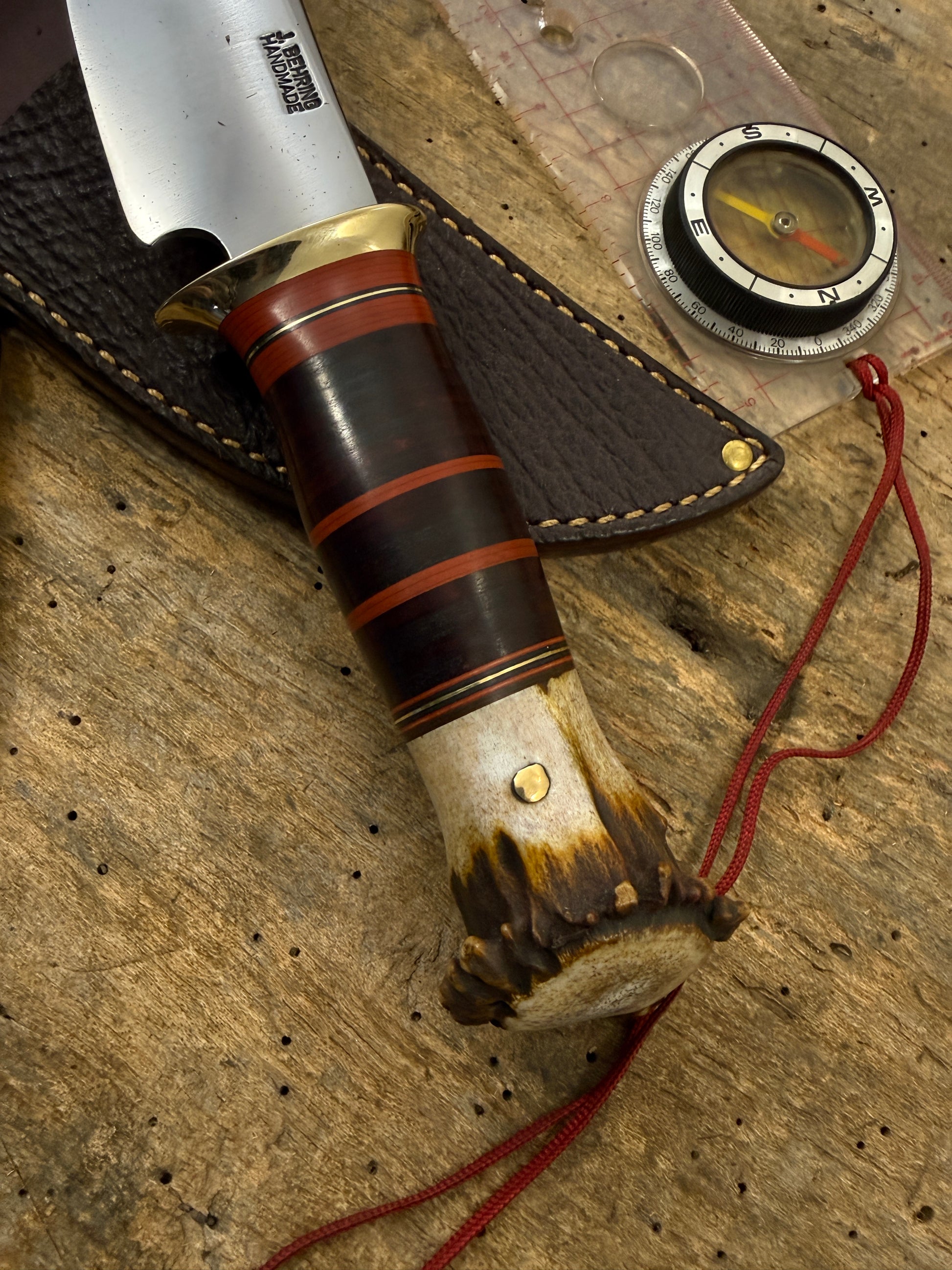 This is the perfect knife for the outdoorsmen with a 4 3/4" hand forged blade made of the latest and greatest Pop Knife Supply Pro Cut steel. This knife has a convex grind with a blade thickness of about .180 . Silver soldiered brass guard . Hidden tang handle has a wonderful scagel style stack of horse hide and maroon ,black, brass spacers. The crown stag butt is pinned . OAL is about 9 3/4" . Big choil for many years of easy sharpening and a hand fit sheath with a shark hide face. Ready to ship . Thanks, Jim