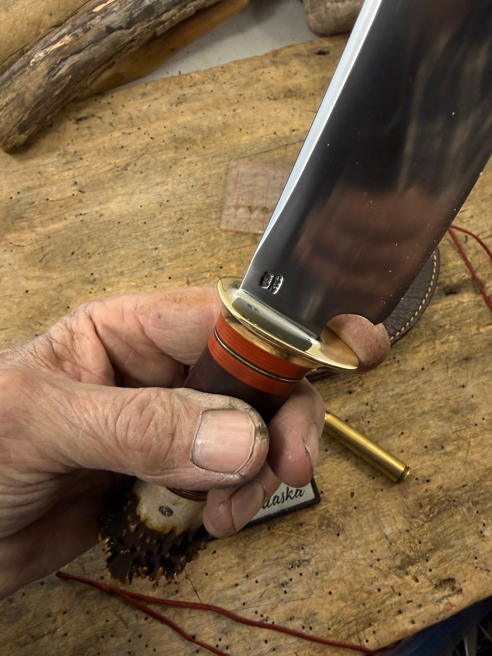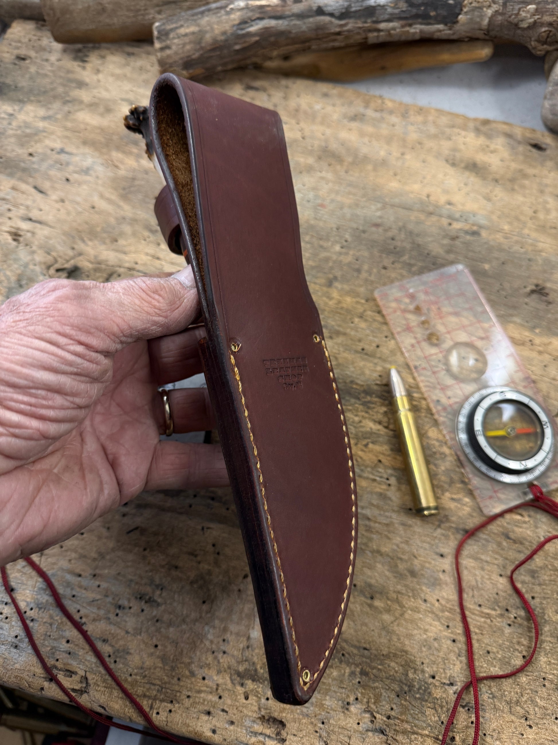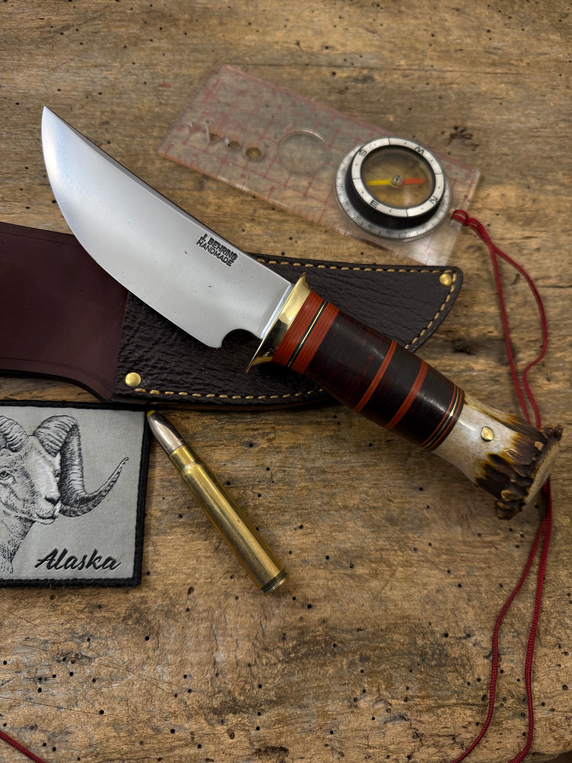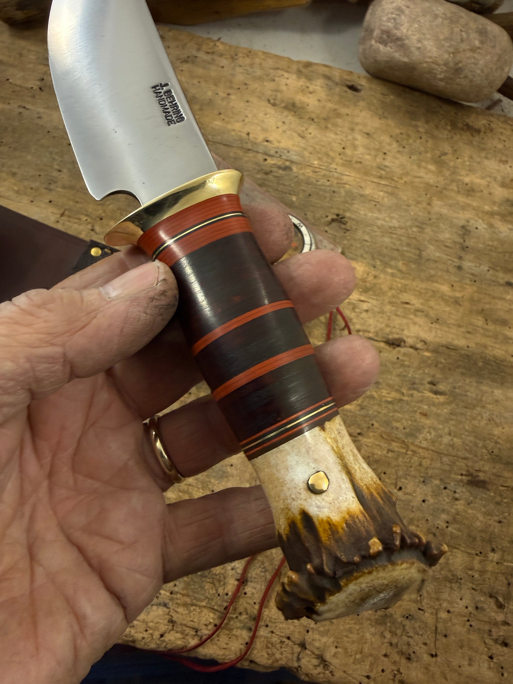 This is the perfect knife for the outdoorsmen with a 4 3/4" hand forged blade made of the latest and greatest Pop Knife Supply Pro Cut steel. This knife has a convex grind with a blade thickness of about .180 . Silver soldiered brass guard . Hidden tang handle has a wonderful scagel style stack of horse hide and maroon ,black, brass spacers. The crown stag butt is pinned . OAL is about 9 3/4" . Big choil for many years of easy sharpening and a hand fit sheath with a shark hide face. Ready to ship . Thanks, Jim