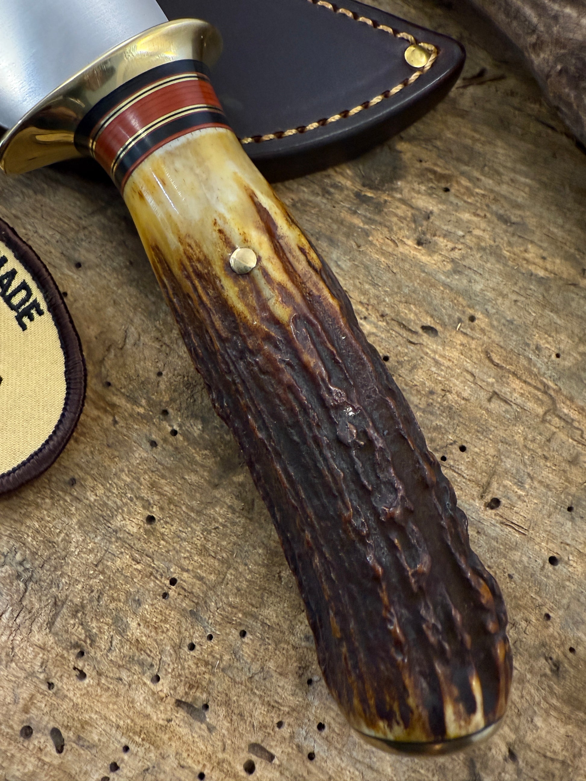 This is about the perfect size field knife when your hunting things that don't shoot back. Nice heavy duty .250 thick hand forged with Pops new Pro Cut steel. Supposed to be good shit ! Blade is 4 7/8' long with a silver soldered brass guard that will protect your fingers. Paul Bausch used to say knife with no guard is un safe and he wont buy them for resale. He was the largest buyer on the planet at one time when AG Russell sold only American made and some handmade Japanese knives. Not there all chine made . Shame. OAL is about 9 1/2". Stag is beautiful sambar with a natural curve. Pinned hidden tang with a pinned brass domed butt cap. .