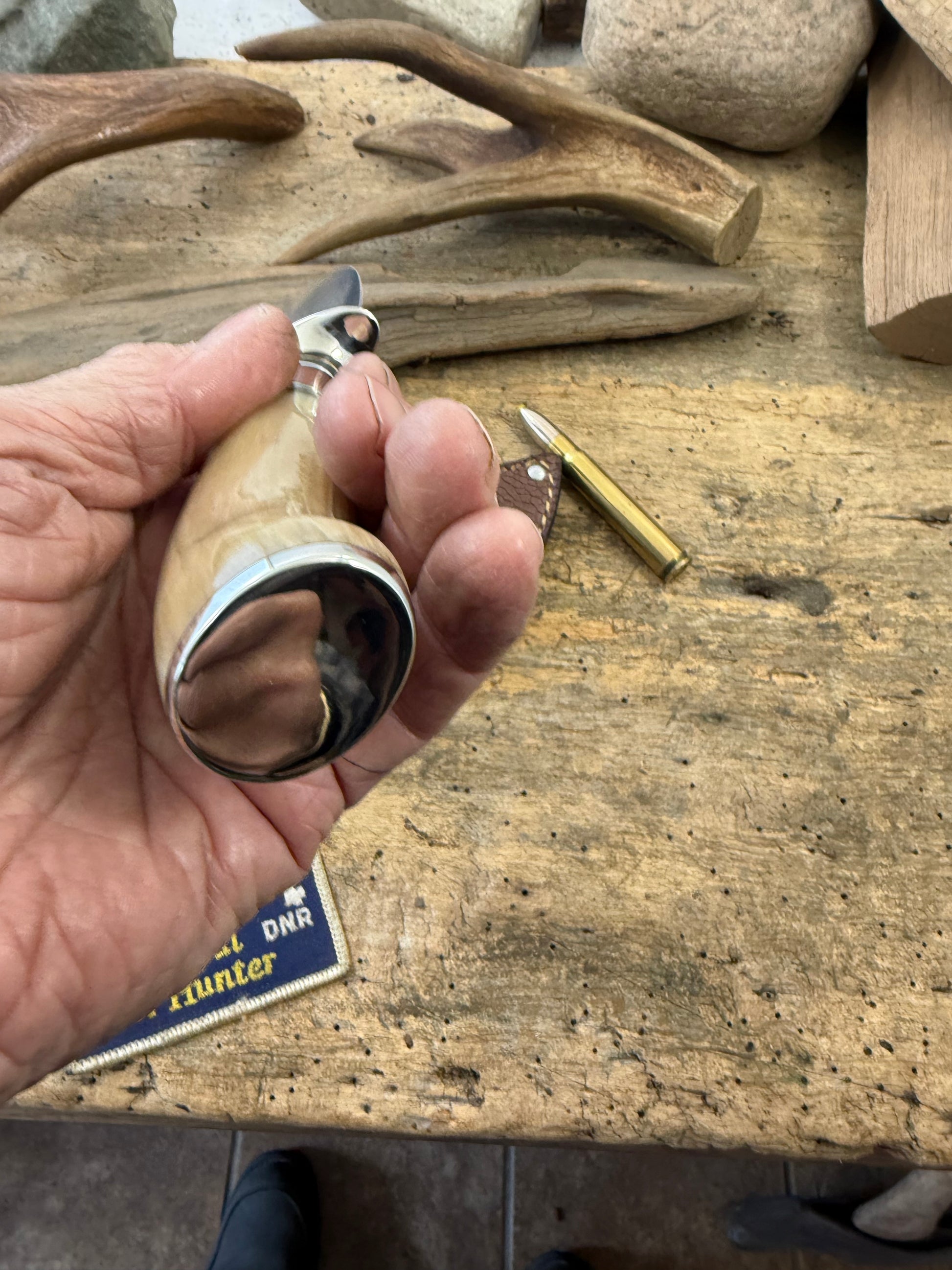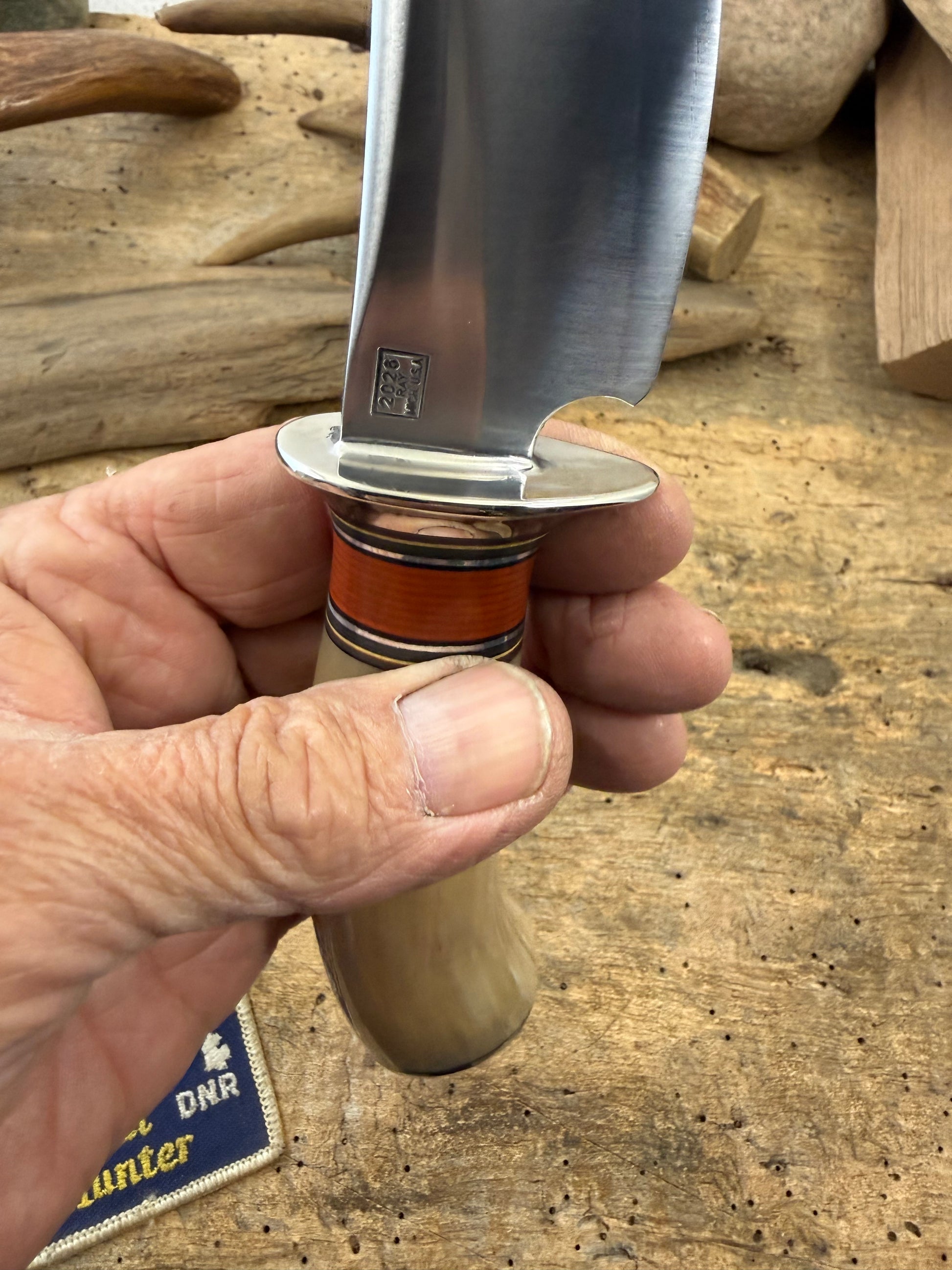 This far and few Treeman Musk Ox Heavy duty caper has a 3 1/2" blade .250 thick with a flat grind. First and only one like it. Guard is silver soldered nickel. Pinned Musk ox handle is stabilized . Pinned nickel butt cap. Full stitch ostrich leg sheath. OAL is about 8 ". Killer rig and ready to ship. Thanks, JIm