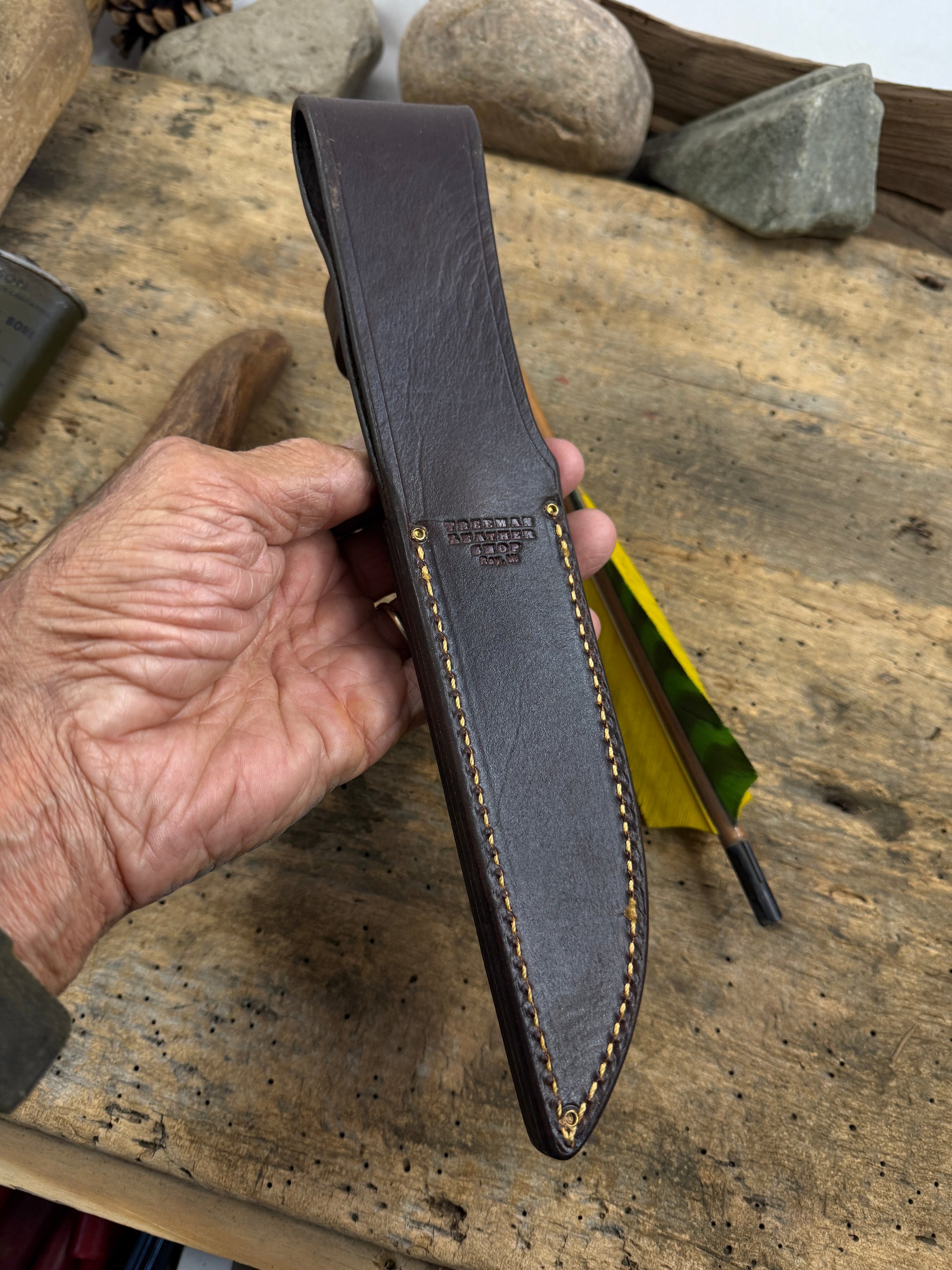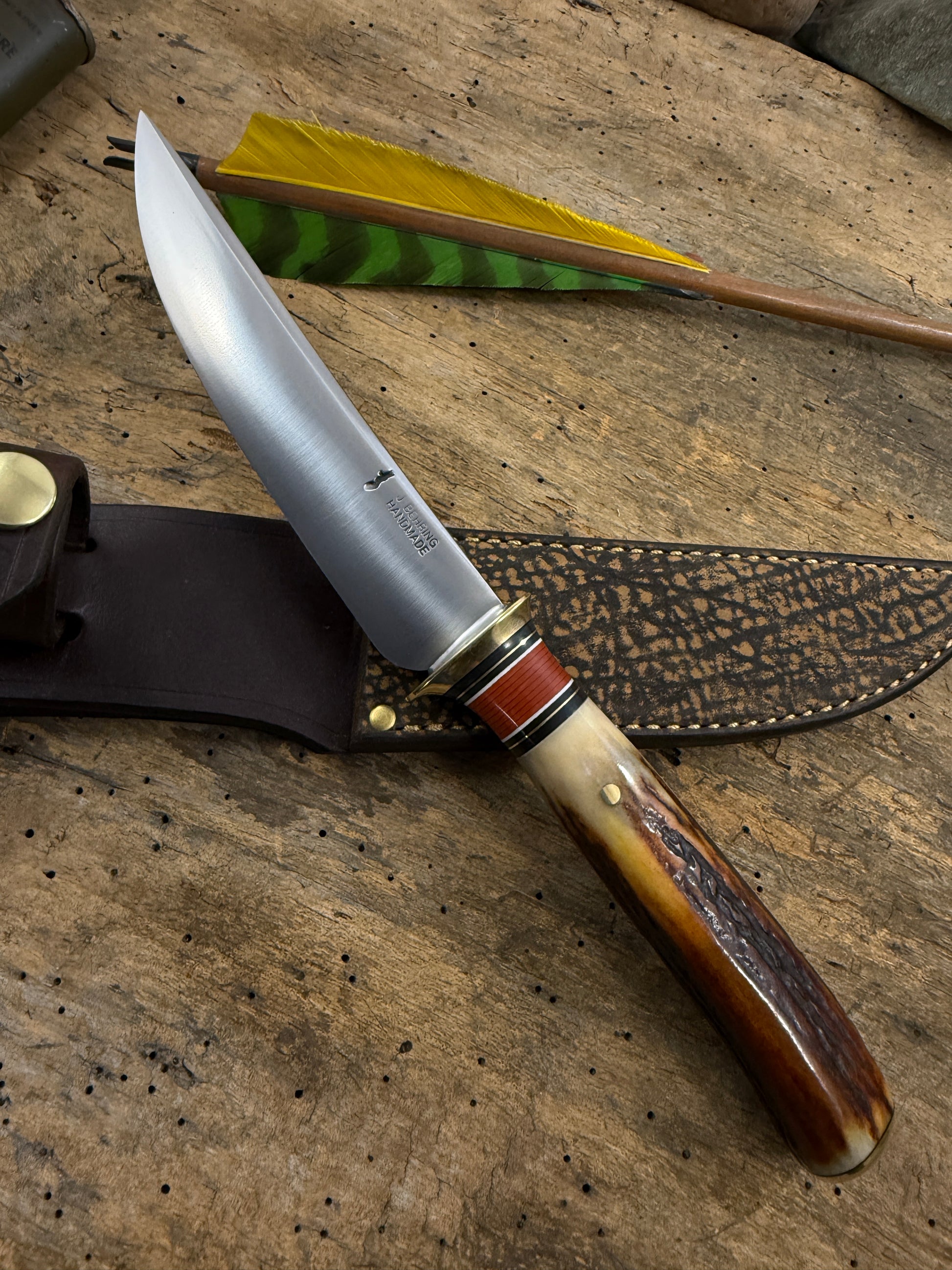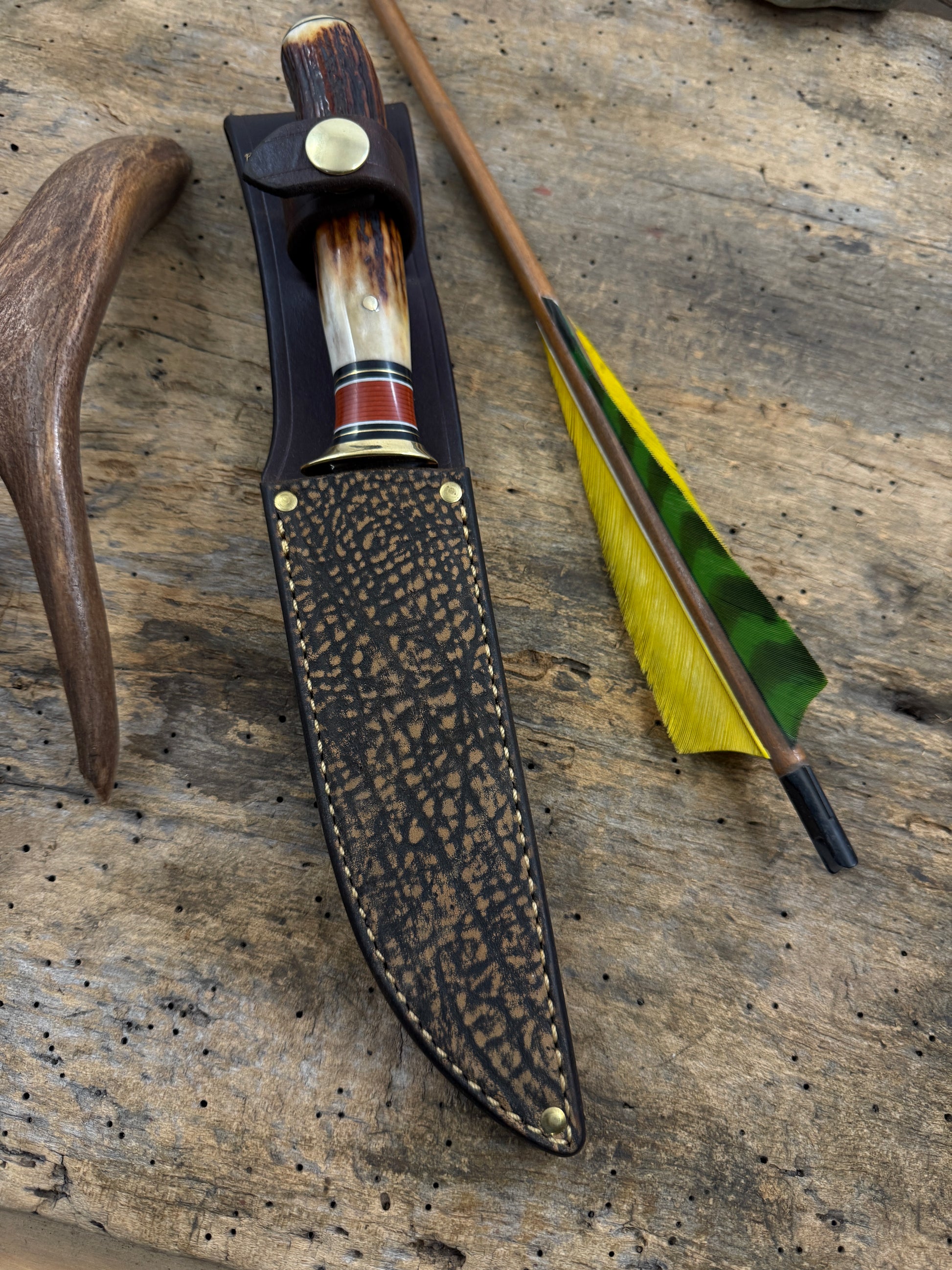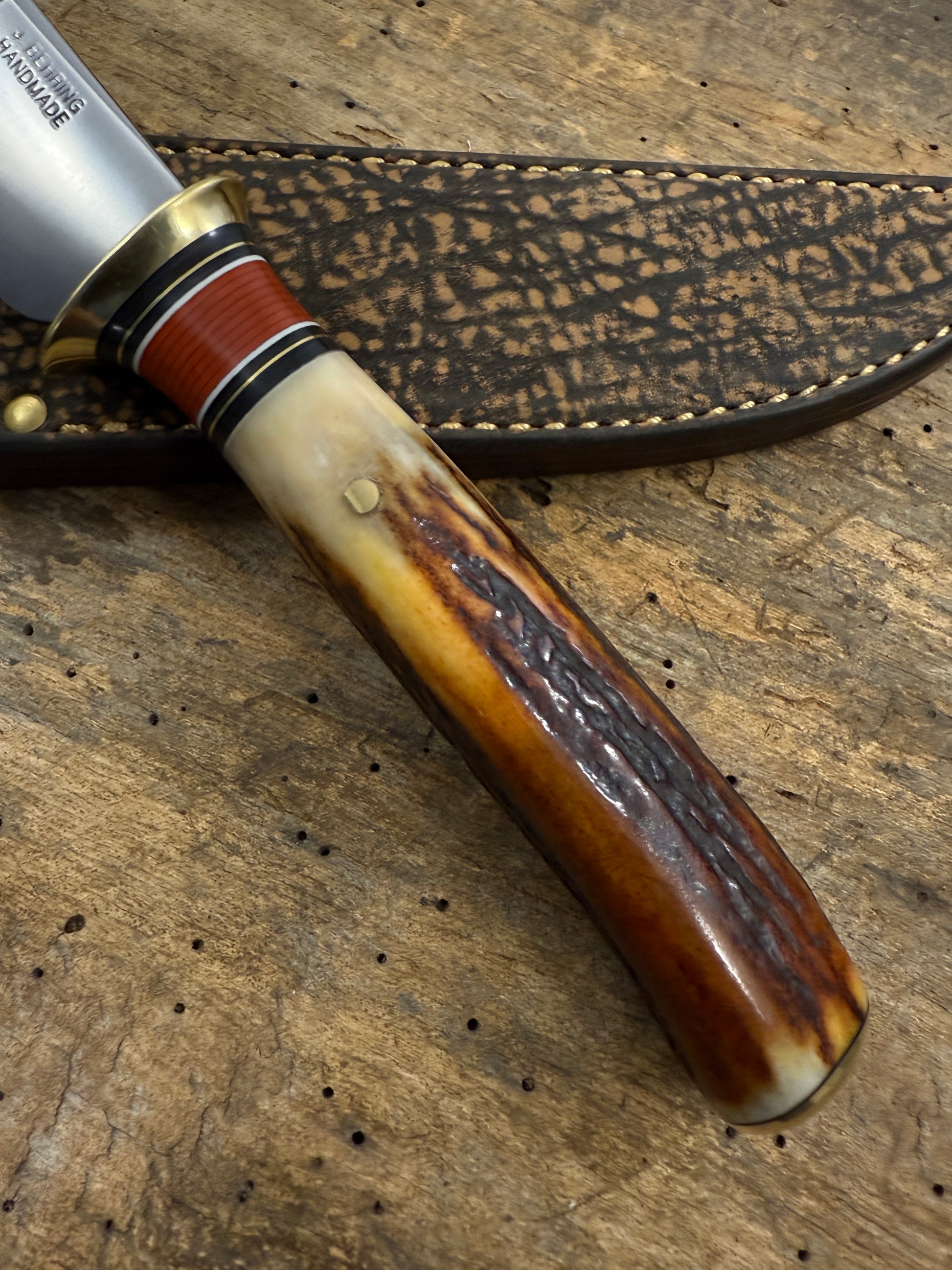 This is one hell of a knife made the old school way. Hand forged from 1095 steel. Convex ground 5 1.2" blade . Pinned red stag handle and Butt Cap. OAL is about 10 3/8". Blade is about .150 thick and sharp as hell. Sheath is Giraffe with brass rivets. Priced to sell. Thanks, Jim TMK