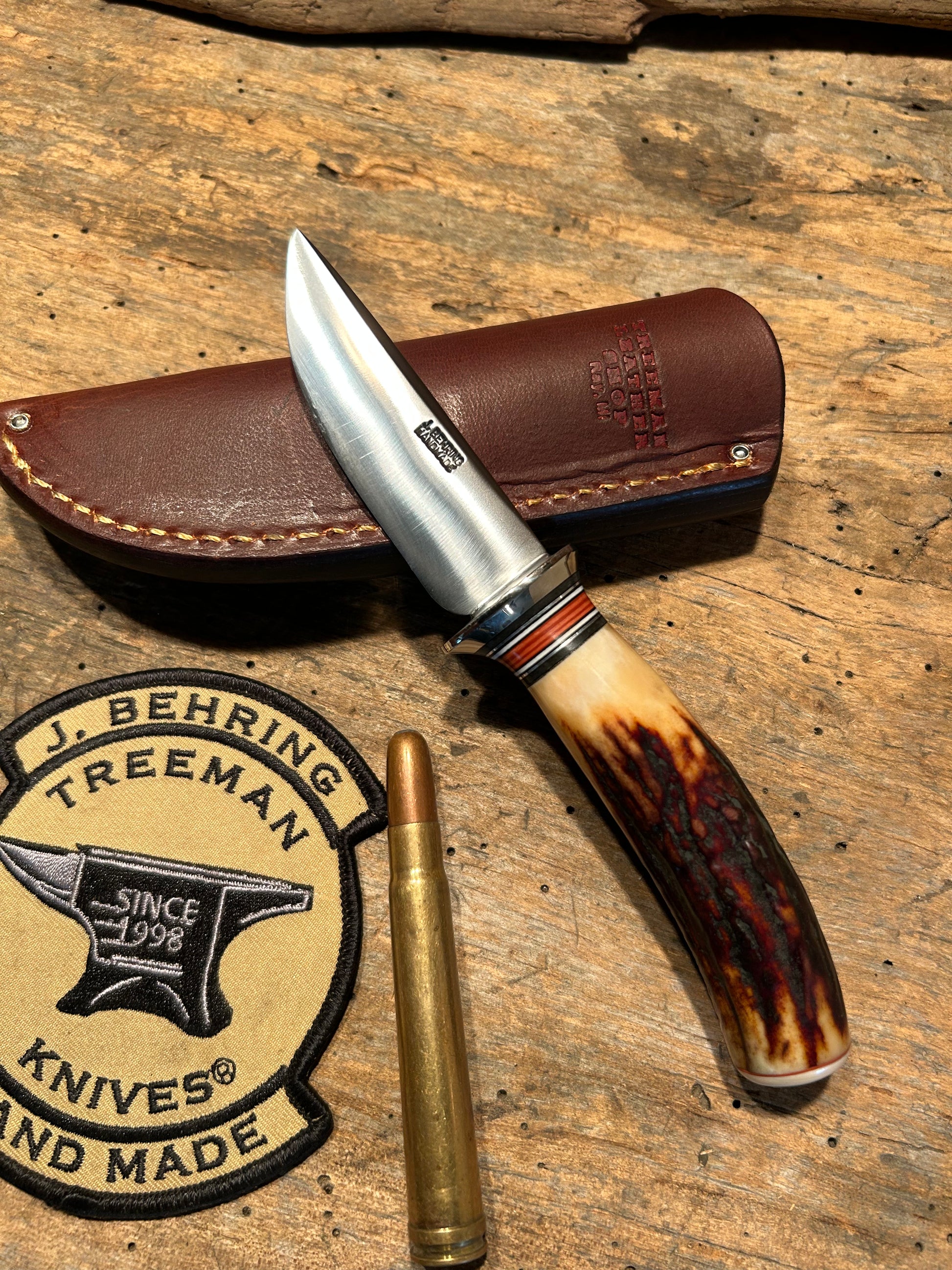 This J. Behring handmade Pocket Knife has a 3" AEB-L stainless blade . Guard is silver soldered nickel silver . Hidden tang handle has 120 year old red German stag with an Mammoth ivory butt cap. OAL is about 7" . Comes with a top quality hand made pocket clip back sheath. Once its warn in it will slip in and out easily and you will o longer have to fiddel around trying to open your pocket knife . Priced to sell. Thanks, Jim