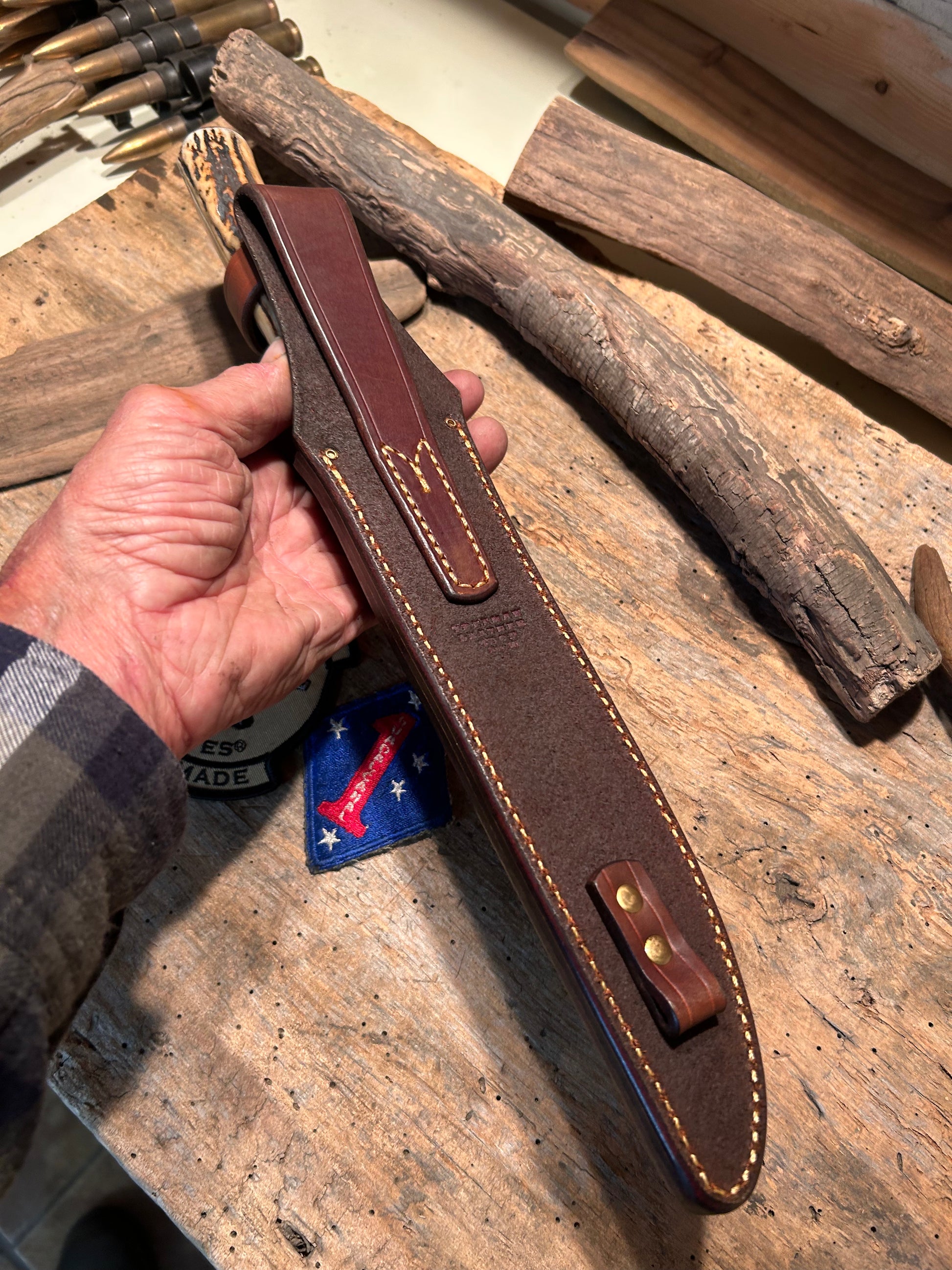 This J. Behring Treeman Double Skull Fighter has an 9" hand forged made of 1095 steel about 1/4" thick with a convex grind for superior strength. Old School Model one style choils with a double brass silver soldered guard. The hidden tang runs almost to the end of the rock slid sambar stag pinned handle. Nice domed pinned brass butt cap to finish it off nicely. OAL is about 14 3/4". Comes in a made to fit stone pouch rough back wide mouth sheath. Priced to sell. Thanks, Jim