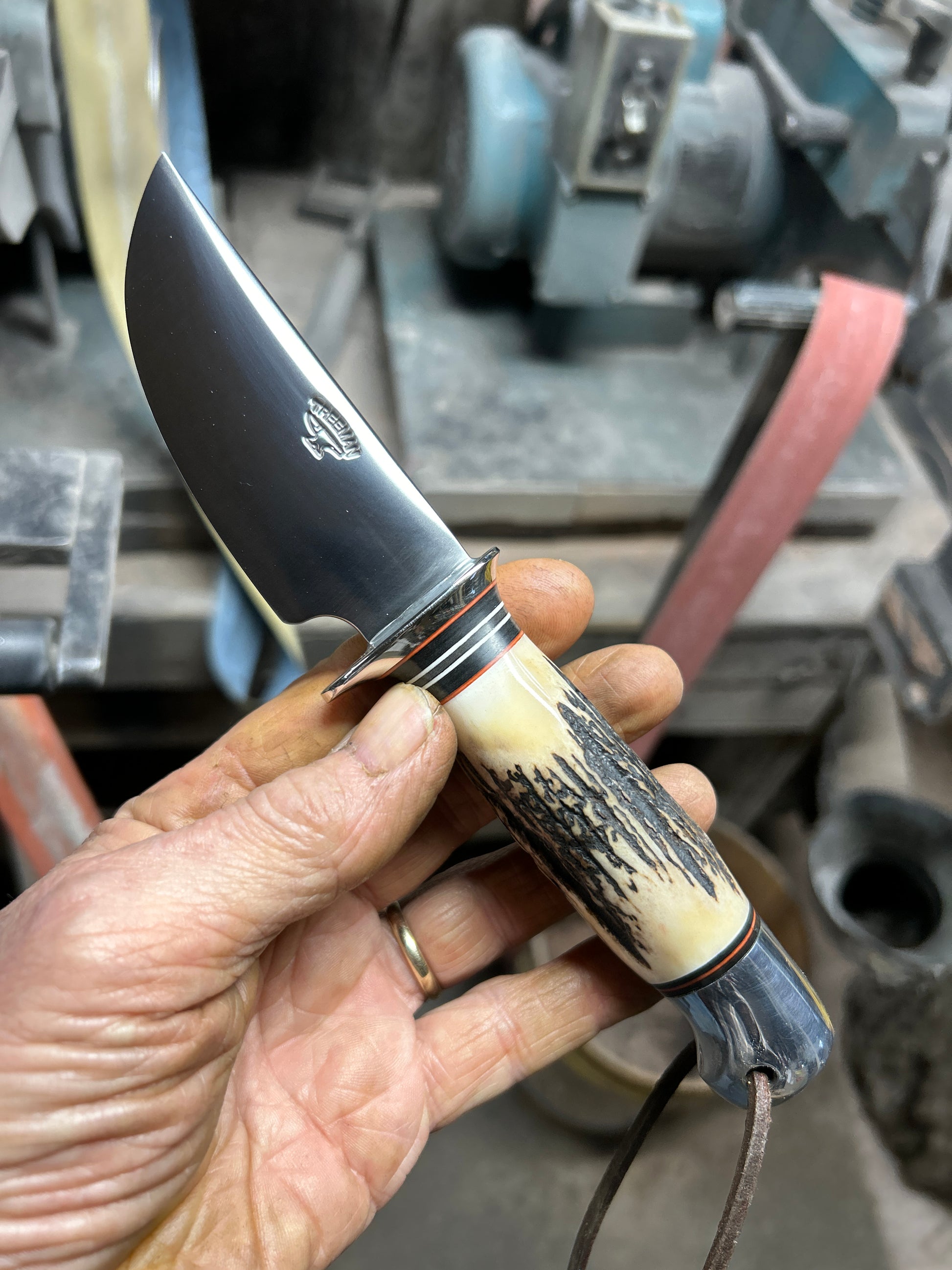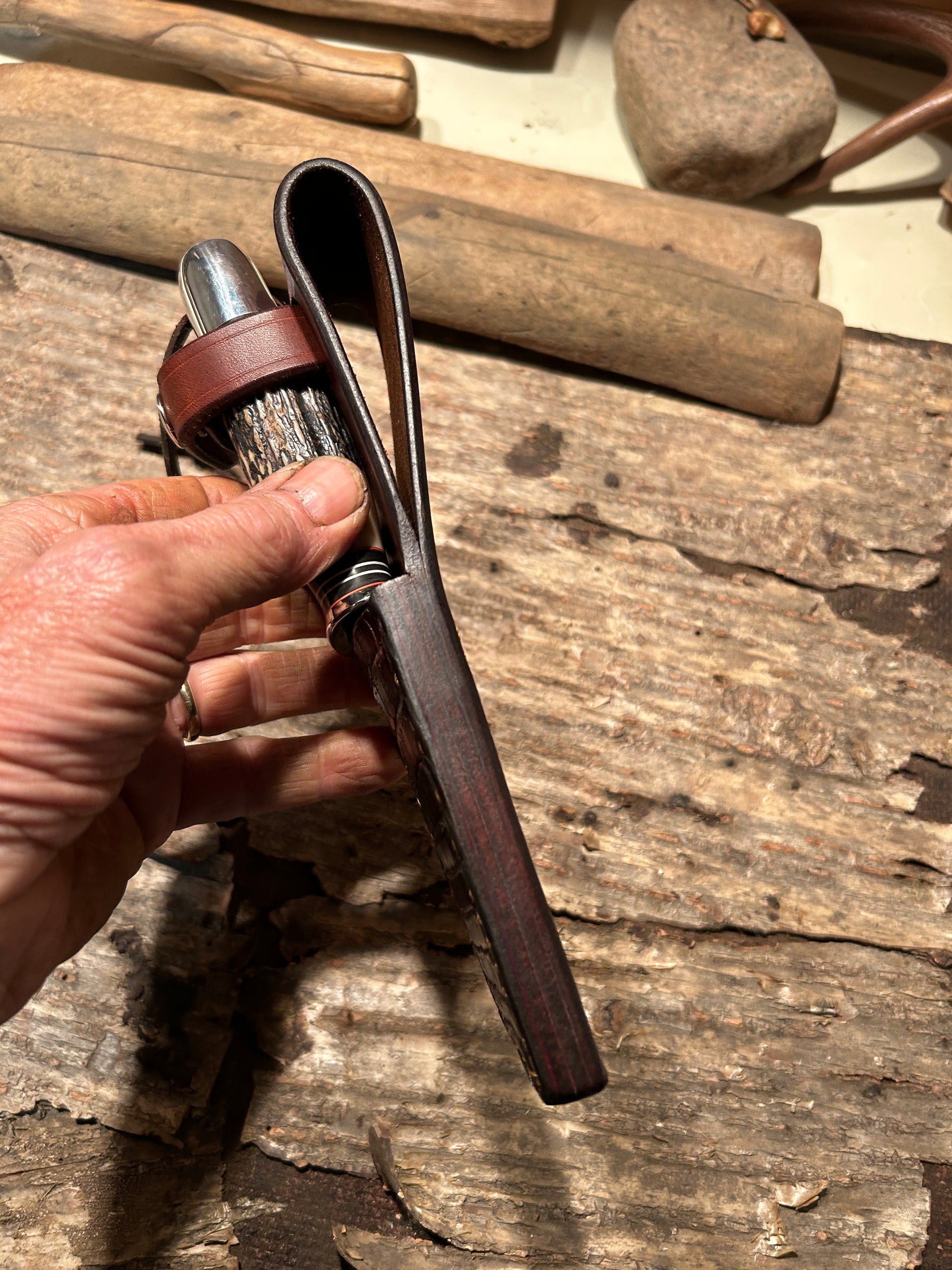 This J. Behring SD Caper has 5 options and a heavy duty 3 5/8" blade made of old school AEB-L stainless. Guard is nickel and silver soldered. Hidden tang handle has a one off spacer arrangement with rock star sambar stag , aluminum crows beak , lanyard hole and an OAL od 8 1/4". Perfect knife for just about any out door adventure. Comes in a real croc belt sheath made to fit. Priced to sell. Thanks, Jim