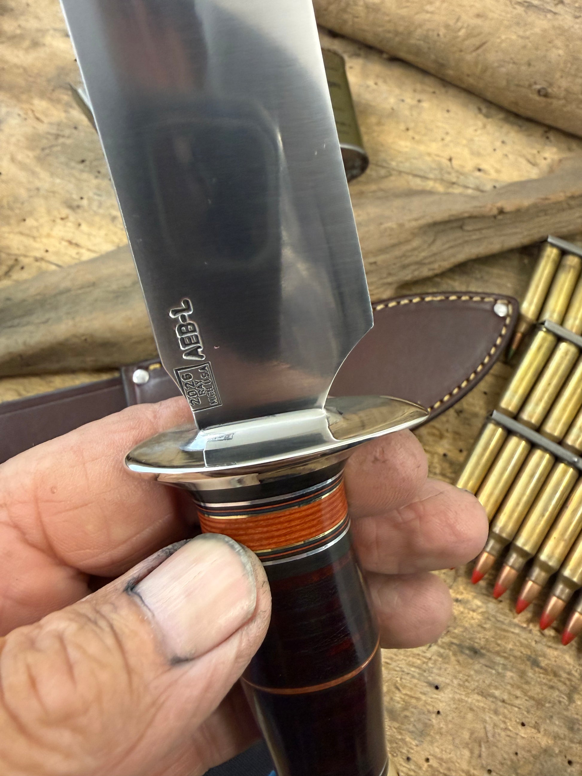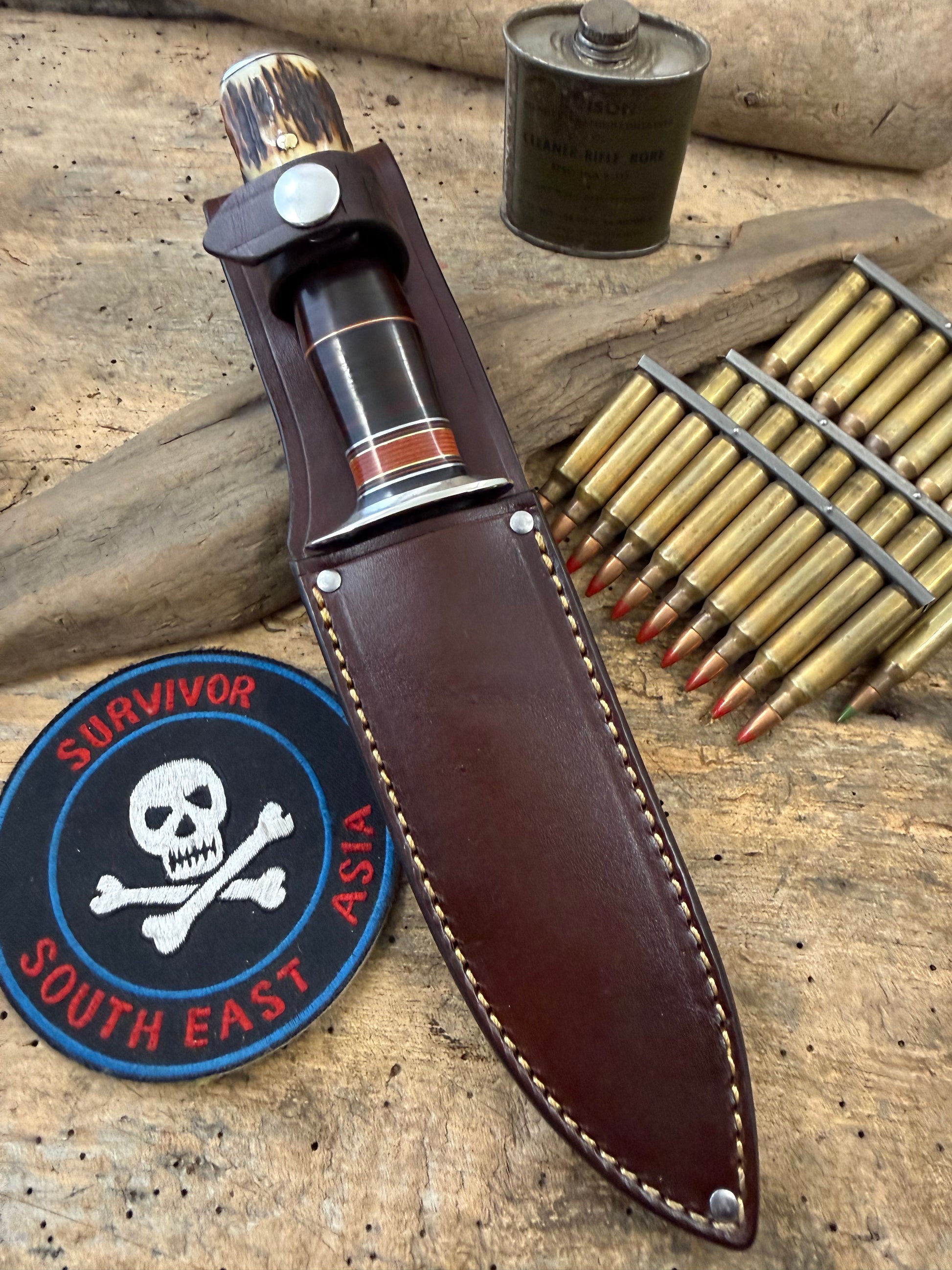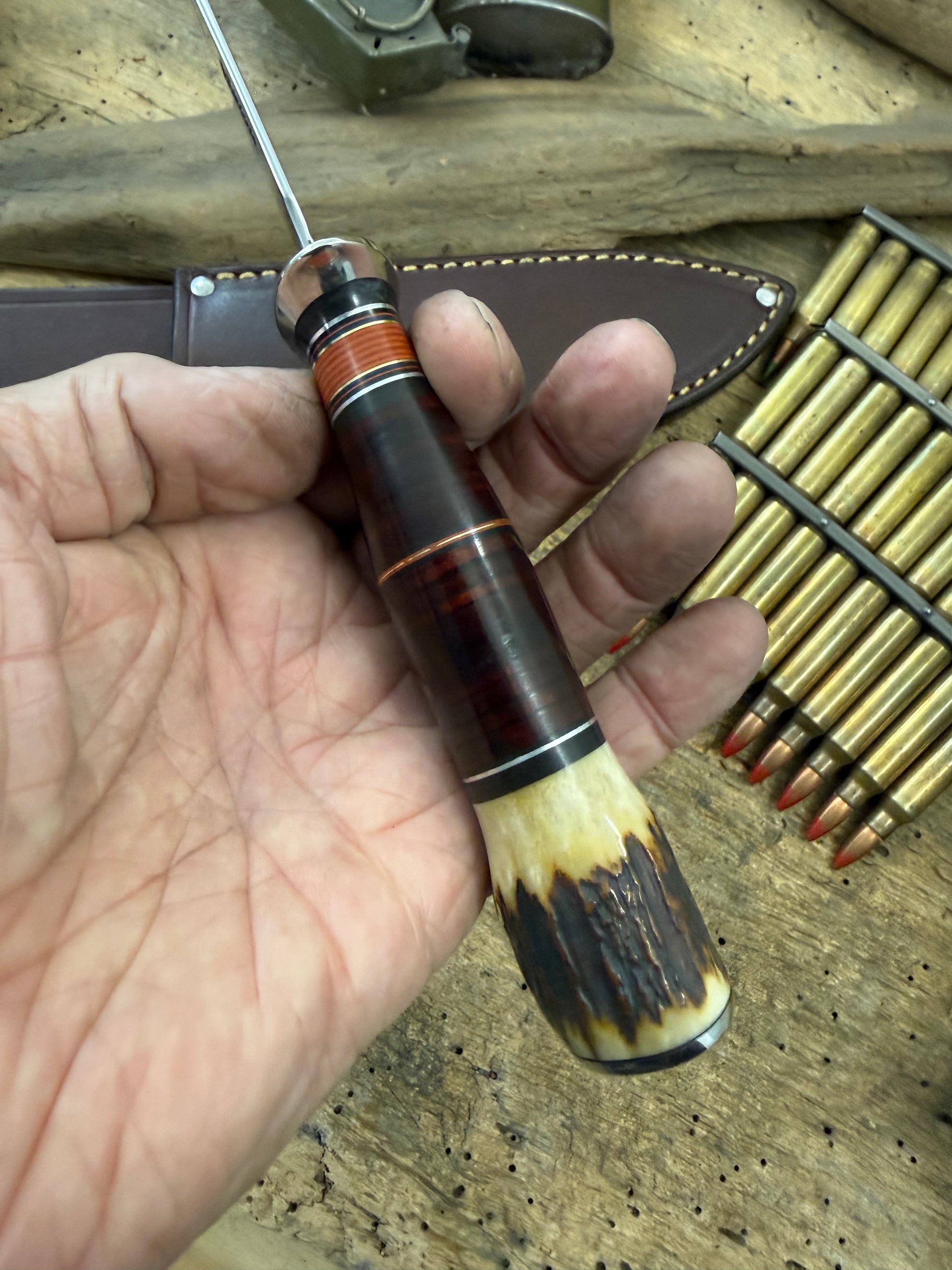 This is a really cool not to big not to small AEB-L Stainless Spear Point razor sharp fighter wit a thick .100 thick super slicer blade. Big Model 1 style choils . Double nickel silver soldered guard. Hidden tang horse hide with a Sambar stag pinned butt with pinned butt cap. OAL is about 10 1/2". Comes with a belt sheath. I can sharpen the top clip if you want ,just have to tell me before I ship. Ready to go. Thanks, Jim
