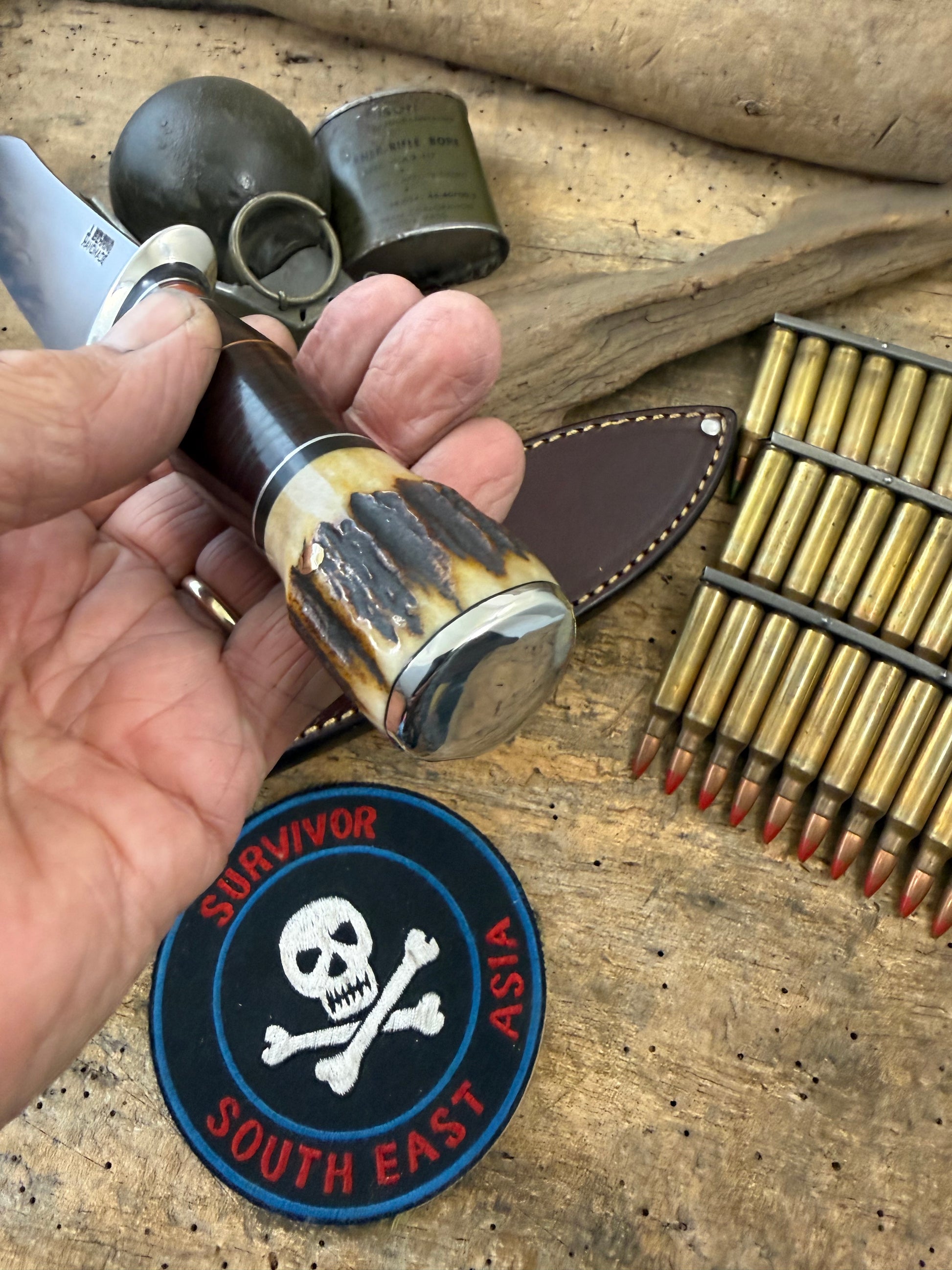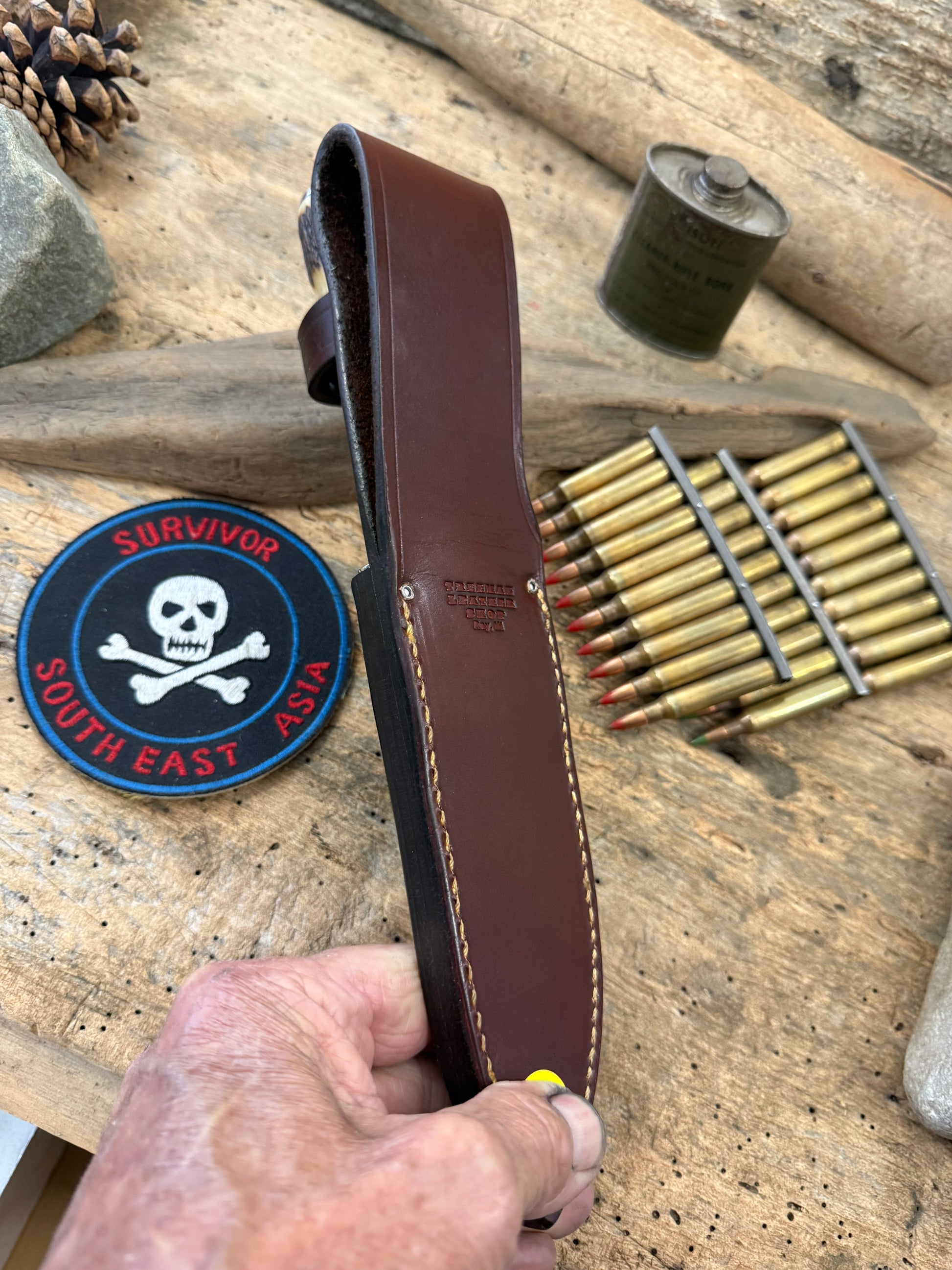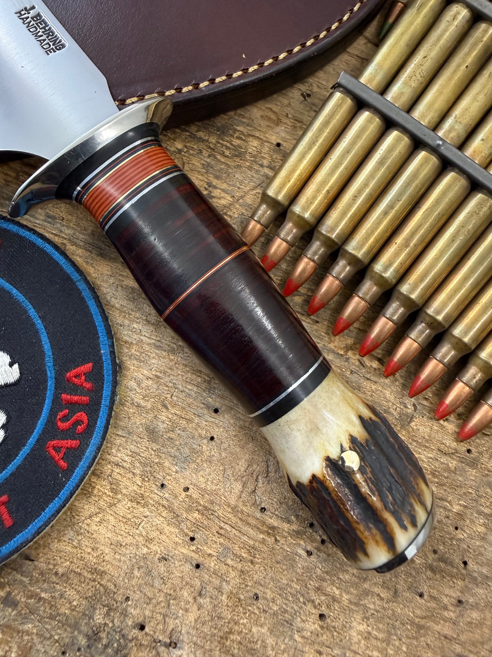This is a really cool not to big not to small AEB-L Stainless Spear Point razor sharp fighter wit a thick .100 thick super slicer blade. Big Model 1 style choils . Double nickel silver soldered guard. Hidden tang horse hide with a Sambar stag pinned butt with pinned butt cap. OAL is about 10 1/2". Comes with a belt sheath. I can sharpen the top clip if you want ,just have to tell me before I ship. Ready to go. Thanks, Jim
