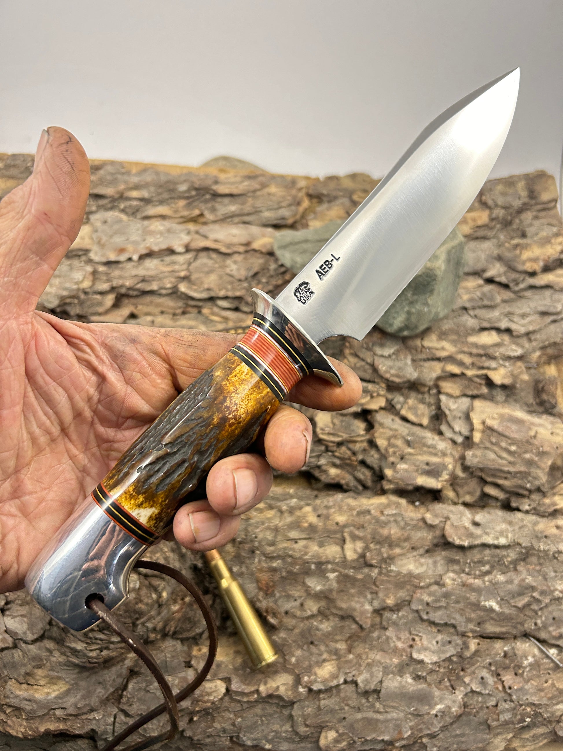 This Treeman Special Hunter is by far one of my favorite patterns . 6" blade made of high quality stainless steel AEB-L is comparable to 52-100 but it will not rust or stain. Sharp as hell with a strong convex grind. Guard is silver soldered nickel silver. Hidden tang handle is Sambar Stag with a one off spacer arrangement with a aluminum crows beak butt . Thong hole for safe keeping wile working over water or deep snow. OAL is about 10 7/8" . Comes in a Giraffe faced riveted belt sheath. READY TO SHIP. Thanks Jim