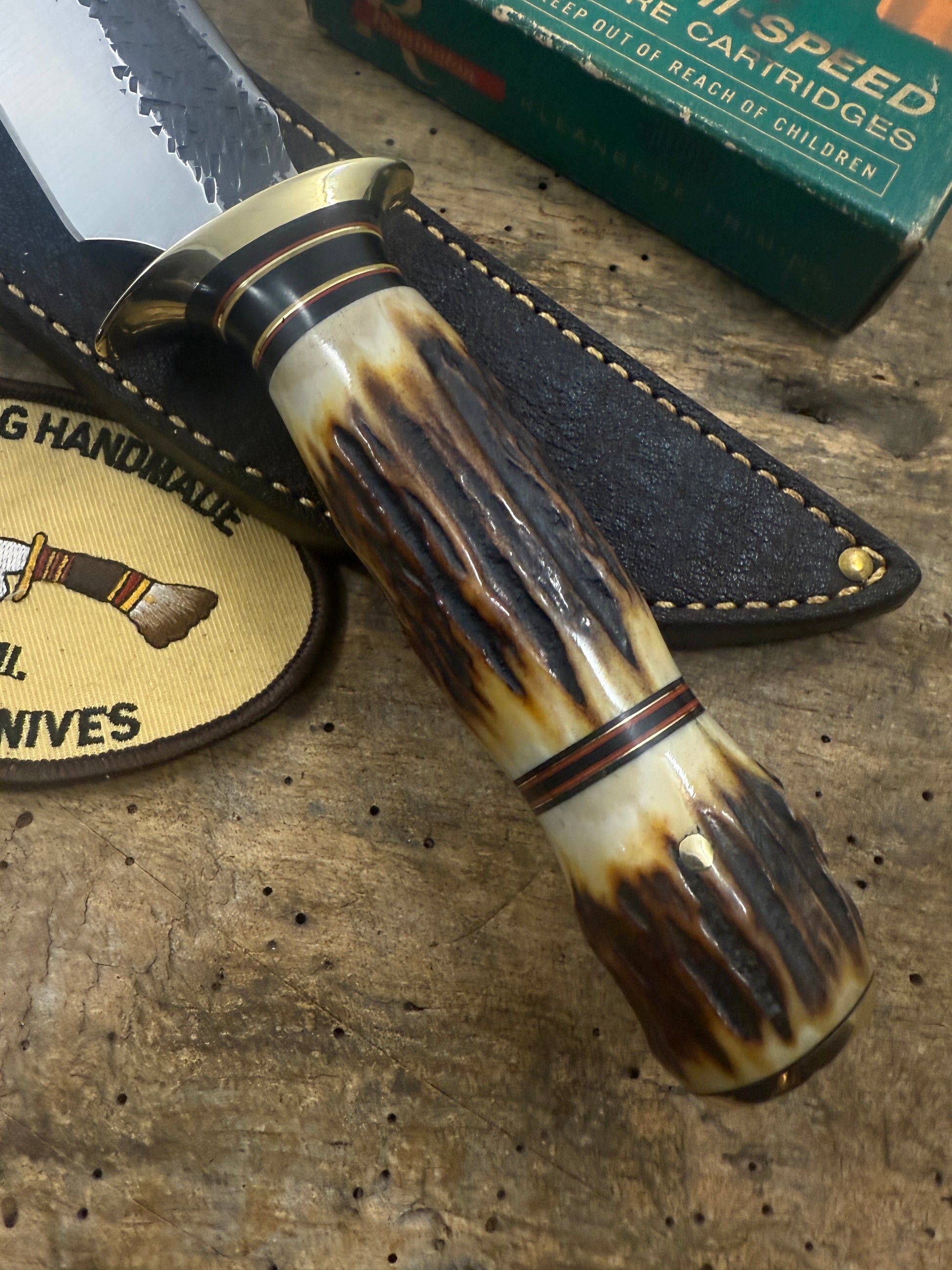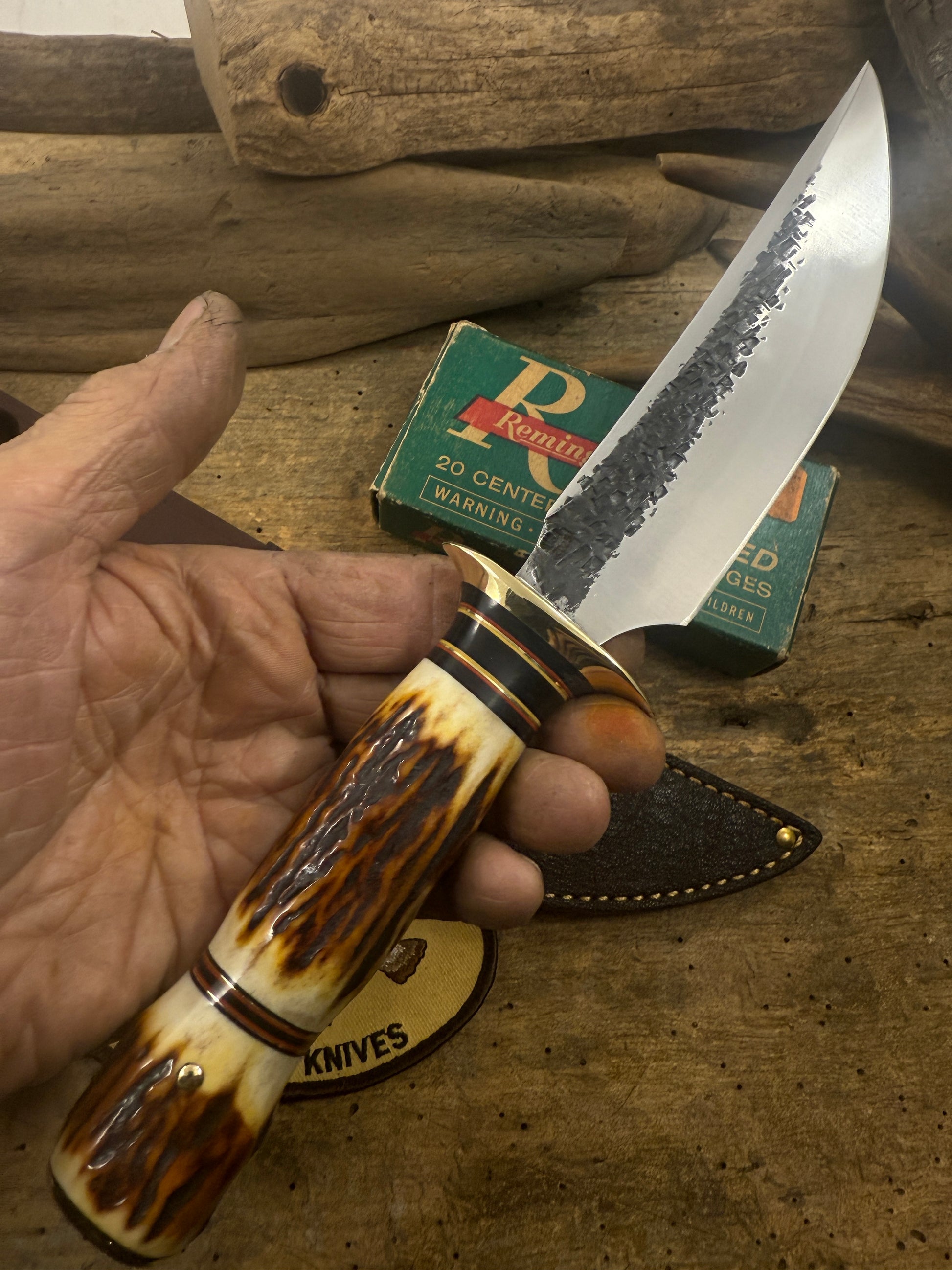 This bad ass double skull hammer mark fighter has a 6 1/2" .250 thick hollow ground blade hand forged from 1095 steel. Silver soldered guard is brass . Hidden tang Stag/Stag handle is as nice as they get . Wonderful red sambar stag and rock solid. Pinned matching stag butt with a pinned brass butt cap. OAL is about 11 1/2" . Knives like this are far and few. Priced to sell. Thanks, Jim
