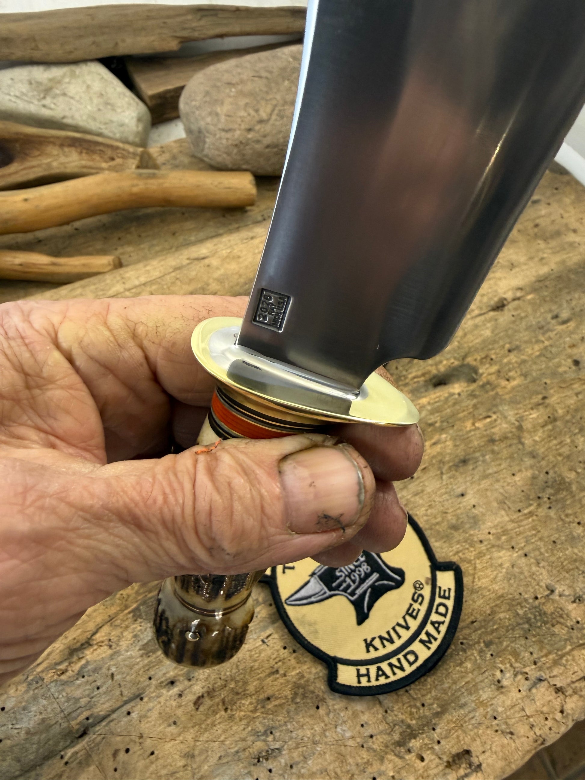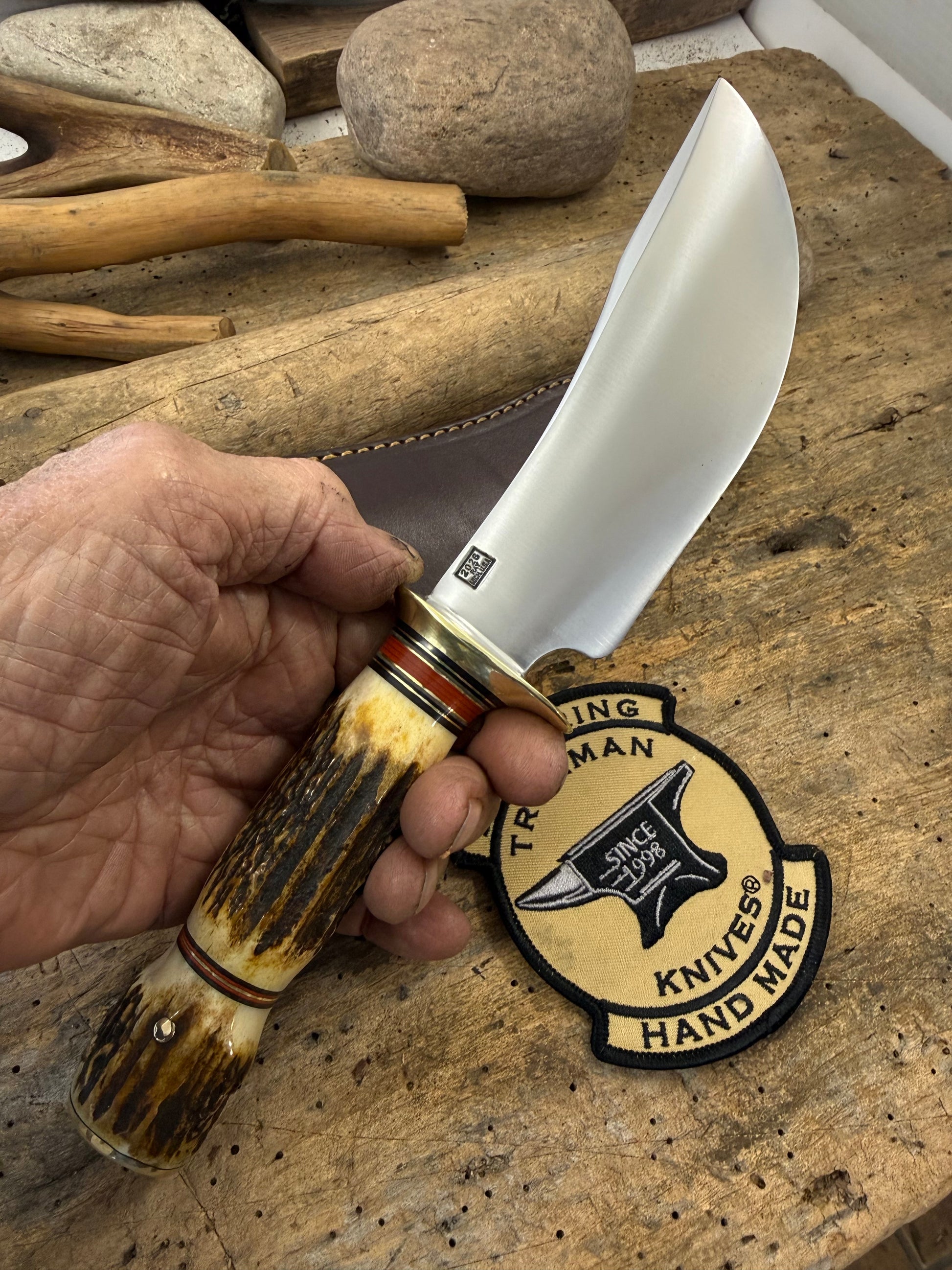 This is one of my favorite classic style hunting knives. This Woodcraft has a heavy duty 6" hand forged 1095 steel convex ground .250 thick blade with the anvil stamp. Guard is silver soldered cartridge quality brass. Hidden tang handle is sambar stag /stag with a pinned butt cap. OAL is about 10 5/8". Sheath is made to fit . Priced to sell and ready to ship. Thanks, Jim