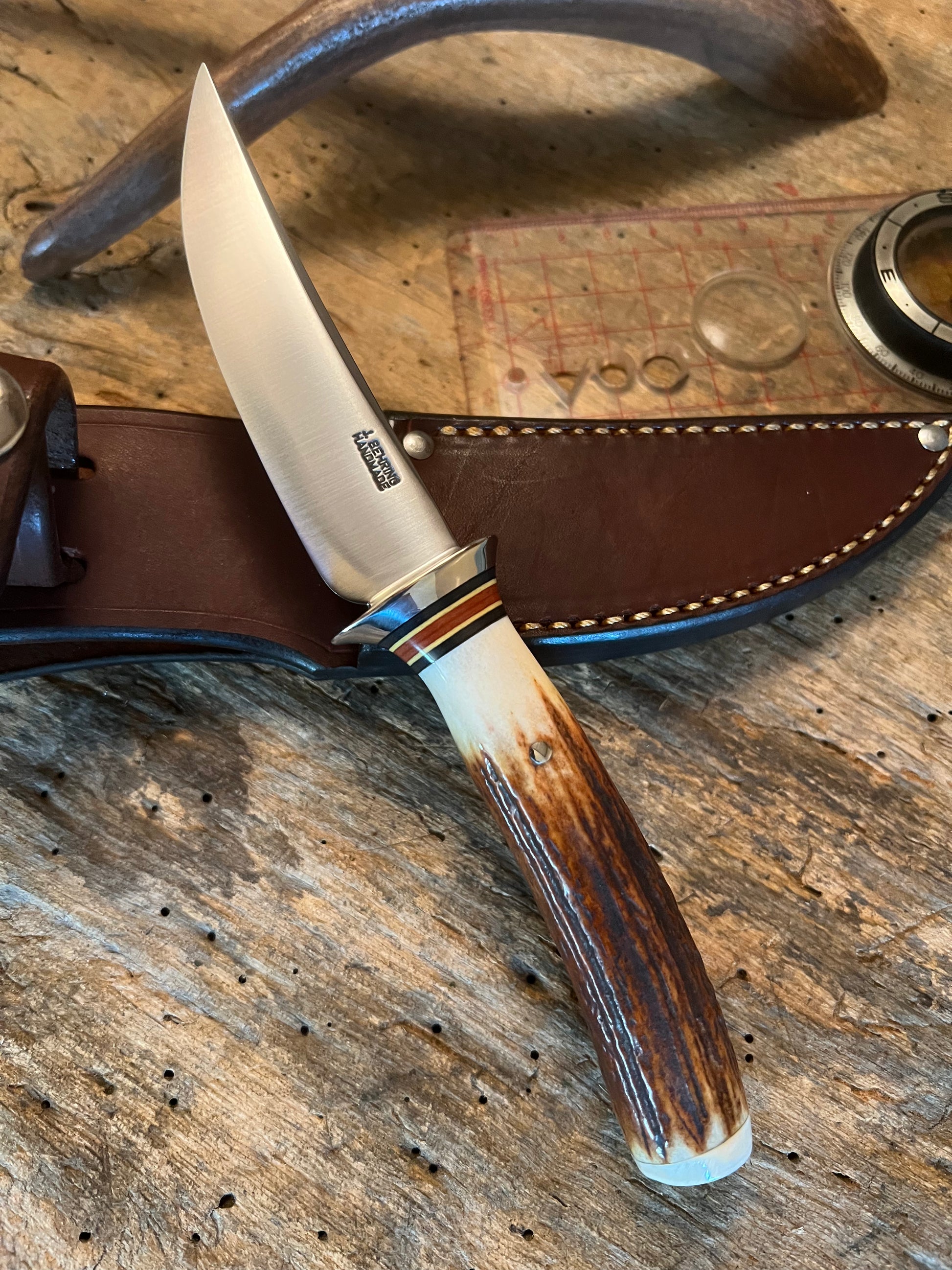 This J. Behring Treeman Trout knife has a 3 1/2" blade made of high carbon steel. Forged by hand down to a perfect .090 thick for a sleek sharp all around wonderful little knife you can take anywhere with you and you wont scare the liberals. Guard is silver soldered nickel. Hidden tang runs 3" into the genuine red sambar stag handle. I pinned it for durability and added a hippo tooth ivory butt cap. OAL is about 71/2". Its a real gem and I know who ever ends up with this knife will be very happy. Sheath is made to fit as always and is 8oz top shelf leather. Great little knife at a nice little price. Thanks, Jim