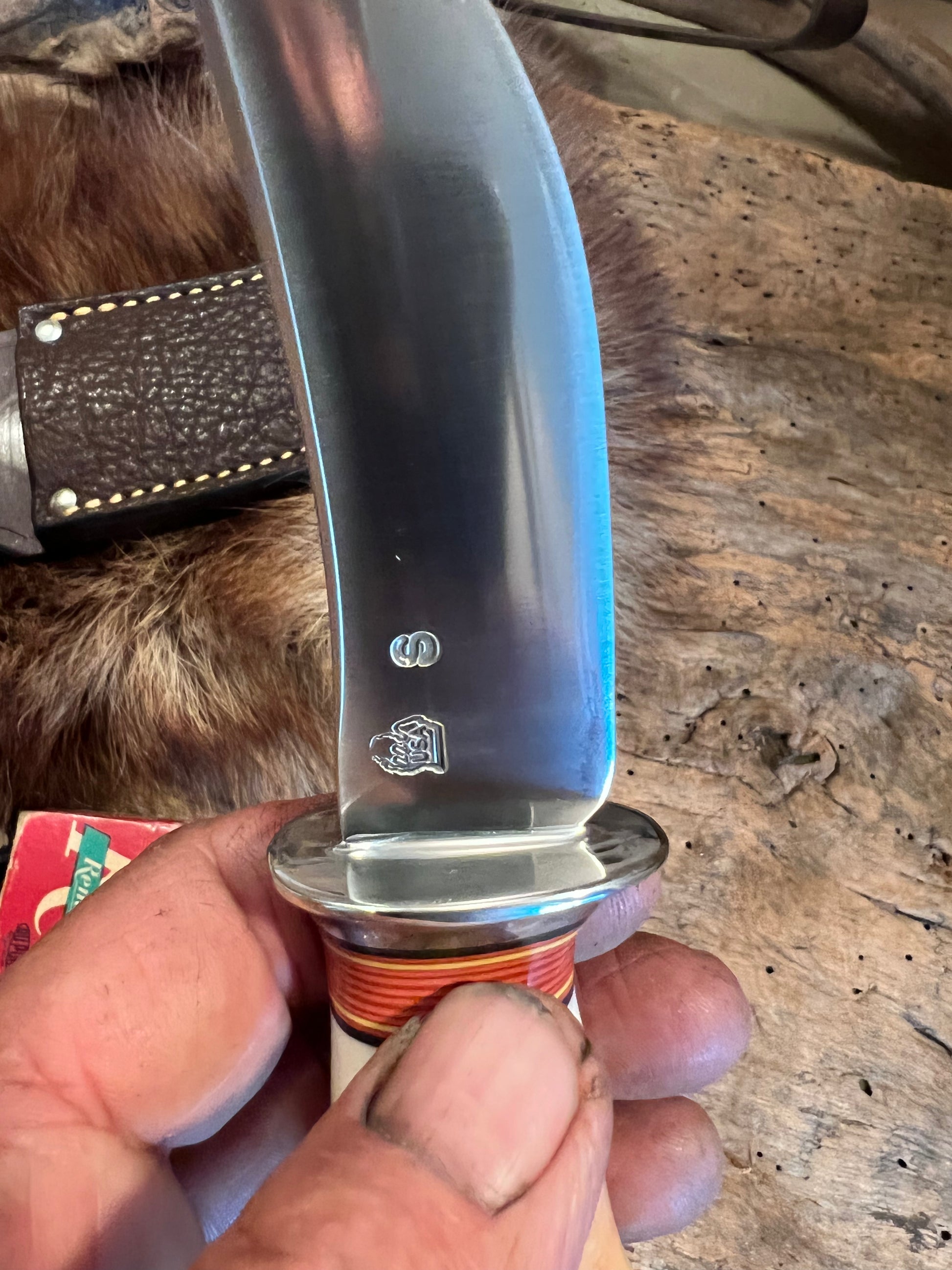 This is a really hard to find Treeman. I have made a handful over the past 23 years. This 3 3/4" blade is made for old school AEB_L stainless steel. They say is equal to 52-100 ball bearing steel that doesn't rust when you look at it. This is Cyro tempered Tough steel and sharp as hell. This blade is about .90 thick so its a real fast cutter and very strong. Stamps are deep and clear. Big S for stainless. Silver soldered guard is nickel. Hidden tang and a pinned stabilized wart hog ivory tusk that fits the hand very well. Comes in a elephant ear and 9 oz leather belt sheath. Priced to sell. Thanks, Jim