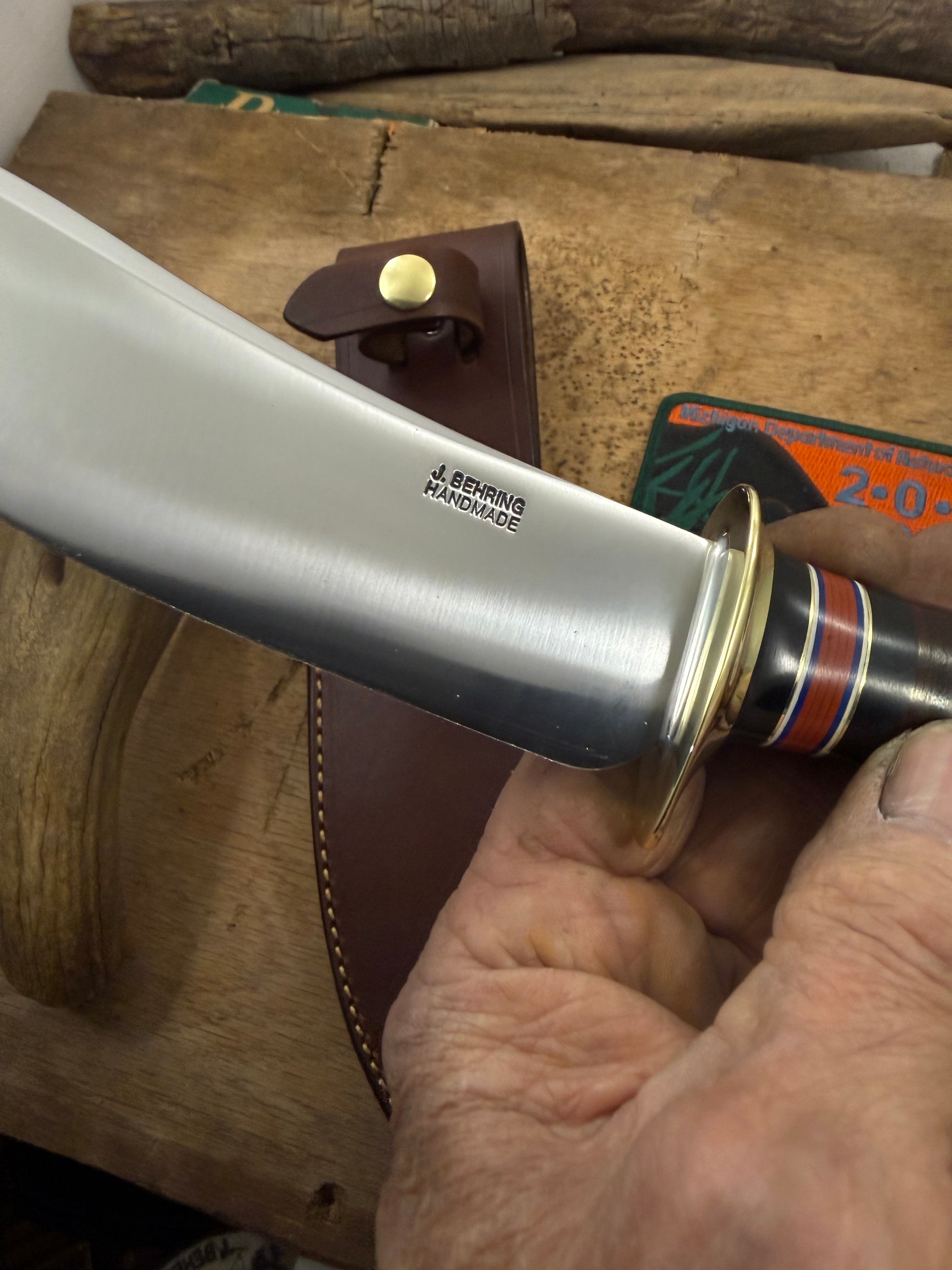 This old school woodcraft style 6" hunter has a convex ground hand forged blade made from 1095 steel. Blade is about .200 thick. Silver soldered brass guard. Hidden tang horse hide with pinned crown stag bitt. Very old Wisconsin white tail crown. OAL is about 10 3/4". Comes in a made to fit belt sheath. Priced to sell. Ready to ship. Last knife of 2025. Thanks, Jim
