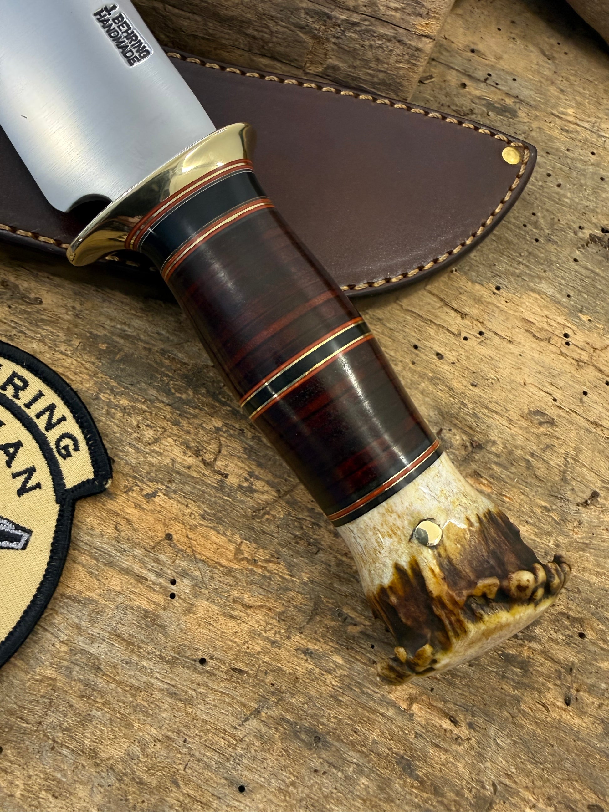 This J. Behring Handmade 5 1/2" Woodmonk has a hand forged .250 thick convex ground blade made of 1095 steel. Nice deep stamps . Silver soldered cartridge quality brass guard. Stacked hand cut horse hide with some red, black and brass spacers. Pinned crown stag butt. OAL is about 10 1/2". Comes in a high quality made to fit belt sheath. Thanks, Jim