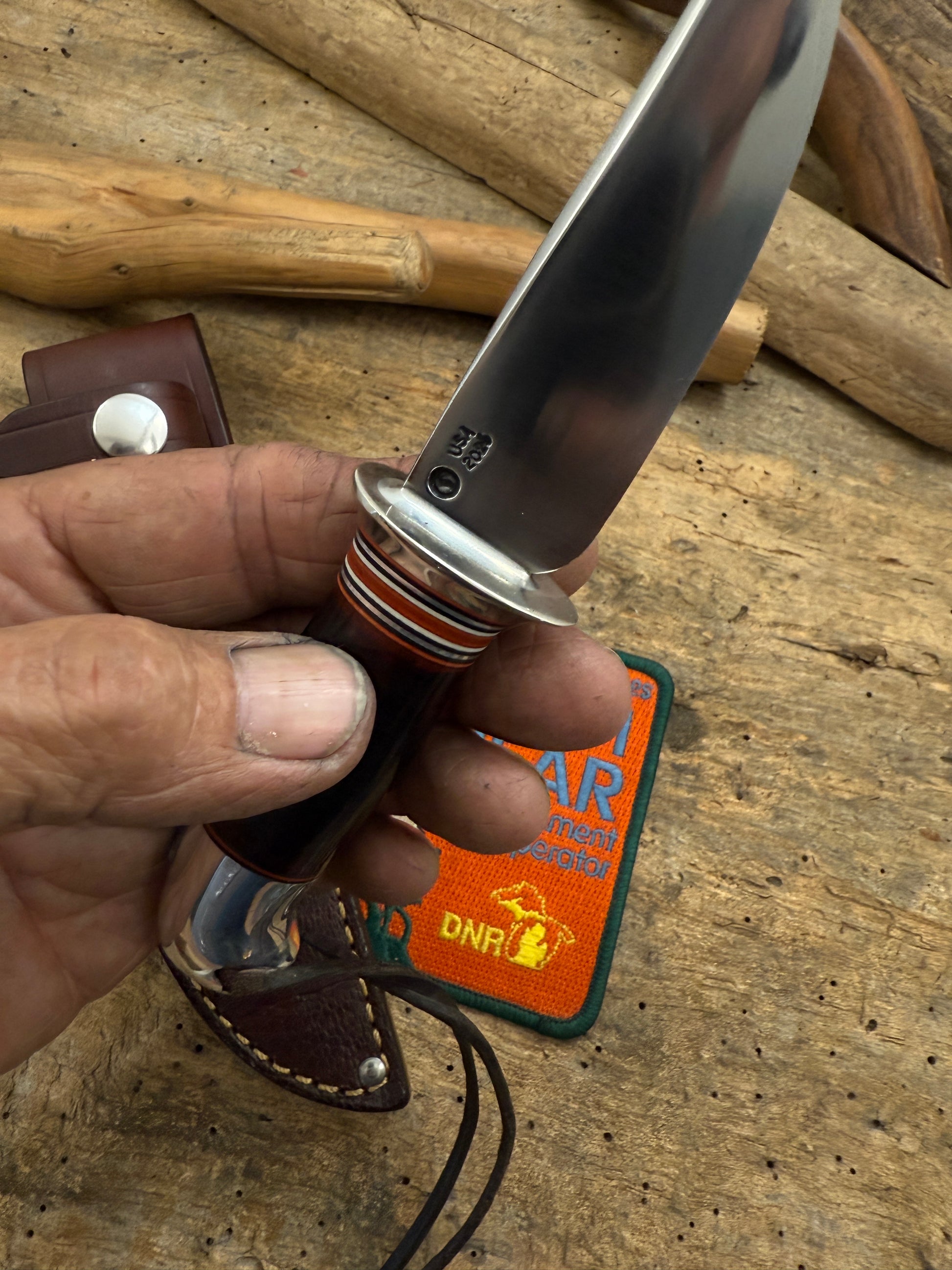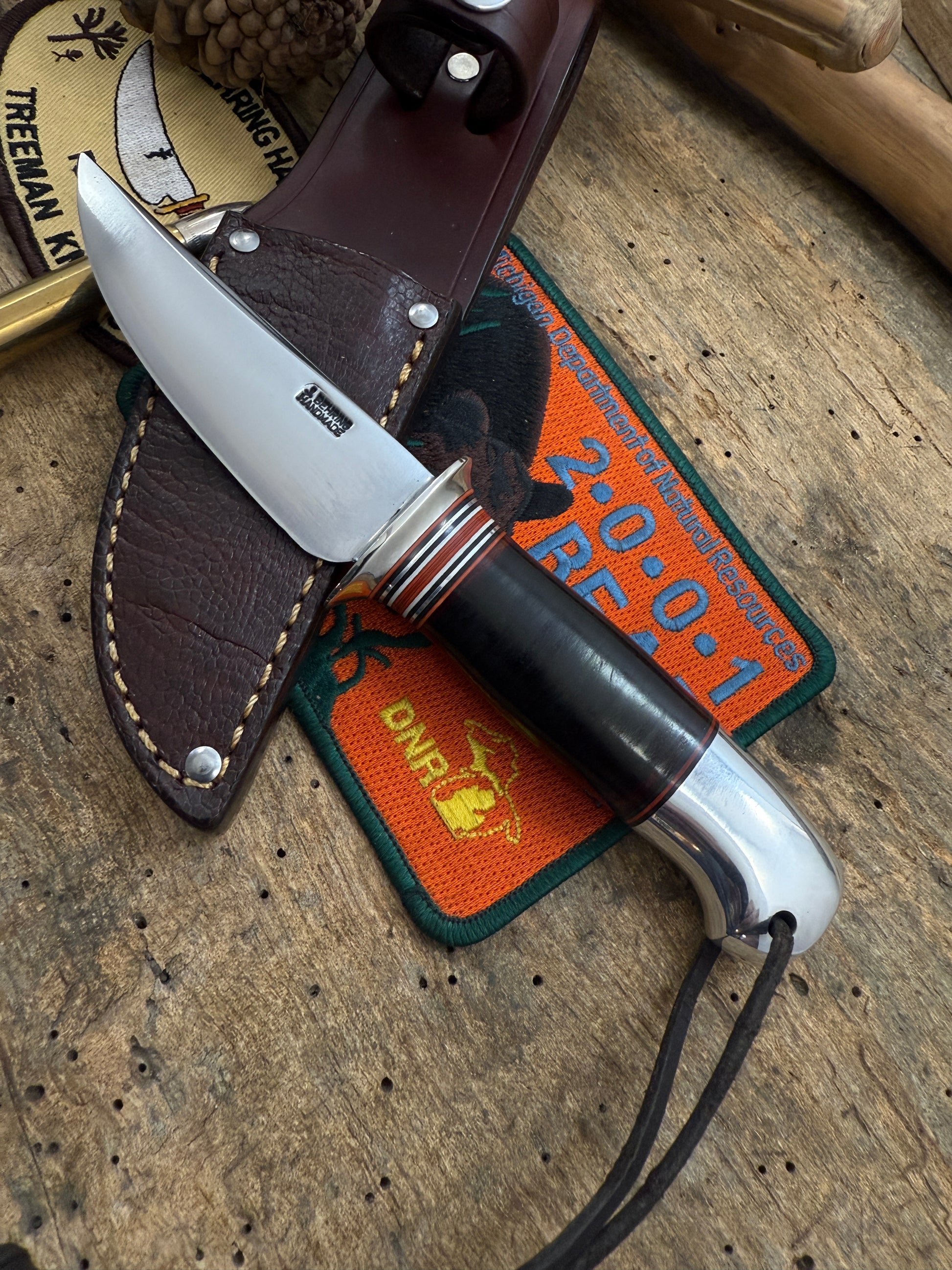 This is a real bad ass little trout knife . Blade is stude spring. Guard is nickel. HT handle is HH. Butt is aluminum crows beak with thong hole. OAL is about 7 1/8". Sheath has an ostrich front and belt loop. Thanks, Jim TMK
