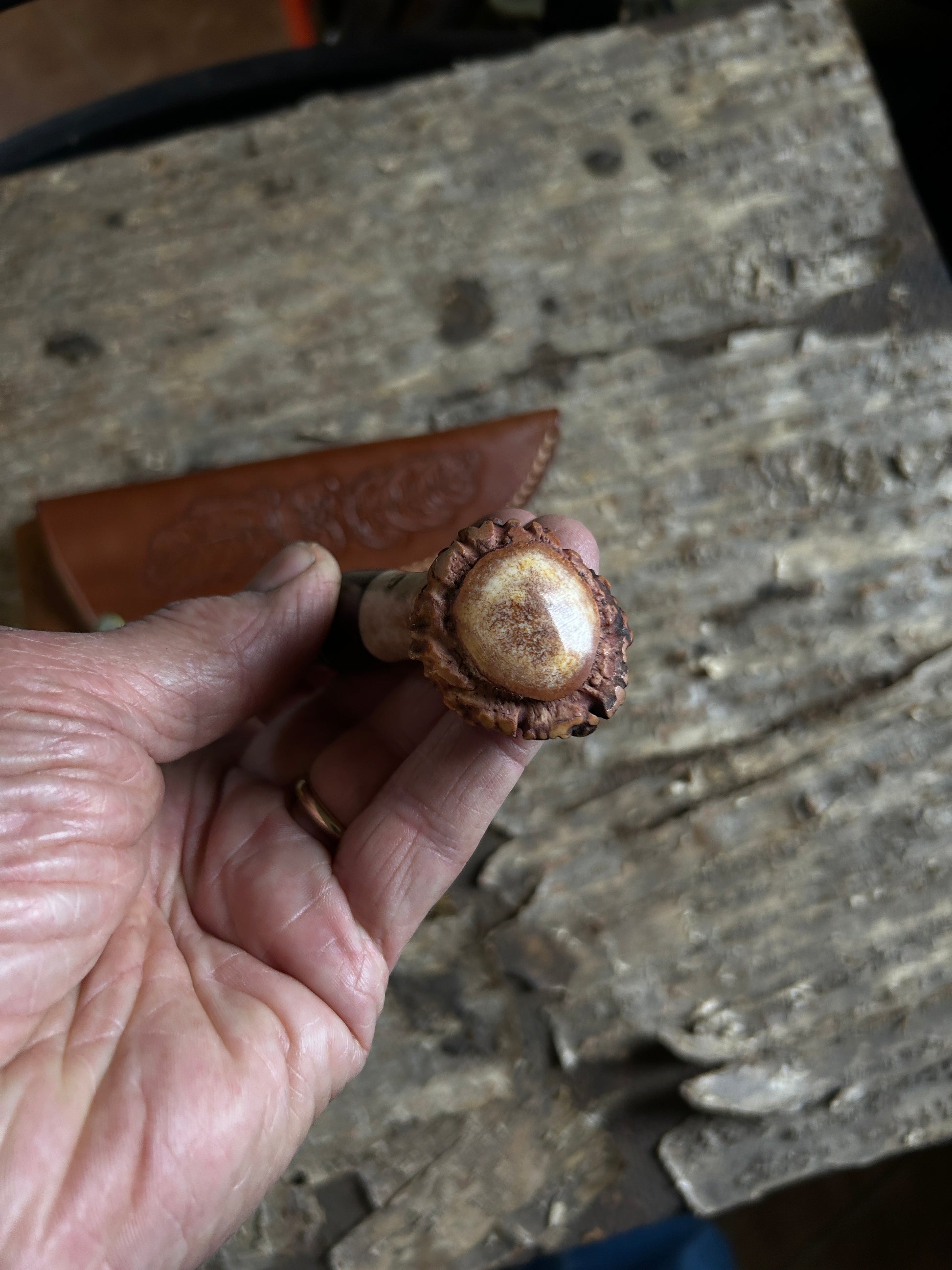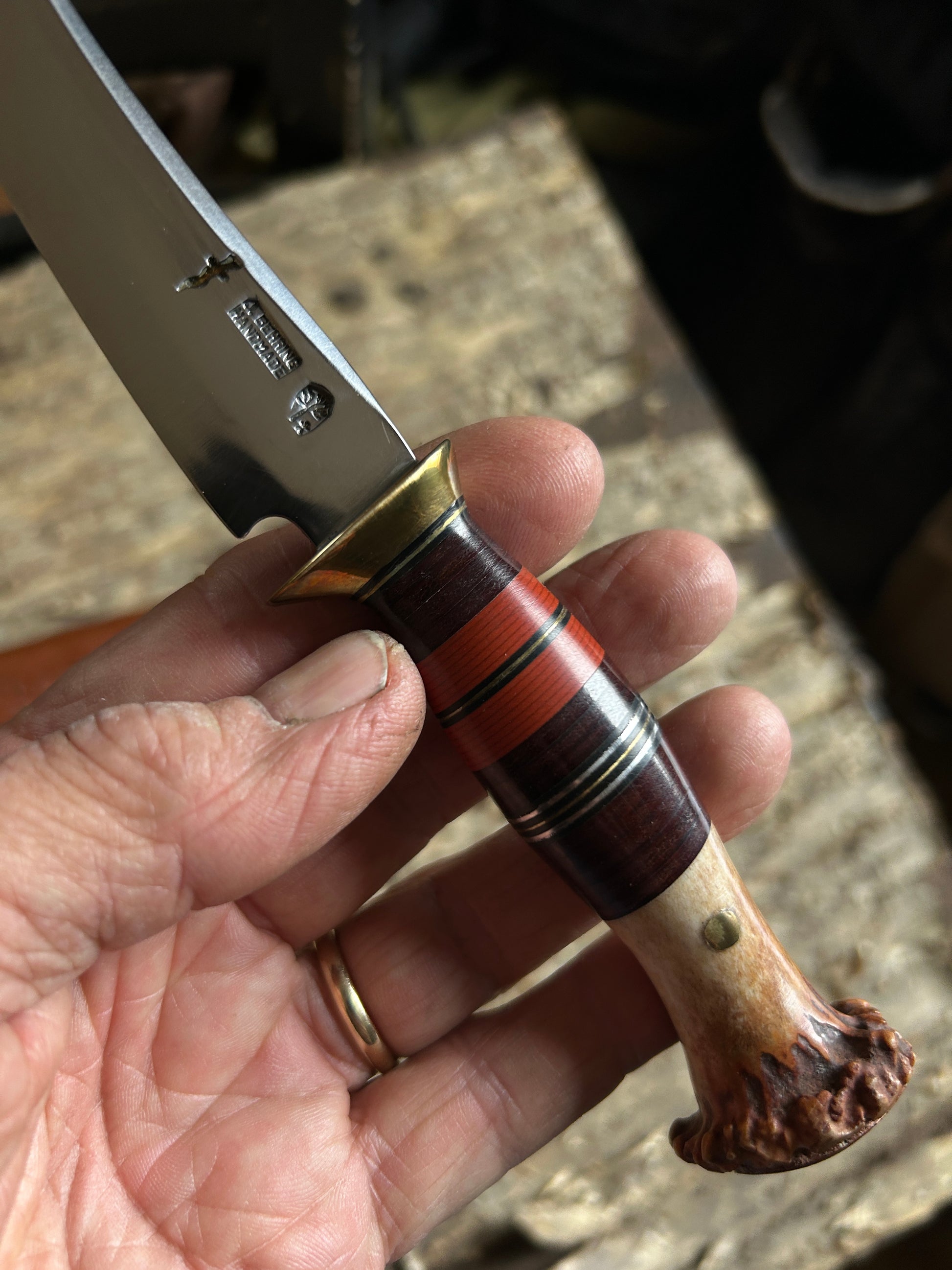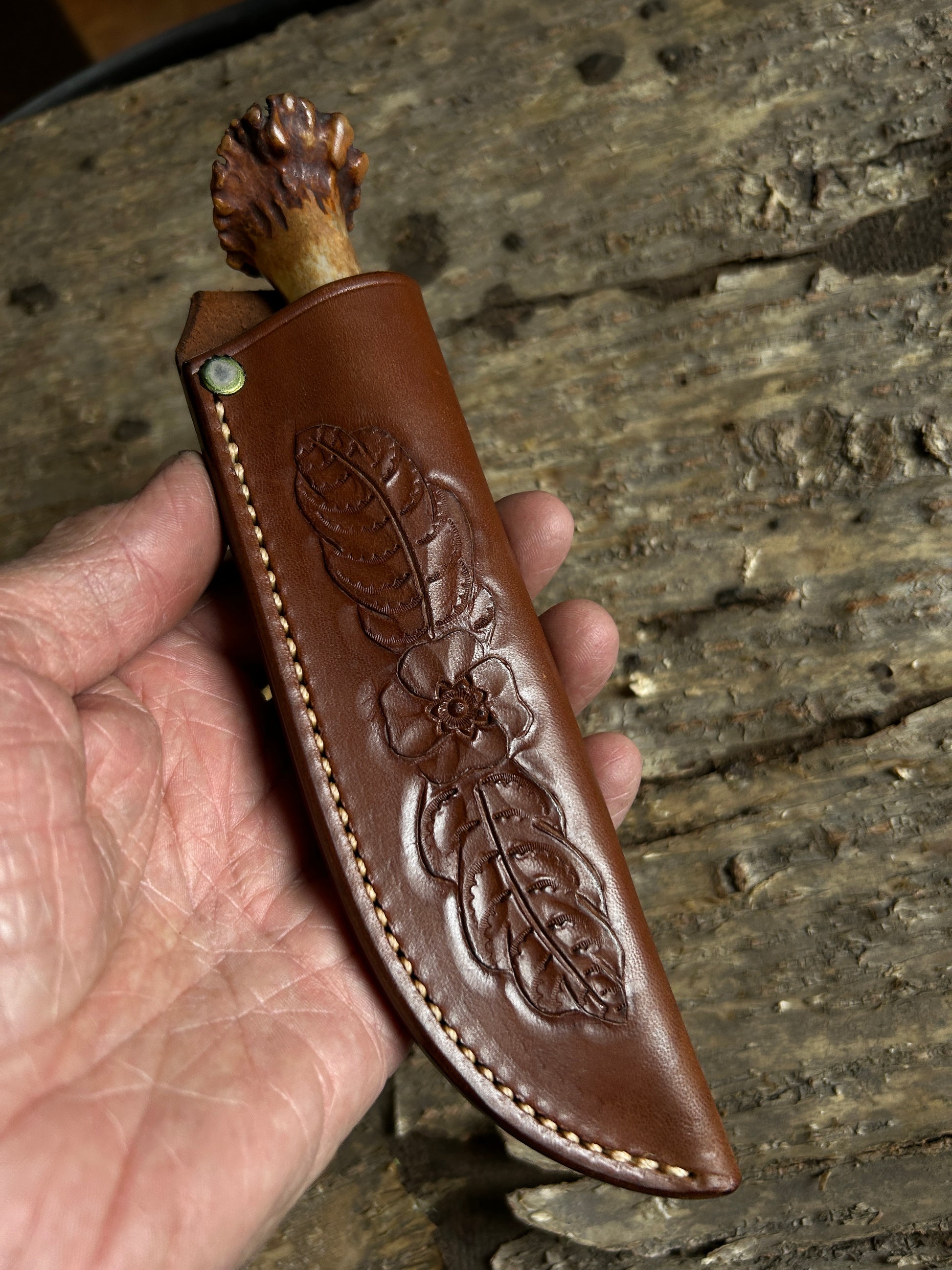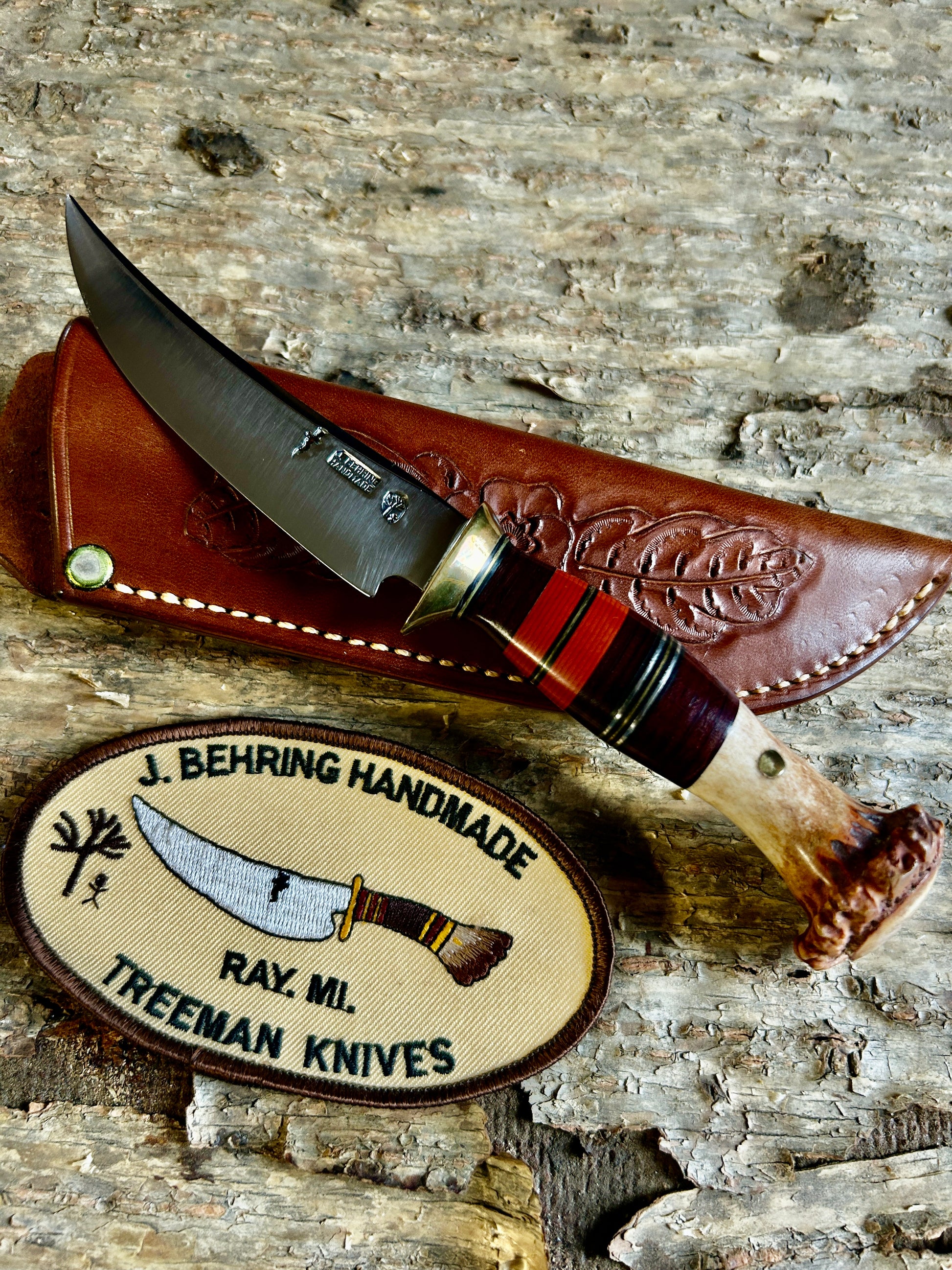 This Vintage Treeman Trout & Bird has a 4" hand forged O1 blade with a convex grind. Old Treeman stamp with USA on the back side so made around 2004 vintage. Swelled handle of horse hide with a old school spacer pattern. Silver soldered brass guard . Whitetail crown stag . OAL about 8". Comes with a floral horse hide pouch sheath. Great little knife and about 20 years old. Thanks, Jim